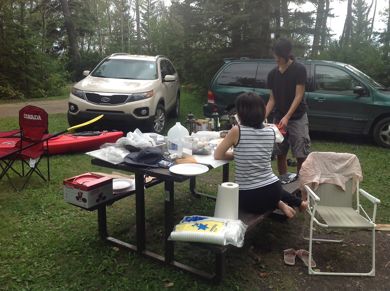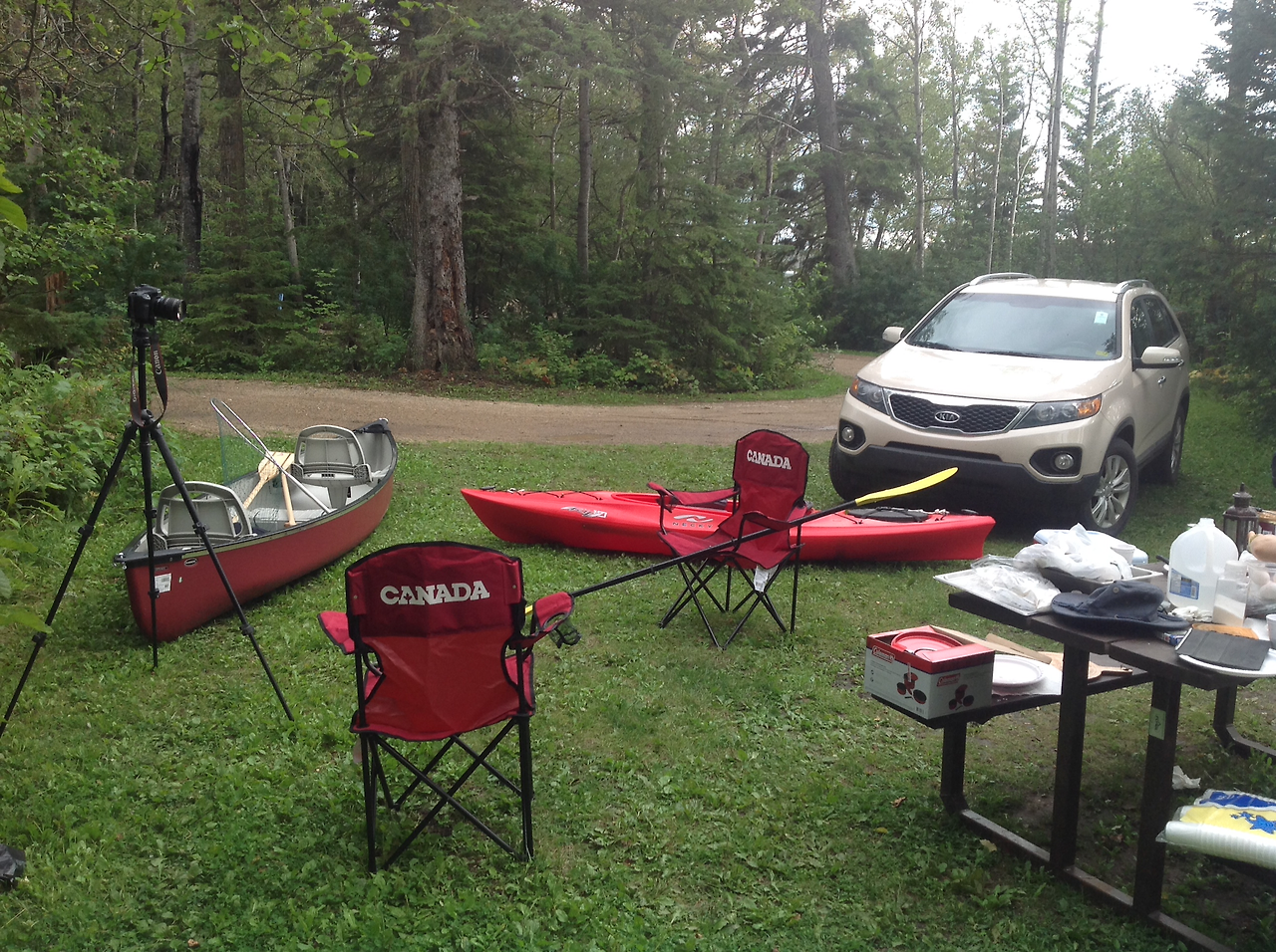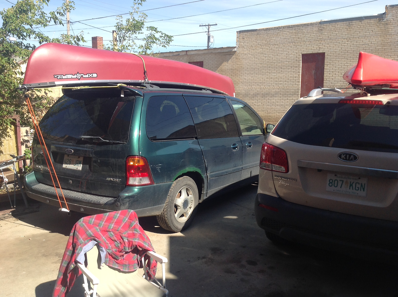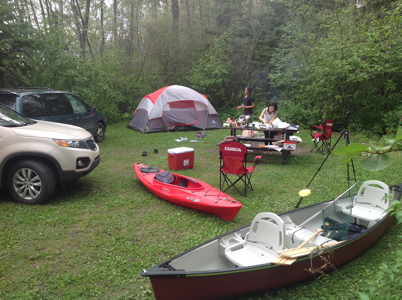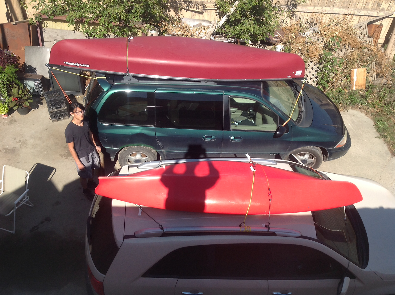 캠핑 당일 아침 우리 부자는 서둘러 카누와 카약을 차 지붕에 얹었다. 카약도 무겁지만 삼인승 카누는 장정 두사람이 차 지붕까지 올리기가 만만치 않았다.