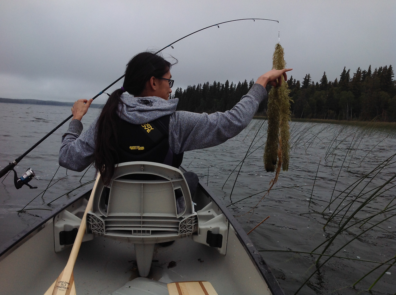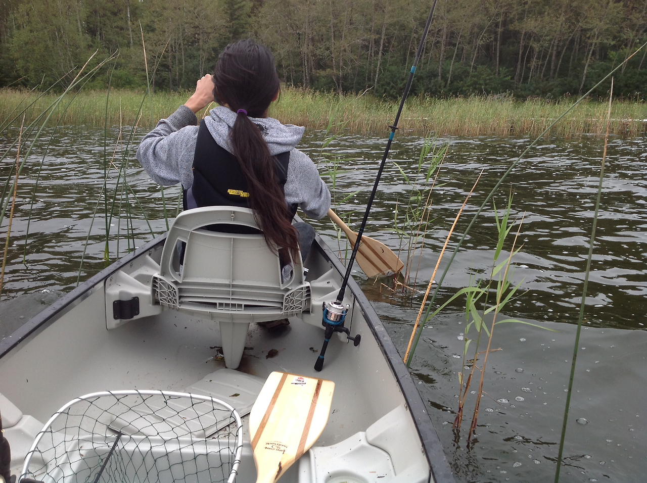대어를 낚았을 경우를 대비 고기 뜰채도 대형으로 준비했건만 한마리도 낚질 못했다. 루어의 종류가 잘못 되었거나 고기가 많이 모여 있는 spot 을 제대로 알지 못해 그럴 것이다. 어쨓든 고기를 낚든 못낚든 아들과 난 이 아름다운 호수에서 카누잉의 유유 자적함을 충분히 즐겼다.