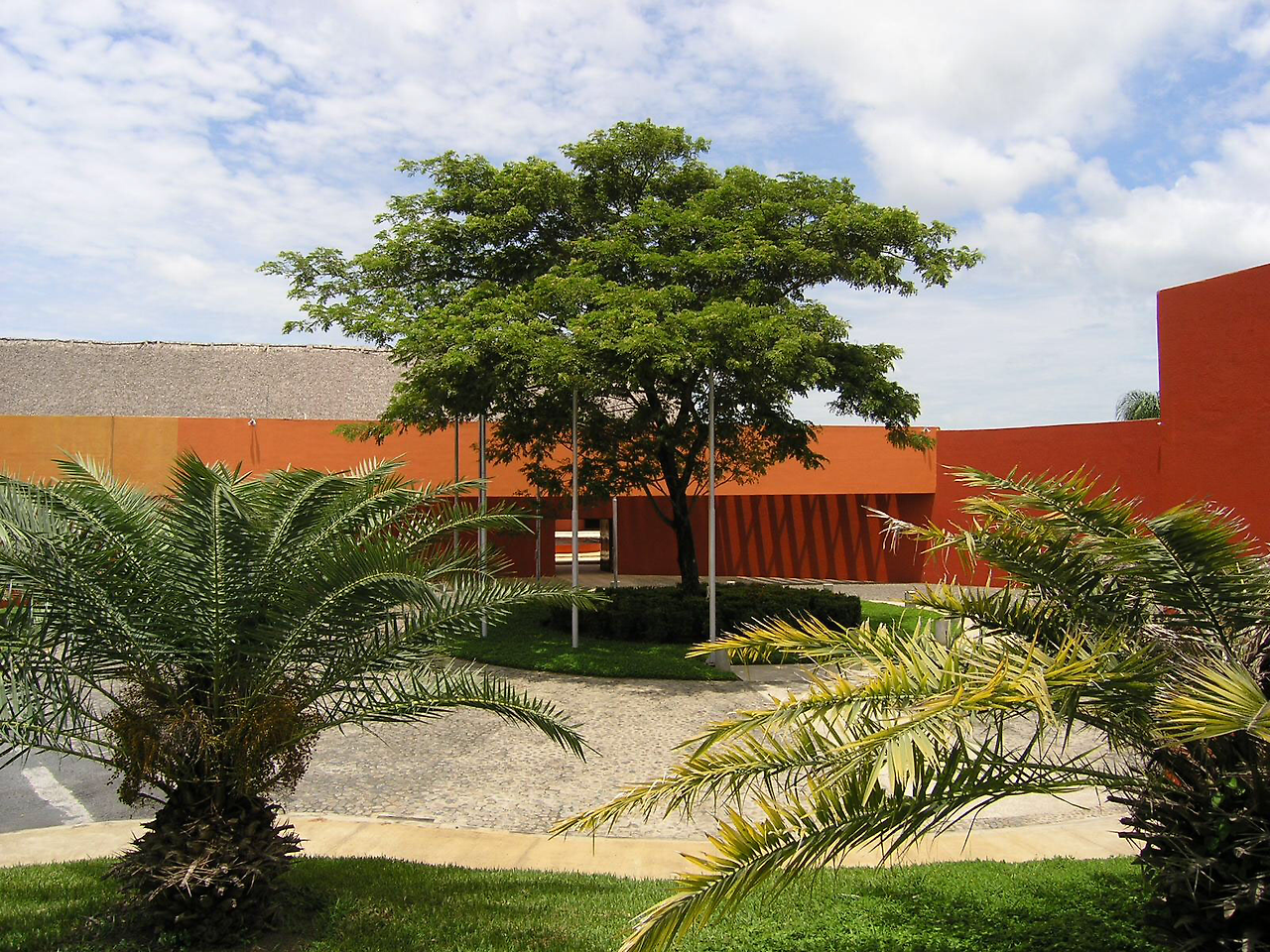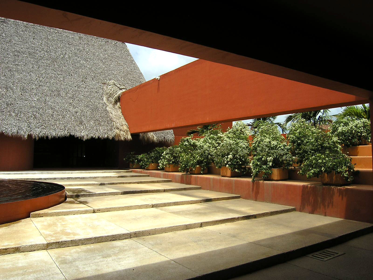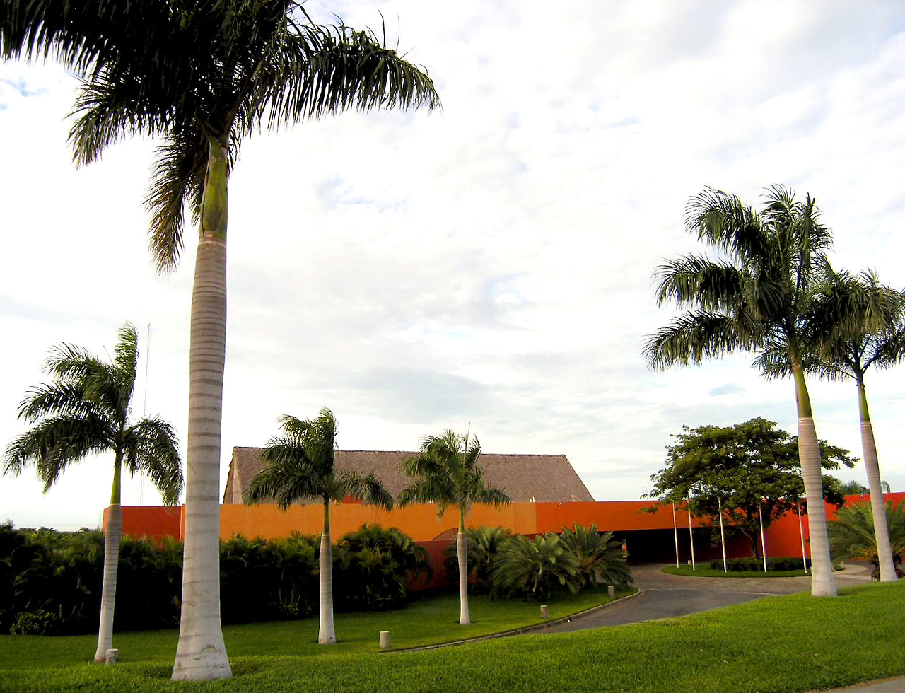 네하파 컨트리 클럽의 마지막 홀에서 바라본 클럽 하우스. 스페인 출신 건축가가 설계한듯한 직선 기하학적 구조와 색상이 가히 남달랐다. vertical palm trees 와 그 부채살 잎새들을 어울리게 한 건축가의 솜씨라니.