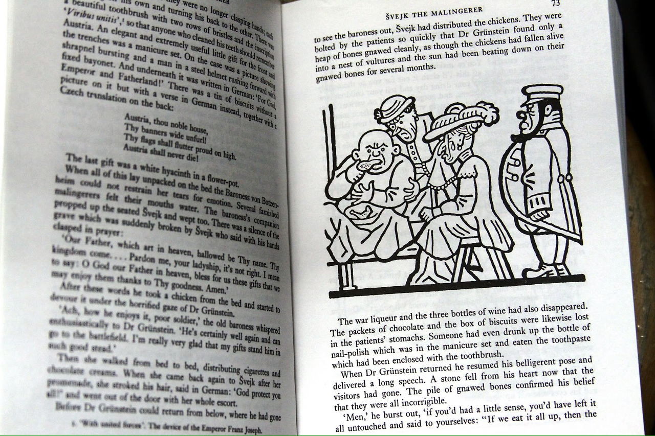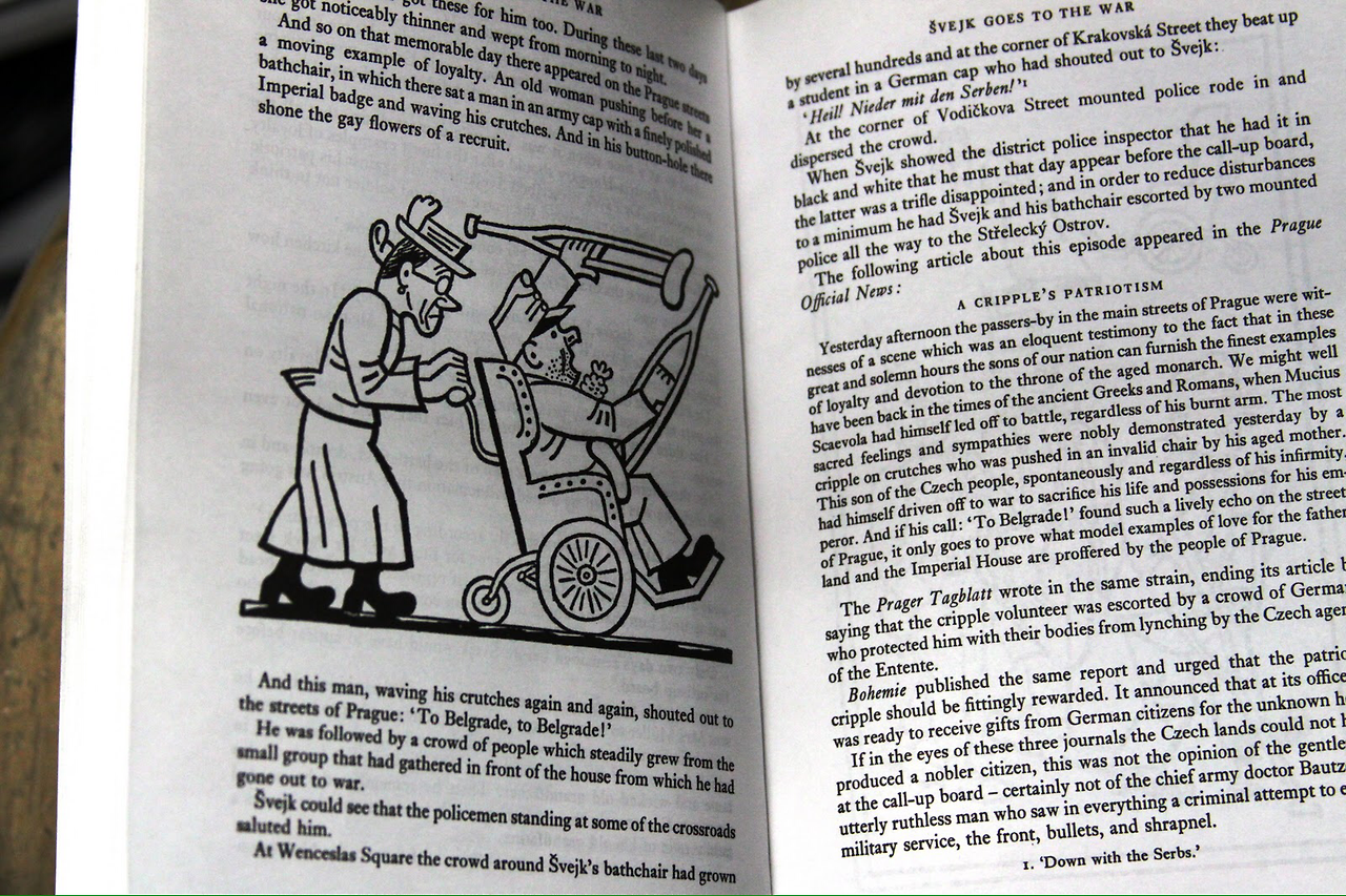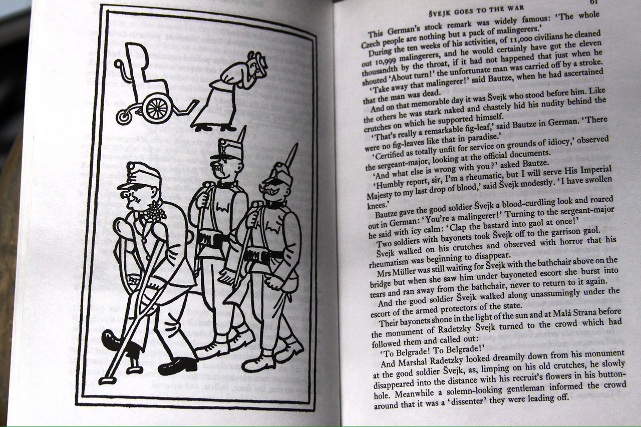 체코 작가 야로스라브 하셱의 1923년 미완성 유고작인 유쾌한 병사 슈베이크는 자그마치 천사백만 명의 전사자를 낸 일차 세계대전이 발발하면서 벌어지는 이야기들을 슈베이크라는 지극히 선량하지만 지능이 많이 모자라게 묘사되는 한 시민을 통해 에피소드 형태로 그리고 있다. 당시 제국주의 하에서 전쟁이 벌어지면서 일어나는 군, 경찰, 법원, 군 의료진 및 비밀경찰 등 권력 기관들과 그 하수기관들이 벌이는 기상천외한 사회통제 방식과 부패상이 적나라하게 묘사된다. 군 의료진에게서 제대로 '인증받은 멍청이' (certified idiot)인 개장수 슈베이크가 곡절 끝에 병사로 다시 군에 입대에 전쟁에 참여하게 되면서 벌어지는 이야기들은 한편으로 웃음을 참을 수 없게 킬킬거리게 만들지만, 다른 한편으로는 그러한 상황이 내게 닥친다면 난 어떻게 처신하게 될까 자문하게도 되고, 슈베이크의 지극한 고지식함에 아련한 마음이 생기기도 한다.