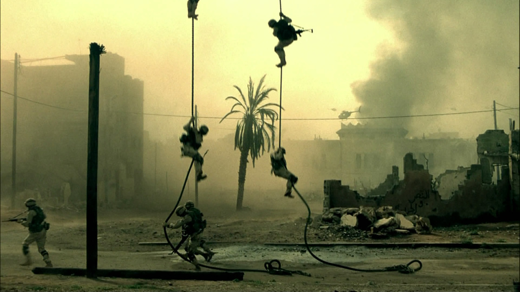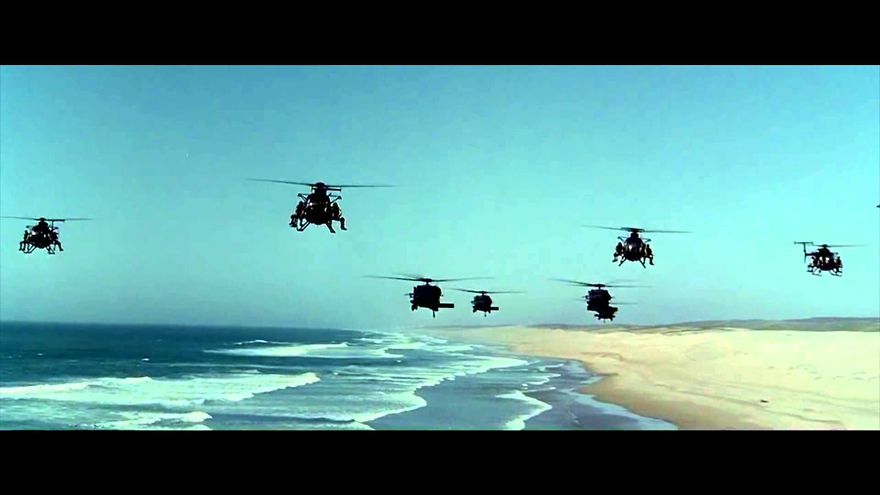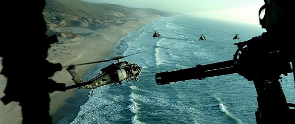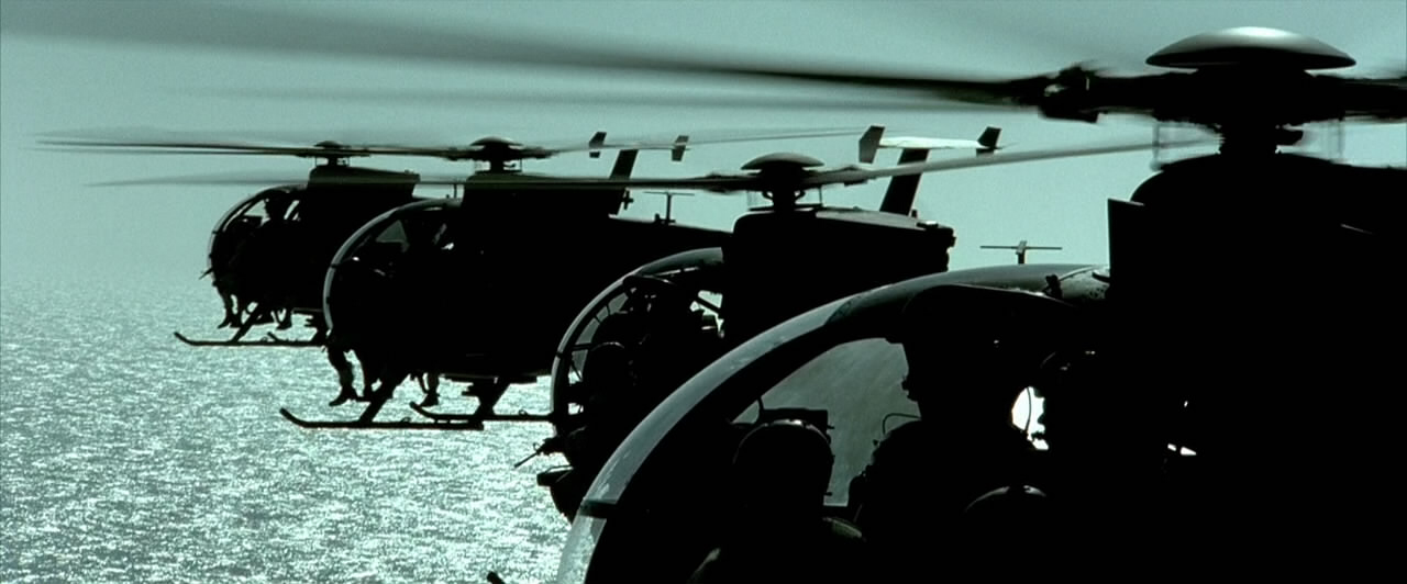 소말리아 내전에서의 미군 개입에 따른 전투 실화를 바탕으로 한 블랙 호크 다운 역시 헬리콥터 출동 장면은 압권이다. 아름다운 소말리아 해변을 따라 출동하는 특공대원들의 헬기들 아래 건강한 아프리카 멧돼지들이 놀라 질주라는 모습은 또 다른 아이러니한 영상미학이기도 했다.