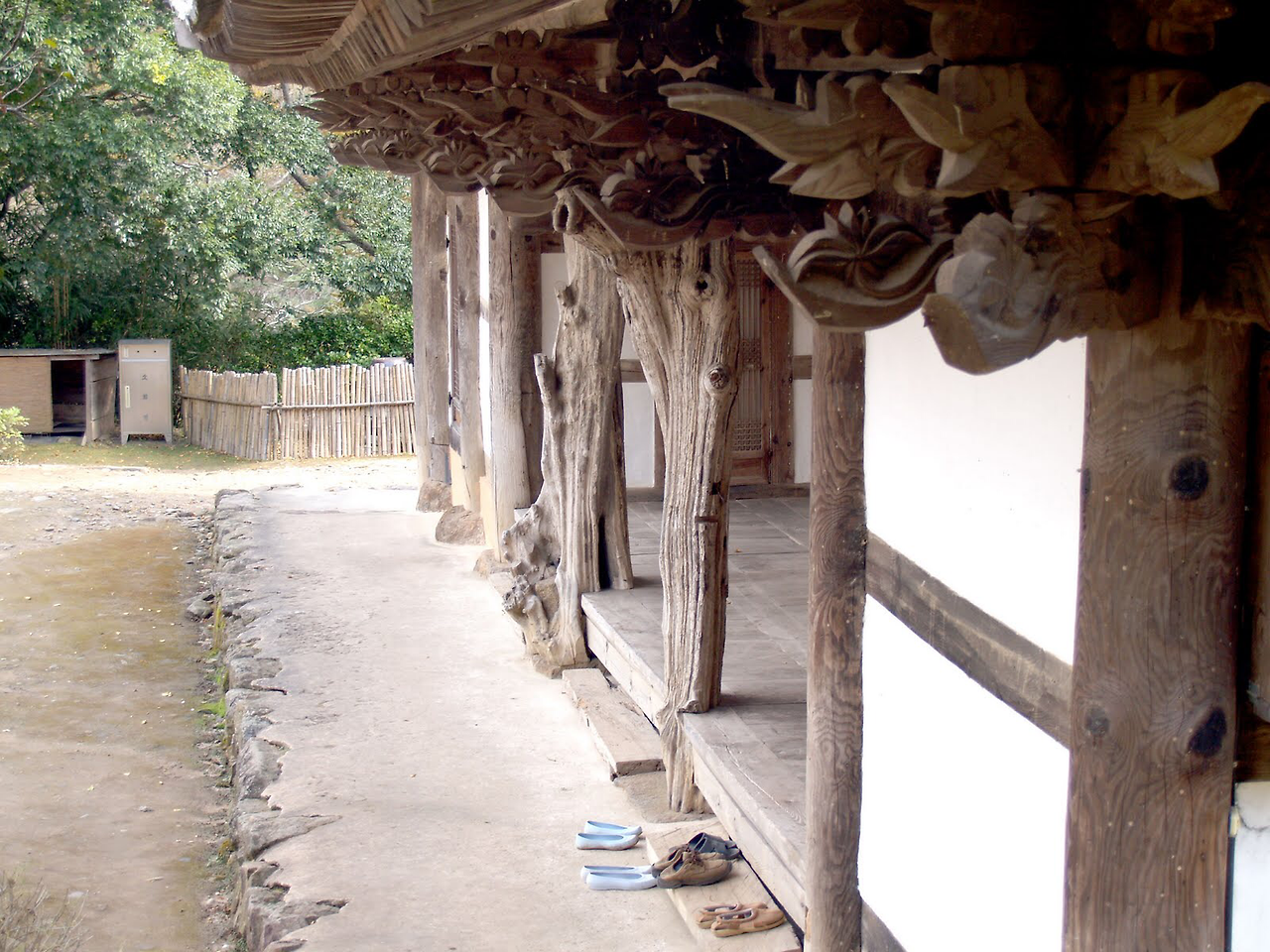 한껏 멋을 살리고 구조적 안정미까지 더한 그 유명한 배흘림 기둥보다 통나무가 제 모습 그대로 자리한 이곳 암자의 기둥은 why not!! 이란 감탄사가 절로 나게 한다. 처마를 장식한 현란한 세공조각 장식은 이곳에서도 한때 많은 신도들과 그에 따르는 풍성한 캐쉬 플로우가 형성되었음을 짐작하게 하는데, 지금은 이렇게 단청은 고사하고 부식 방지를 위한 래커칠조차 없지만 난 그 민나무들의 무늬를 들여다 볼수 있음이 더 좋았다.