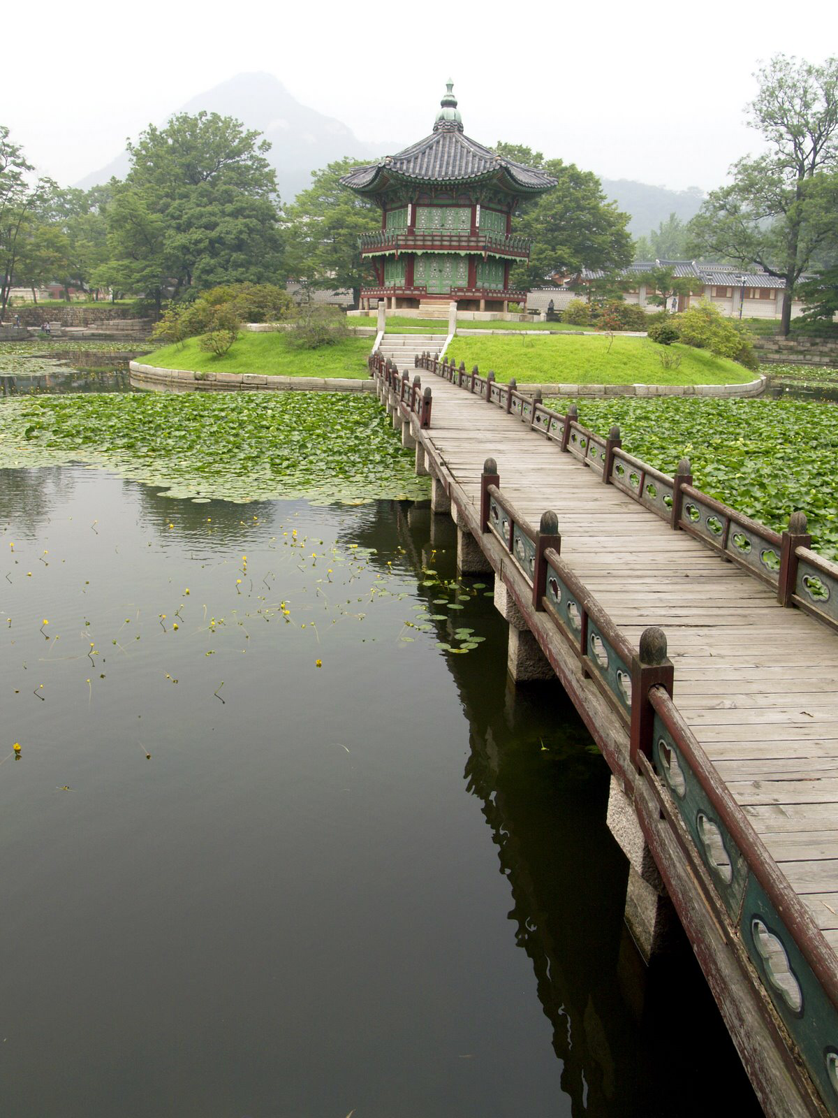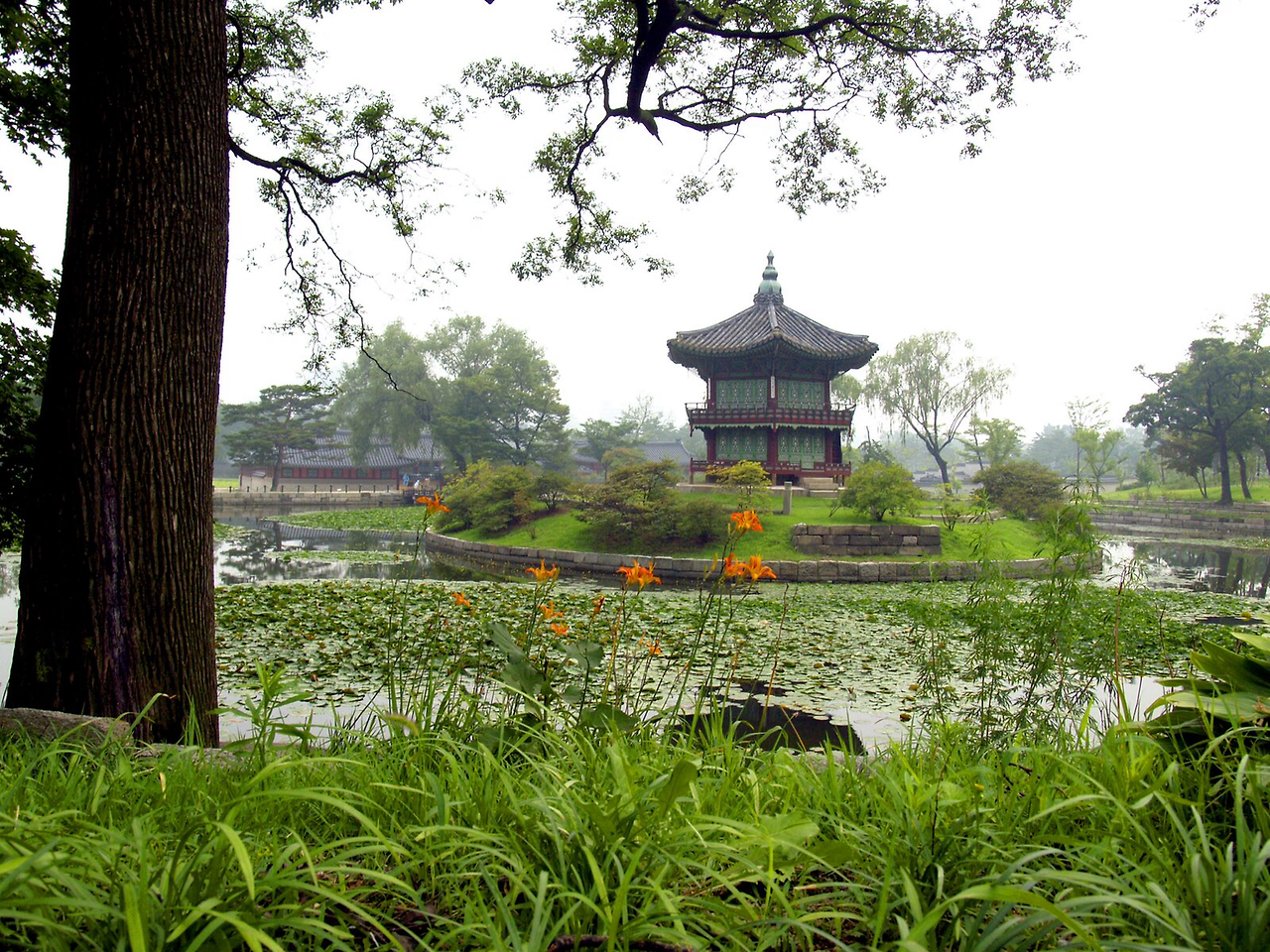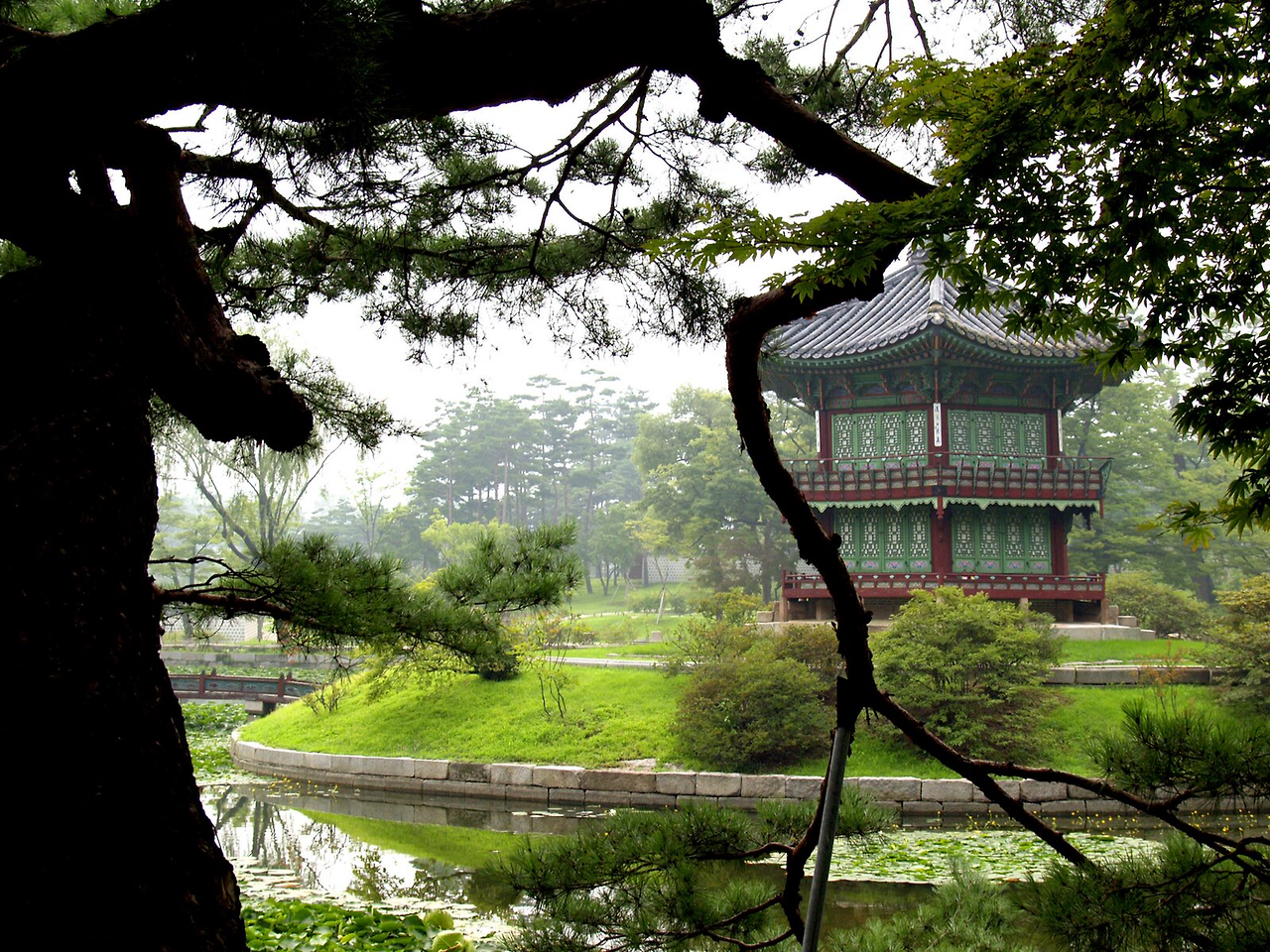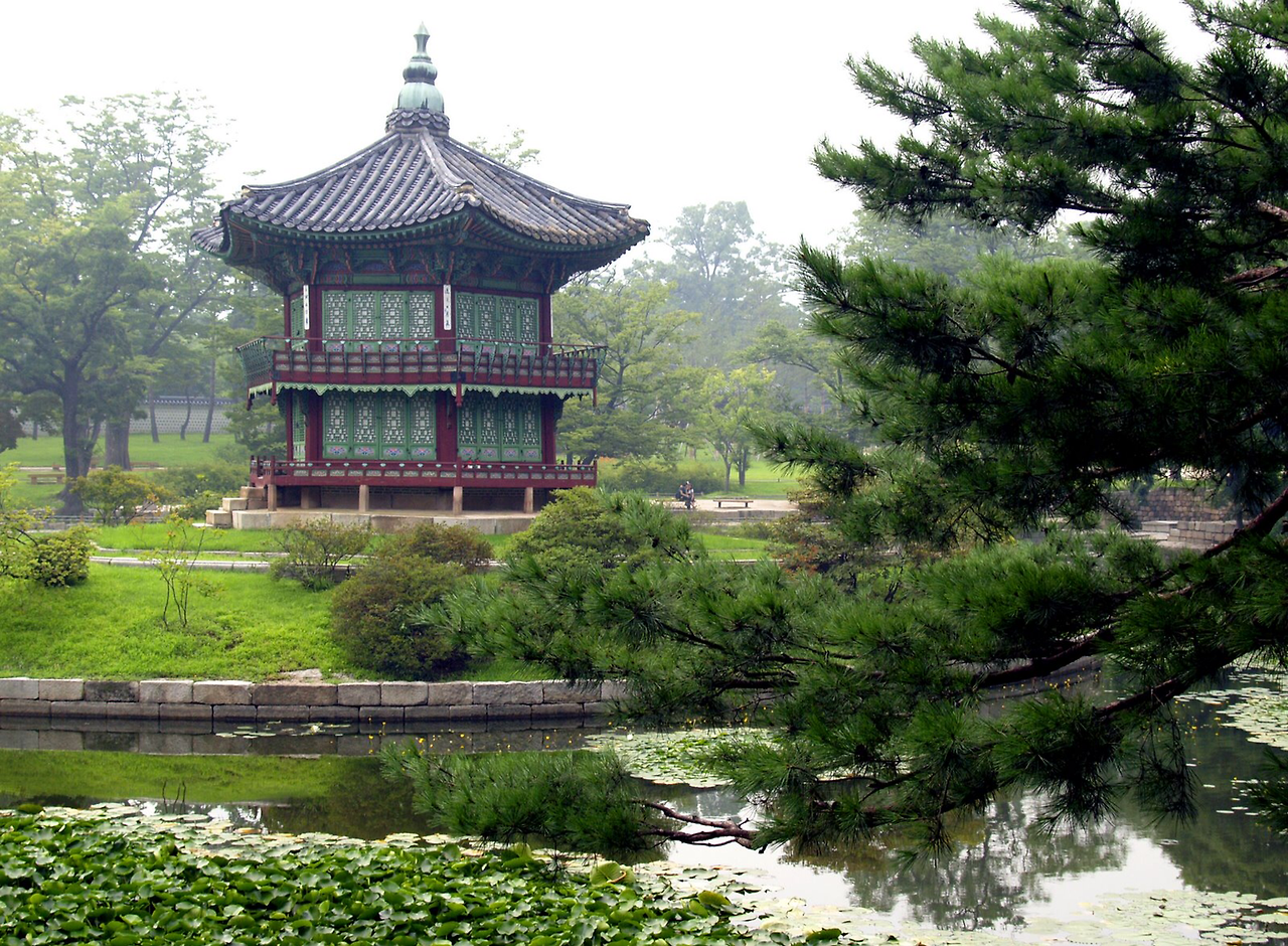 조르쥬 무스타키의 회상적 노래, 그곳에 정원이 있었네 (Il y'avait un jardin)를 들으면 산책하고 싶은 곳들이 떠오른다. 어디 한두군데가 아니지만 서울에 있다면 당장 가볼곳은 주저없이 경복궁이다. 한국의 전통적 정원은 주변 자연과의 구분이 명확하지 않아 전문가가 아니면 오래되어 손상된 정원터를 밝혀내는 건 매우 힘들다고 한다. 지극히 인위적인 일본의 정원들에 비해, 한국의 정원은 자연의 경계와 너무 자연스럽게 어우러져 어디서 부터가 가꾼 정원이고 어디가 자연인지 그 경계가 모호하기 때문이다. 굳이 나의 공간을 강제로 자연으로 부터 옮겨 와 담을 높혀 구분 지어야 하는가 라는 생활 철학적 입장에서 우리의 조상들은 참으로 멋스럽고 자연스러웠다. 다분히 道家적 영향으로 발빠른 현실적 대응 과 적용을 통한 근대화에는 뒤질 수 밖에 없었지만 인간과 자연의 어우러짐이라는 궁극적 명제에 대한 바른 해석이었고 여유로움이었던 것 만은 분명하다. 작금의 전쟁터를 방불하는 테크놀로지 지상주의, 자본 과 생산성 지상주의의 최전선에서 살아보고 나서야 그 우아함과 여유로움의 처신이 한 개인에게도 얼마나 필요한 것인지를 새삼 깨닫게 된다. 향원정은 인위적으로 연못을 파고 돌출된 팔각정까지 세워 놓은 과시적 형태의 궁궐 정원이지만 정을 둘러싸고 있는 오래된 나무들과 연못의 물풀들이 전체적 인위성을 많이 완화시켜 주고 있는 듯 하다. 2009년의 한국 여행에서 복원되고 있는 경복궁 구중 궁궐의 곳곳을 둘러보며 얼마나 많이 흐믓하고 자랑스럽던지.