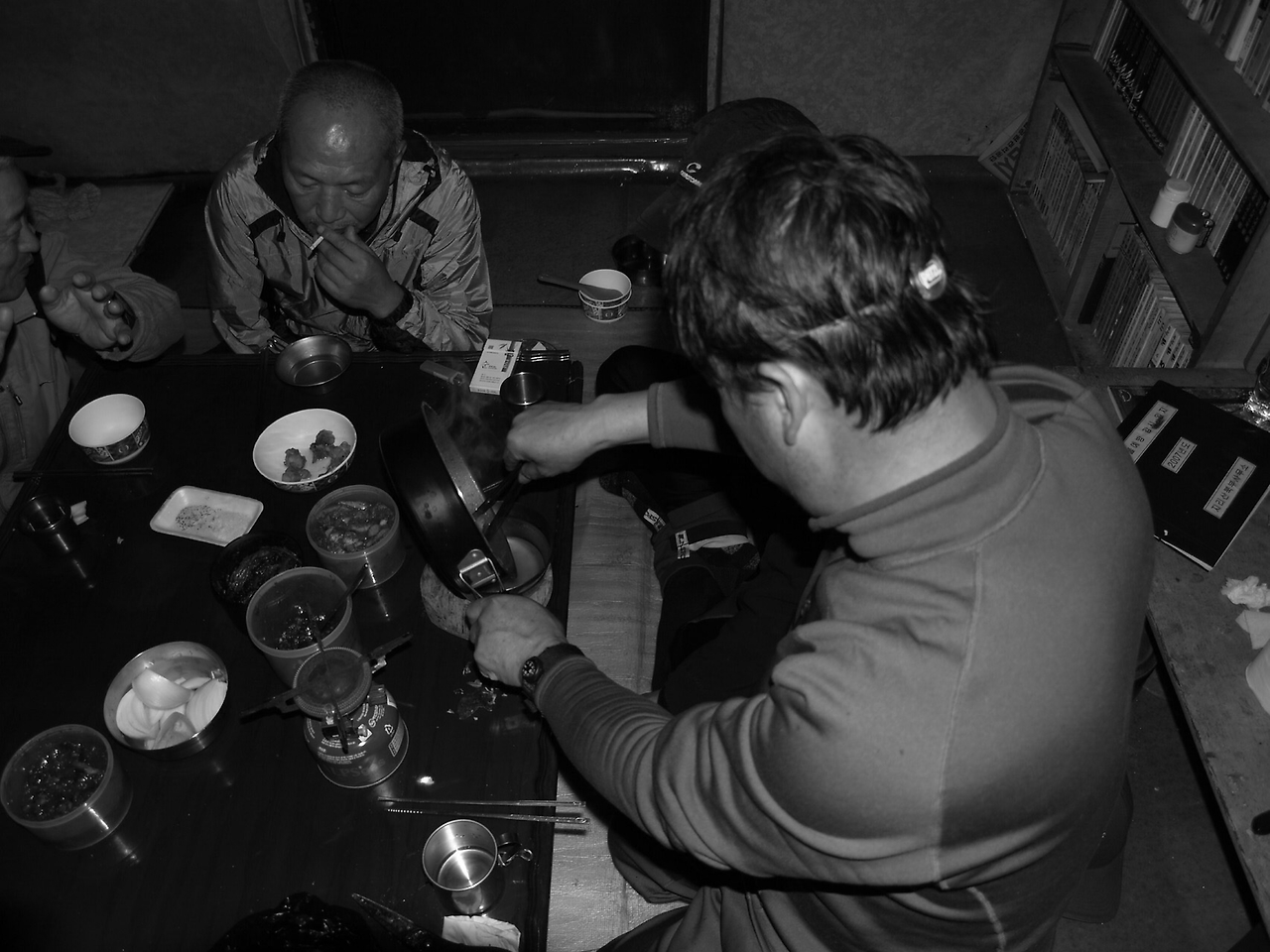 한편, 황홀한 맛의 라면 섭취가 끝나고 나서 더 이상 바랄 게 없는 듯 포만감과 만족감에 빠져 있던 나와는 달리 날 이곳으로 이끈 전직 산장지기 사나이를 비롯한 다른 이들은 누군가를 기다리기 시작했는데 그 기다림의 대상은 바로 '형님'으로 일컬어지는 누군가였고 그는 지금 여수에선가 목포에선가 이곳 지리산 꼭대기 부근의 산장으로 향해 오고 있다는 것이었다. 나와는 전혀 일면식이 없던 산 사나이들이기도 했고 다들 과묵하게 자신들의 일에만 몰두하고 있었던 이들 중 누구를 붙잡고 뭘 물어볼 상황이 아니었다. 깊고 깊은 산 자락엔 밤이 빨리 찾아왔다. 어슴프레 해가 지나 싶더니 칠흑 같은 밤이 찾아왔고, 산장의 막내는 계속해서 모바일폰으로 그 '형님'의 위치를 확인하고 있었다. 형님 어디쯤 오고 계세요? 그리고 한참 후 산장의 막내가 그 형님을 마중을 나갔고 그가 드디어 산장에 도착했다.