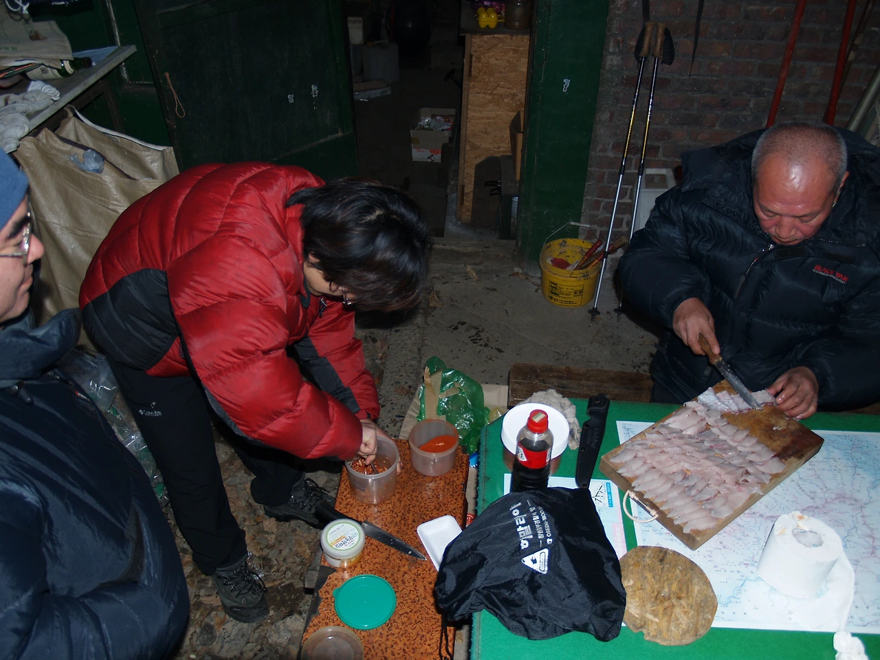 도마 위에 차려진 회는 단순하고도 정직한, 원초적 디쉬였다. 여수 형님의 음식에는 그 흔한 현란함이나 지겨운 고급스러움, 쓸데없이 식재료를 낭비하는 장식적 설정은 전혀 찾을 수 없었다. 음식을 정리해 그럴듯한 접시에 다시 담아내는 프레젠테이션 절차는 생략되었고 깊은 맛을 살린다는 숙성과정 역시 당연히 없었고, 감칠맛이라는 명분하의 어떤 잡다한 첨가물도 없었다. 물론 싱싱함과 잘 썰어냄이 모든 것인 한국식 회이기 때문이었다. 하지만 회 한 접시를 만들어내기 위한 '형님'이라는 사람의 노고 어린 정성, 멤버들과의 우정, 매우 독특한 그만의 인간적 체취, 그리고 깊숙한 겨울의 높은 산 깊은 산장이라는 장소적 계절적 특별함이 더해져 이 음식은 어디서도 재현해 낼 수 없는 세상의 단 하나의 메뉴, 단 한 번의 메뉴일 수밖에 없었다.
