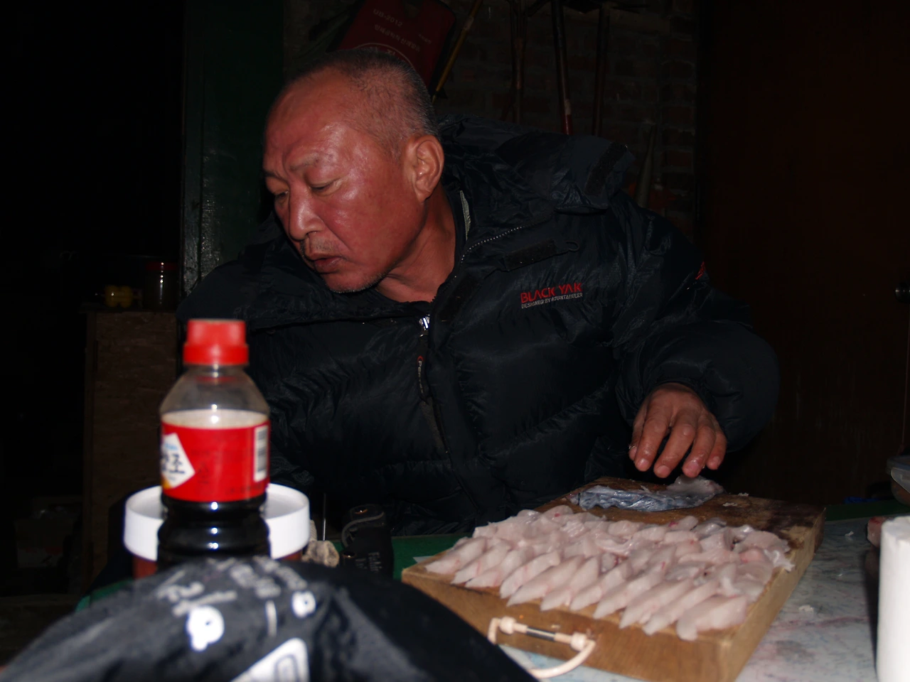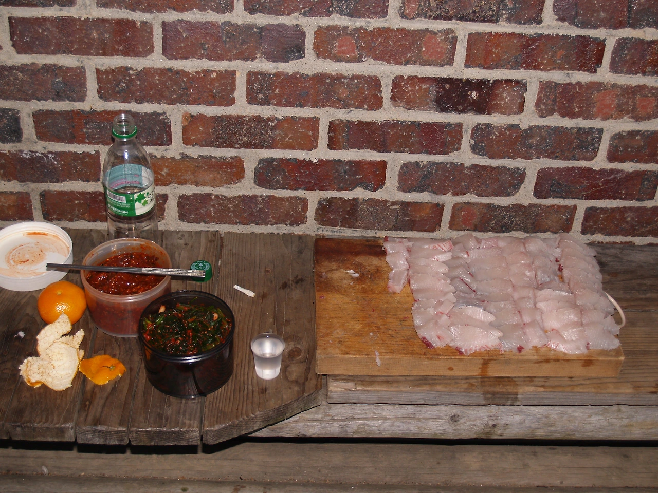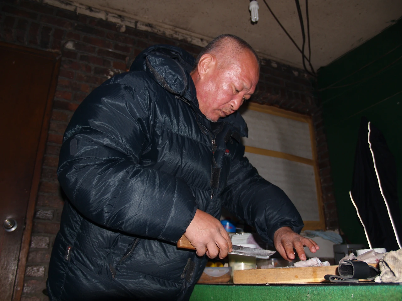하지만 놀란 건 불청객인 나밖에 없었다. 손아래뻘 인듯한 다른 멤버들은 매번 그랬다는 듯 그 '형님'을 보조하며 도마와 회칼을 준비하고 마늘을 빻고 양념장을 준비하며 소주상 차렸다. 일사분란했고 횟상 차림이 완성되기까지 거의 말들이 없었다. 난 이러한 상차림 의식을 숨죽이며 바라보며 이들의 모습을 카메라에 담았는데 그것 말고는 다른 할 일이 없었다.