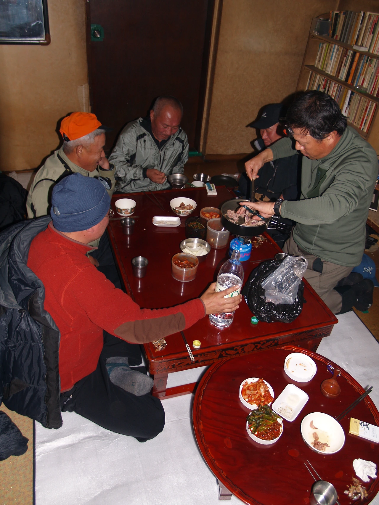 1500m 고지의 노루목을 지나 능선 산행을 지속하다 살짝 내려선 곳에 그 유서 깊은 대피소 산장이 자리하고 있었다. 그날 밤 산장에서는 속세에서 여러 모습으로 살아가던 왕년의 산장지기들이 다시 산사나이로서 함께 하는 OB 모임이 예정되어 있었는데 난 어찌어찌하다가 이들과 함께하게 된다. 그 산장의 이름이 장터목 산장인지, 연하천 대피소 인지, 아님 피아골인지 로터리 산장인지는 산을 잘 모르는 내가 알 길이 없어 안타깝다.(이글의 전편에서 피아골 산장이라 했으나 확신할 수 없음. 2020년 드디어 알았음. 로타리 대피소!) 지금 이곳 머나먼 캐나다에서 구글링을 통해 이곳 산맥의 대피소들을 샅샅이 살펴봤으나 아마도 다시 지어졌거나 지명들이 익숙하지 않은 나로서는 이곳이 어디였는지 특정할 수는 없다. 어쨌든 등산은 일 년에 한 번이나 할까 말까 했던 내가, 더군다나 이번 여행은 캐나다로 영구히 들어가기 전 한국에서의 마지막 여행으로 그저 유명 사찰이나 둘러보는 정도의 관광이나 하자던 내가 산신령의 배려로 이들 산 사나이 들과 함께 하는 시간을 갖게 된 거다. 그리고 그들만의 성찬에 초대받게 된 거다.