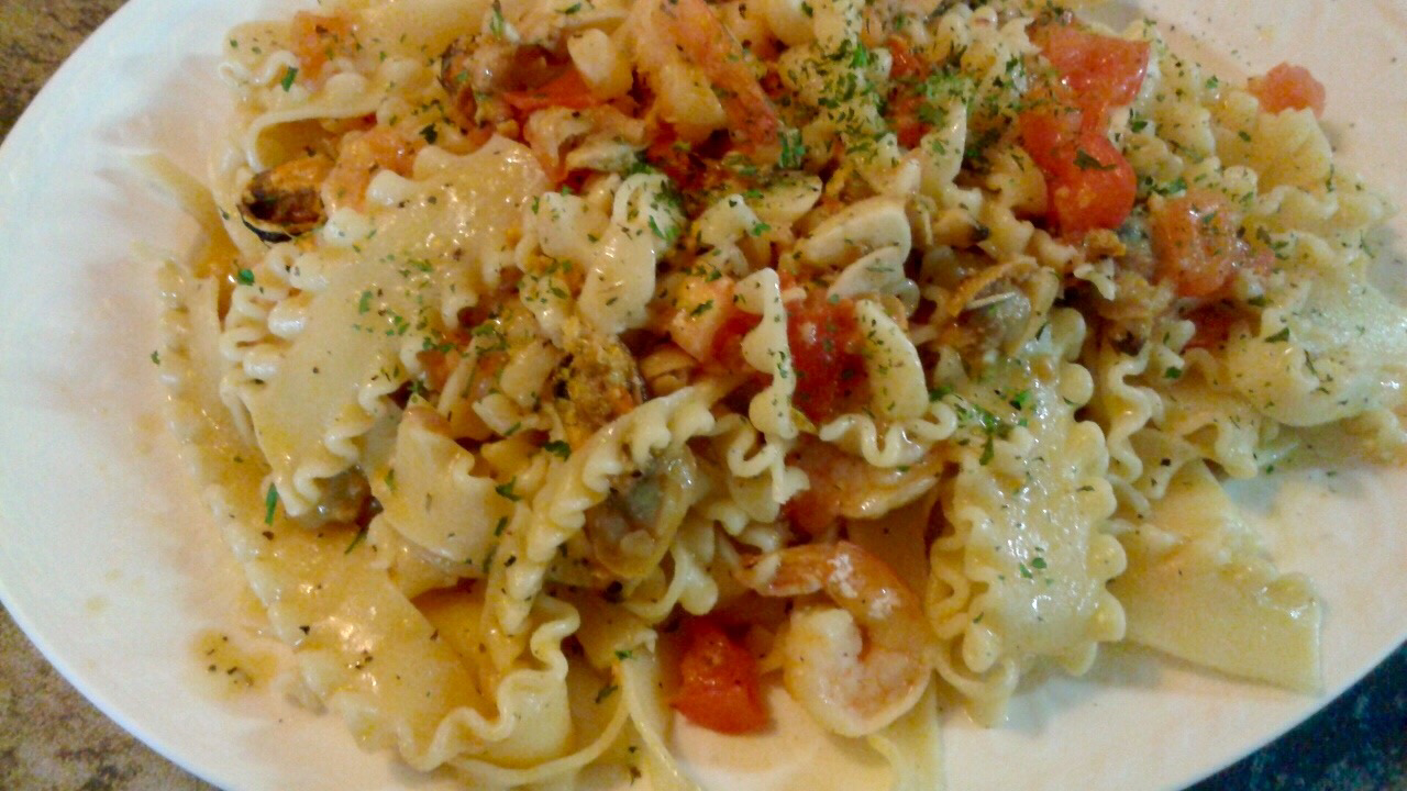 그리고 약간의 핫 페퍼와 바질 듬뿍, 약간의 로즈마리와 피노 그리지오 와인을 기본 소스로 하면서 모시조개 와 홍합, 새우를 넣어 시푸드 소스를 완성하면서 파스타를 삶은 국물을 조금 첨가한 다음 삶아진 파스타를 소스에 넣어 센불에 비벼내면 끝~~ 몸에 좋은 토마토도 diced 하여 넣어 먹으면 좋다.