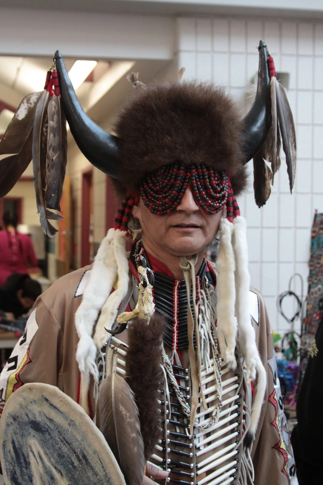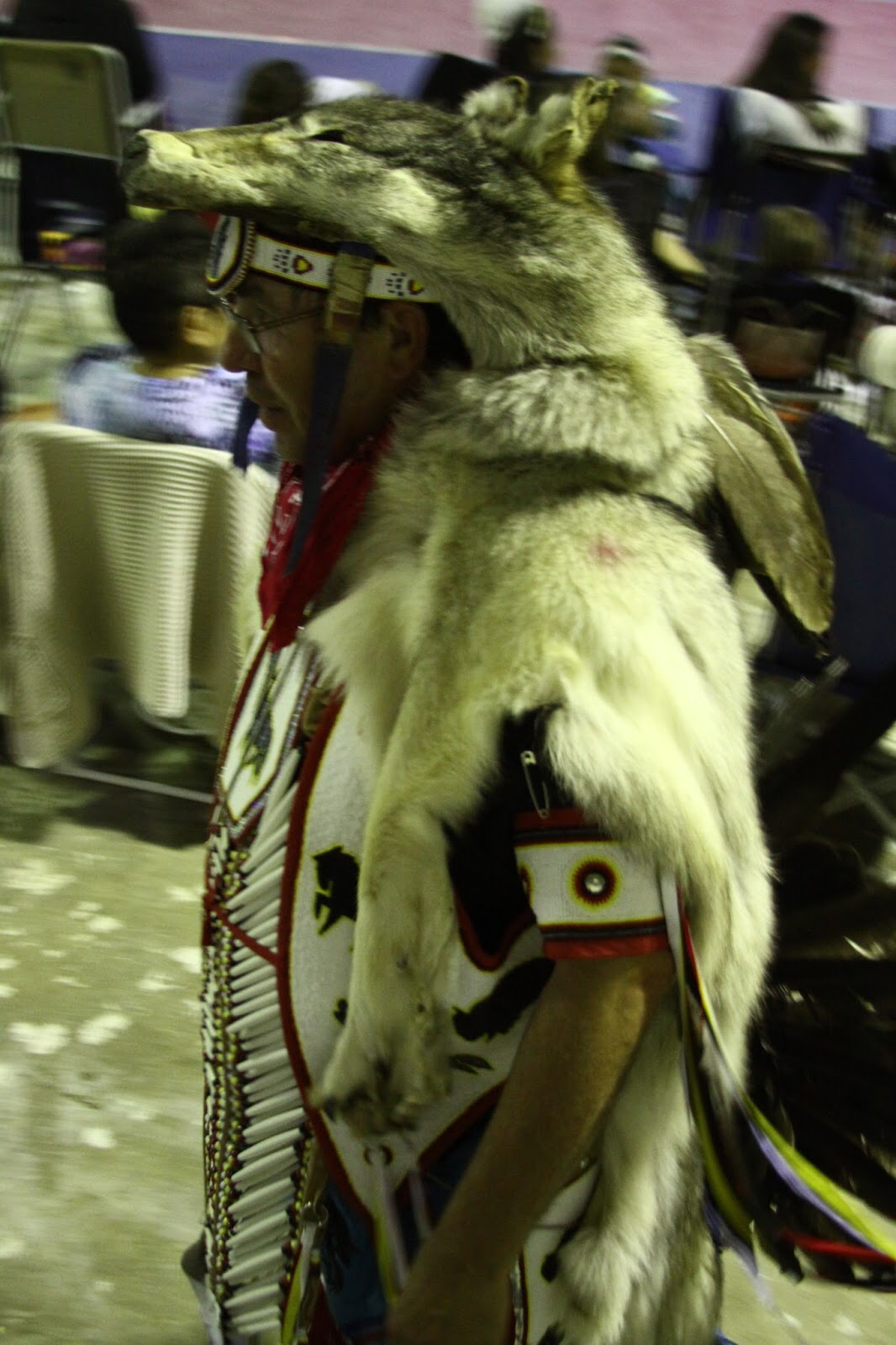 완전한 늑대 가죽을 뒤집어쓴 파우와우 워리어.. 깃털은 주로 매나 독수리의 깃털을 사용한다.