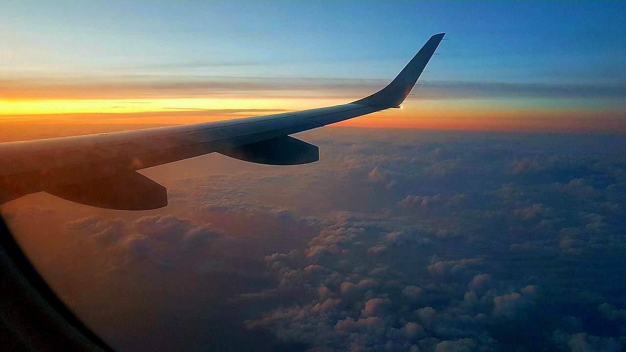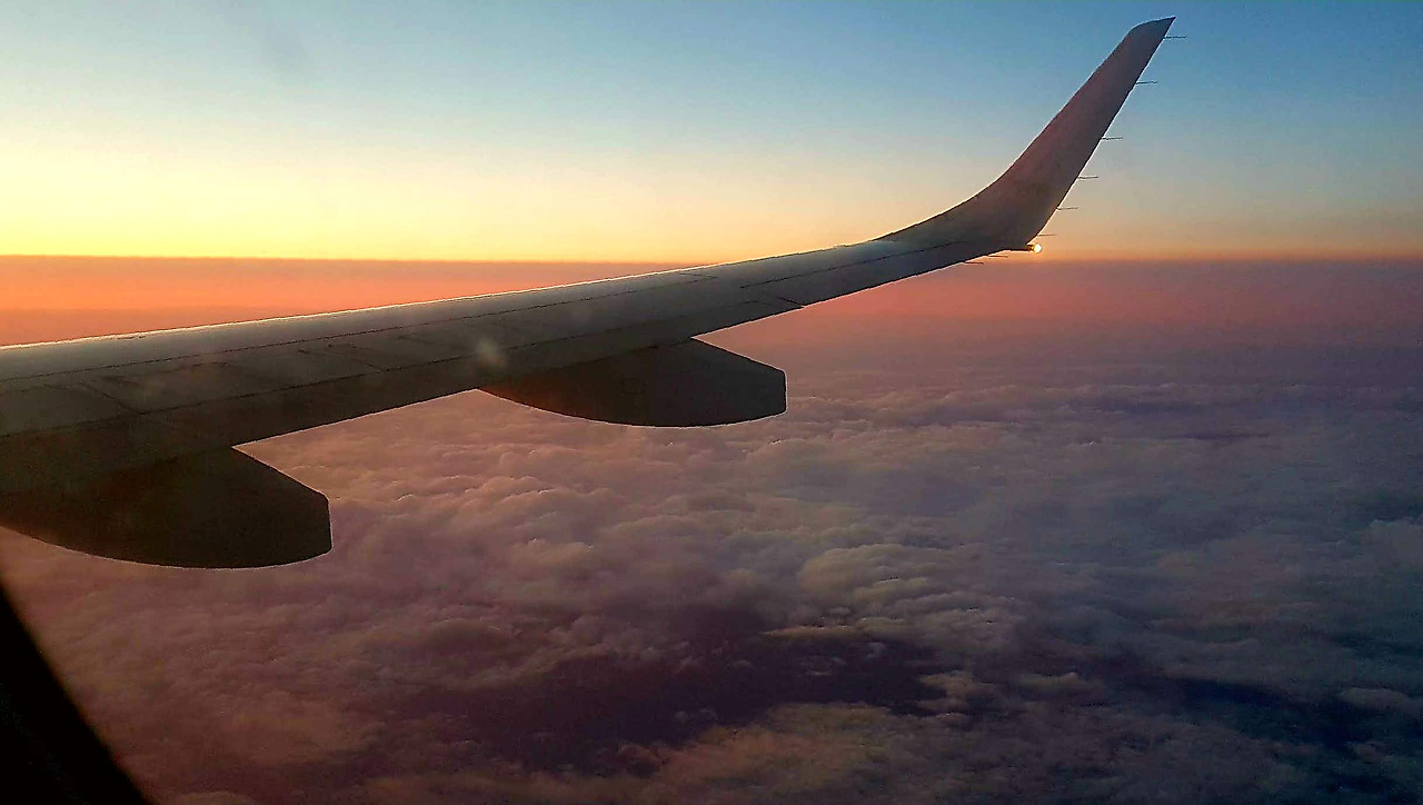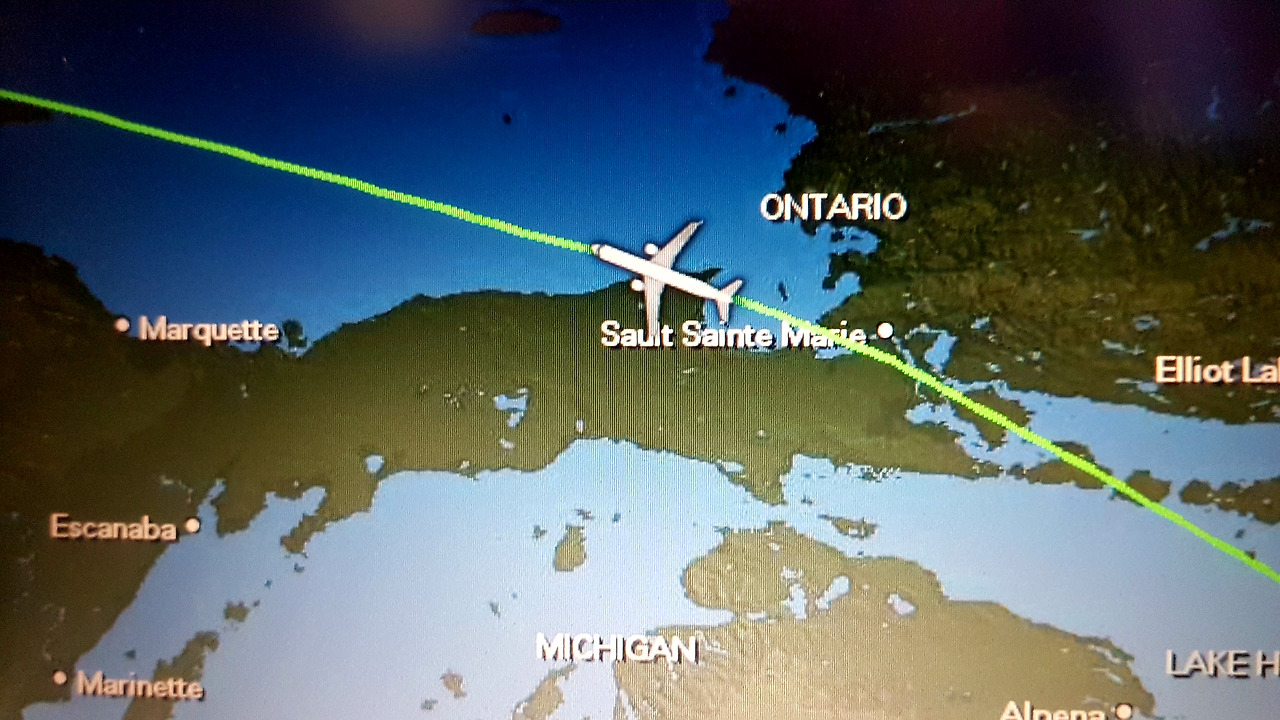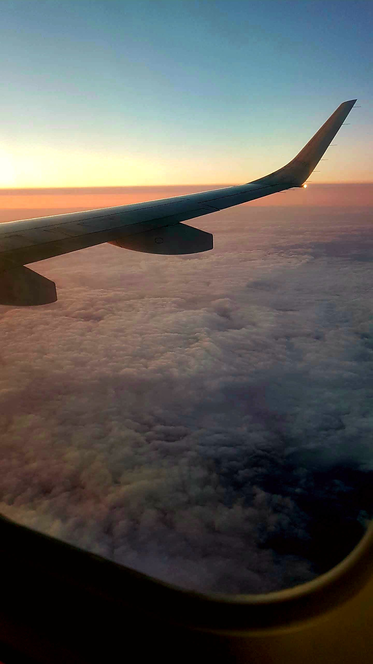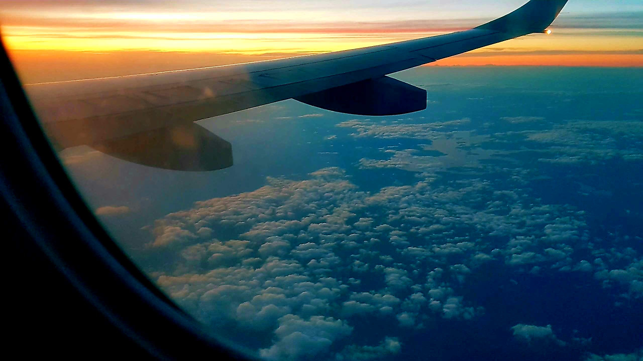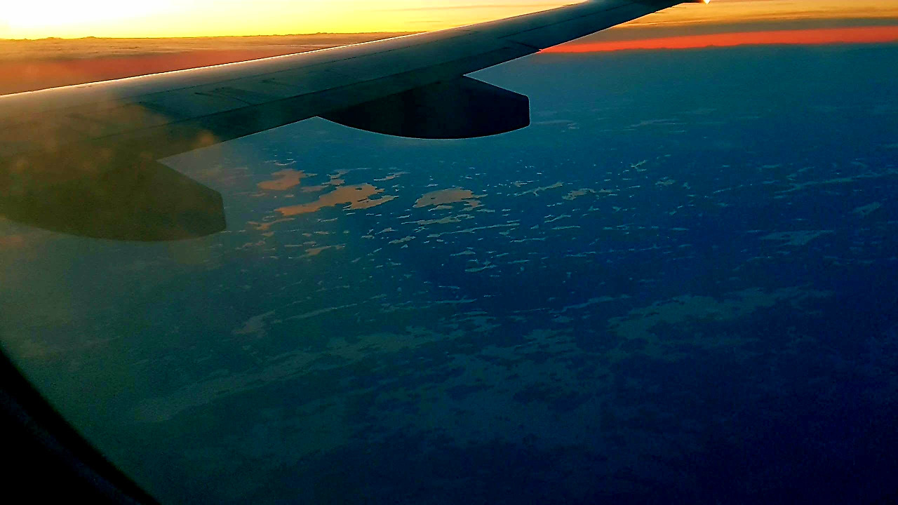북미대륙의 동쪽에 위치한 토론토에서 대륙의 정중앙에 위치한 리자이나(Regina)까지의 비행은 약간 서북쪽으로 키를 잡긴 하지만 거의 서쪽 방향으로의 비행이다. 그래서 만약 토론토에서 막 해가 질때 이륙을 한다면 세시간 비행중 두시간 넘게 계속해서 아름다운 노을과 함께 하게 된다.