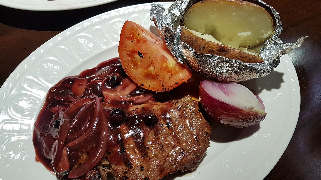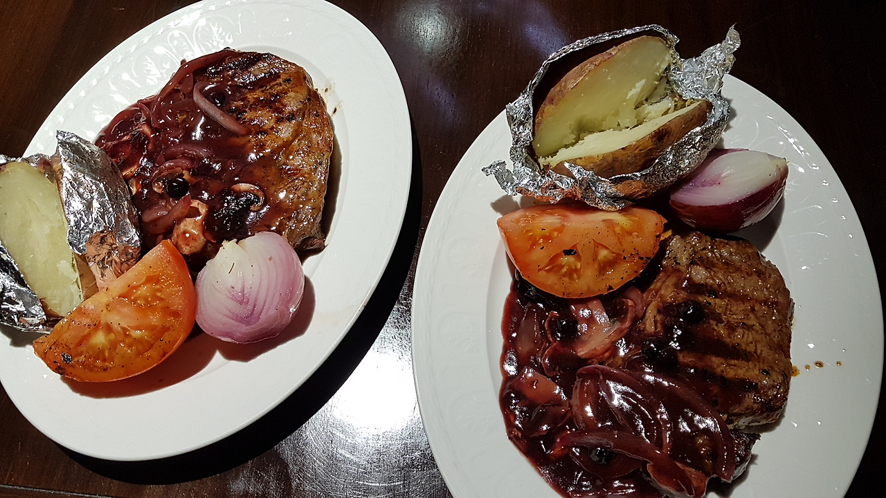 유럽 여행에서 돌아온 아내와의 스테미너 저녁 식사로 스테이크를 정했다. 감자는 뭐니뭐니 해도 baked! 스테이크를 그릴에 굽기전에 감자를 먼저 알루미늄 호일에 잘 싸서 구워 주는데, 큼지막한 빨간 양파도 껍질채 통채로 굽는다. 20~30분 정도 구워 주다가 스테이크를 굽기 시작하면서 토마토 역시 통으로 구워준다. 이때 스테이크 소스를 만들면 되는데 예전엔 기존의 A1 소스나 HP 소스등을 애용했지만 요즘은 내가 직접 만든다. 비프 그래이비( beef gravy)를 기본으로 하고 버터, 송이, 양파, 그리고 새콤 달콤한 블루베리를 넣어 만들었다. 약간의 설탕과 페퍼, 그리고 레몬즙을 넣으면 된다. 블루베리는 건강에도 좋지만 진한 자줏빛 색깔이 너무 우아하게 나온다. 스테이크 소스 색깔만으로도 6성급 호텔 스테이크 완성! ㅎ