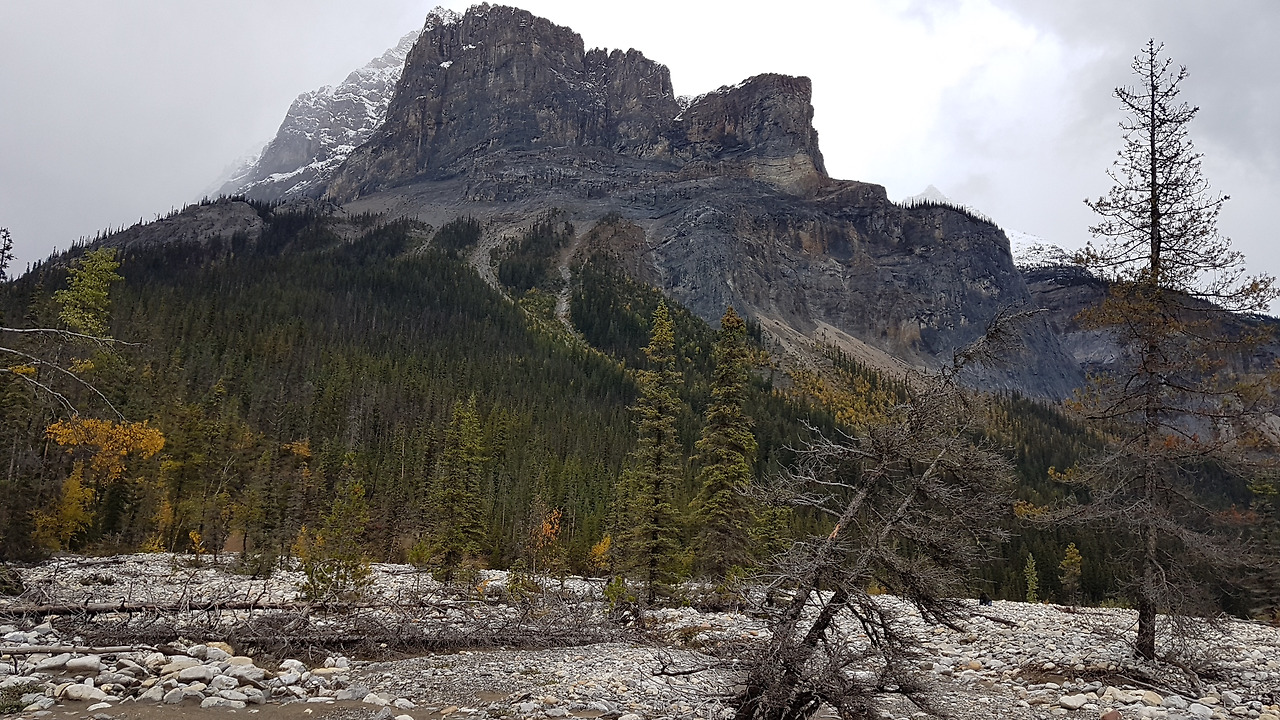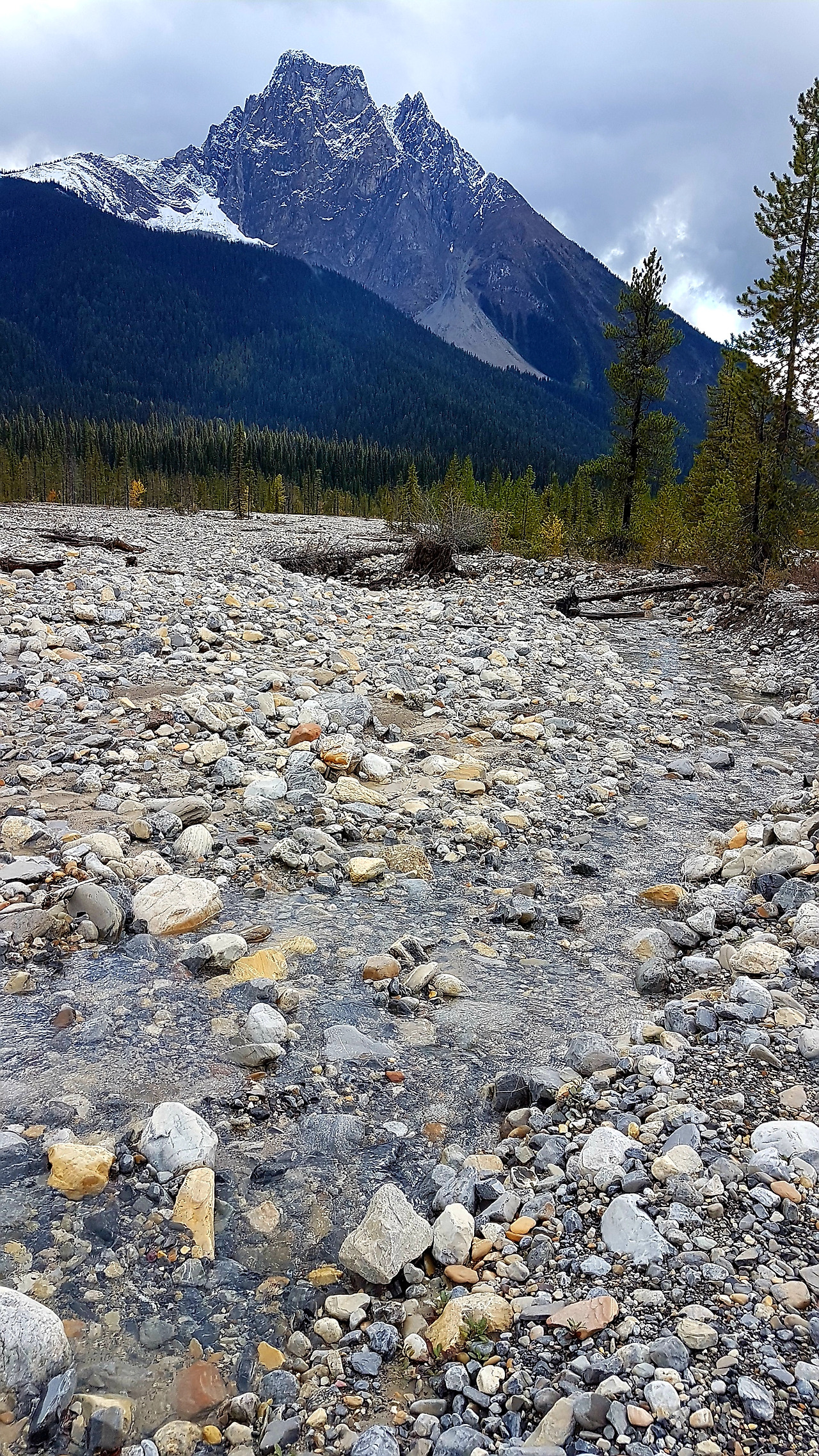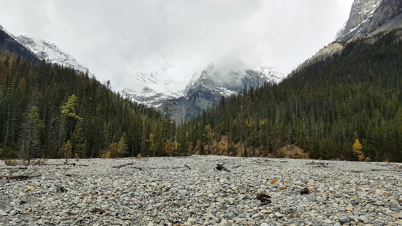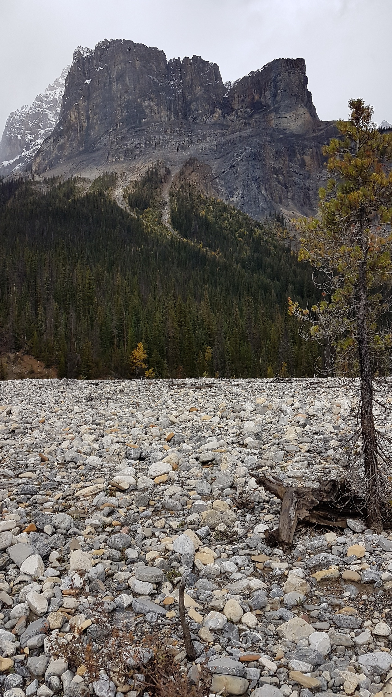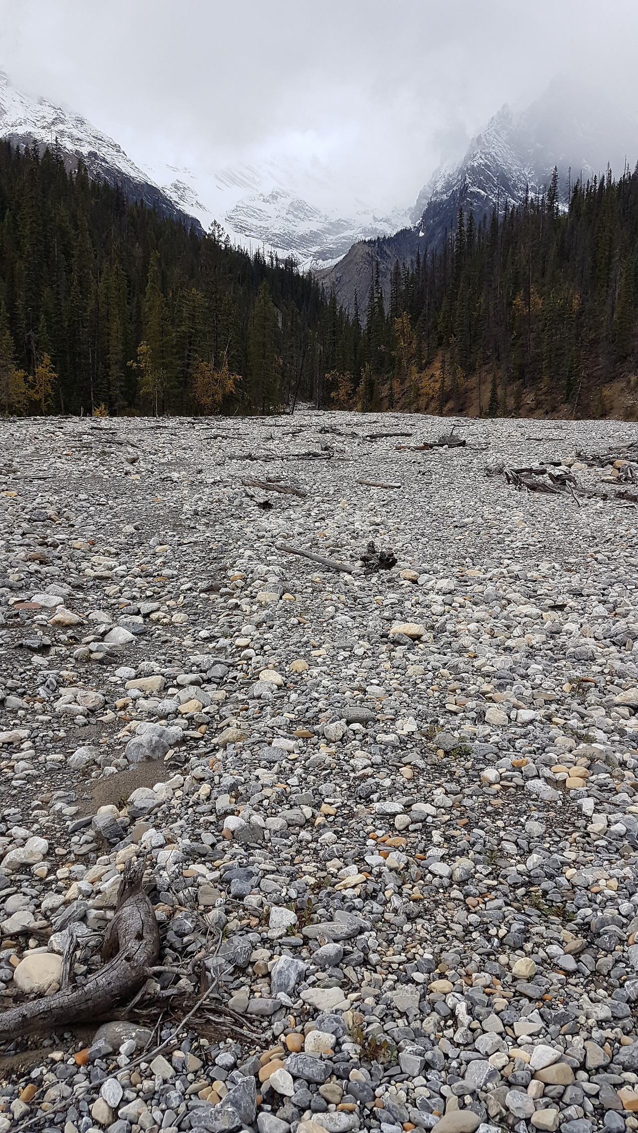 캐나디안 록키의 어느 곳에서나 대형 산사태 avalanche 주의 표지판을 많이 접하게 된다. 지금 우리가 거닐고 있는 이곳이 바로 아발란치가 발생해 거대한 눈더미에 쓸리고 묻혀 버린 곳이다. 아마도 수년 이상 눈 속에 파묻혀 있었을 고목들은 고사목 형태로 조금 남아 있고 온통 조약돌 들로 가득 찬 이곳엔 빙하 물만 개울을 형성하며 여러 곳에서 흐르고 있었던 거다.