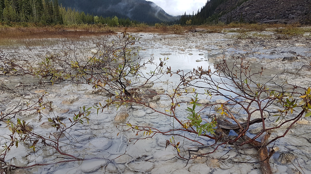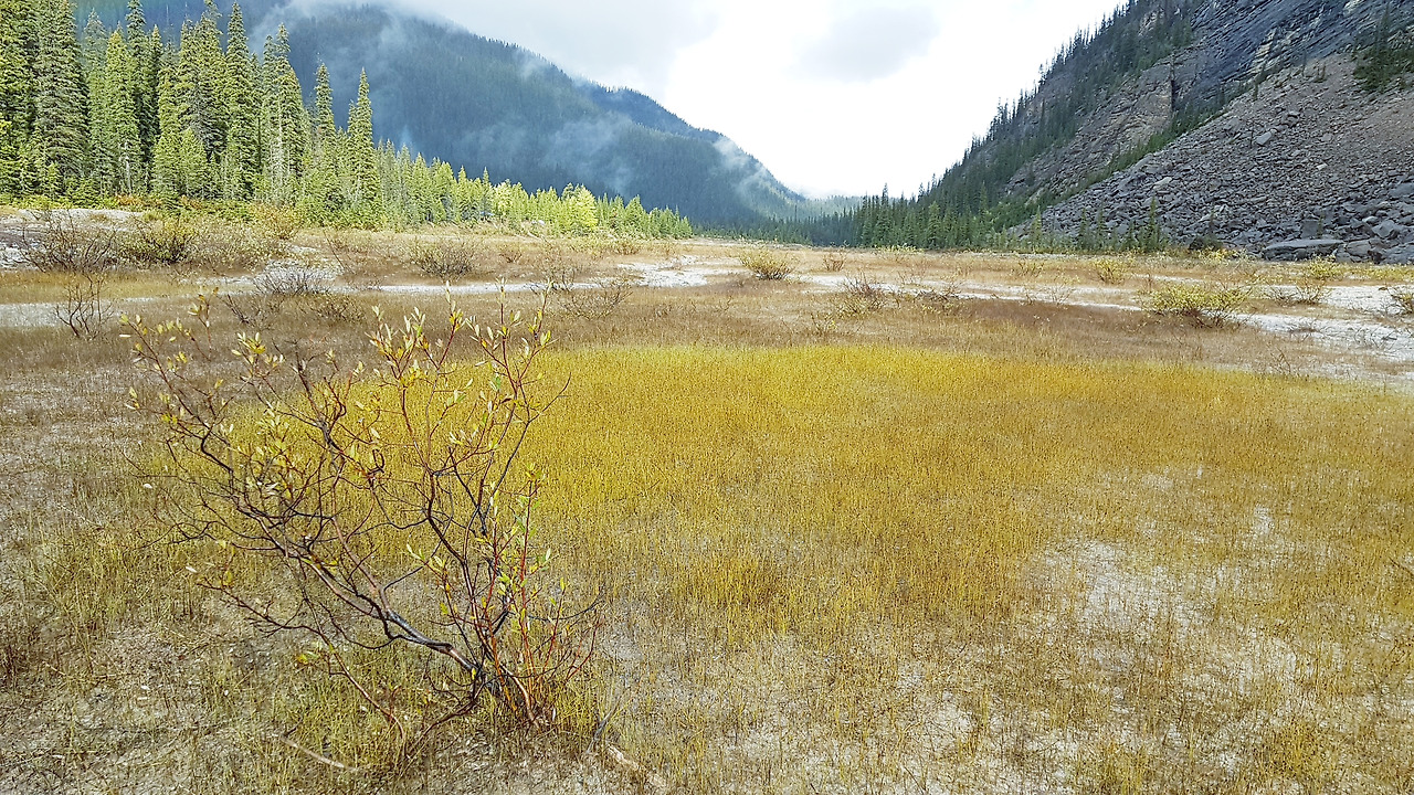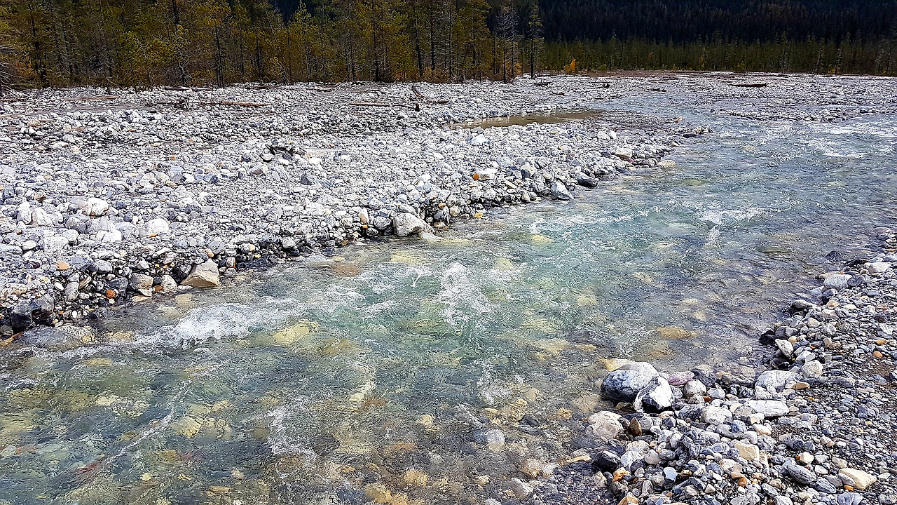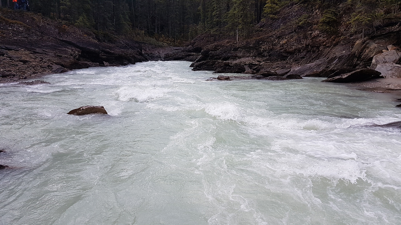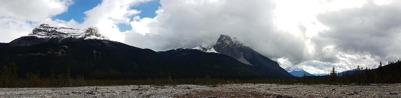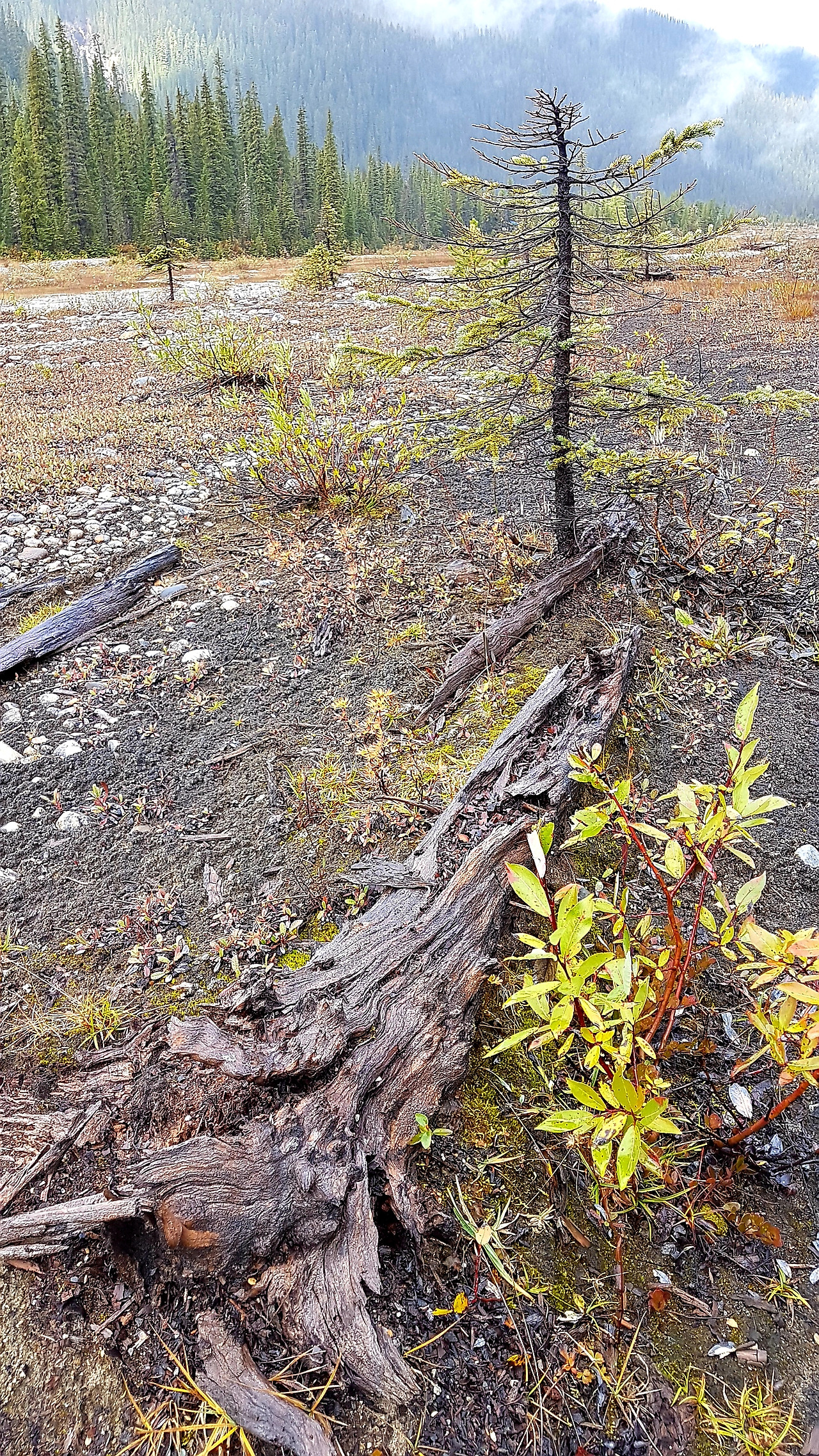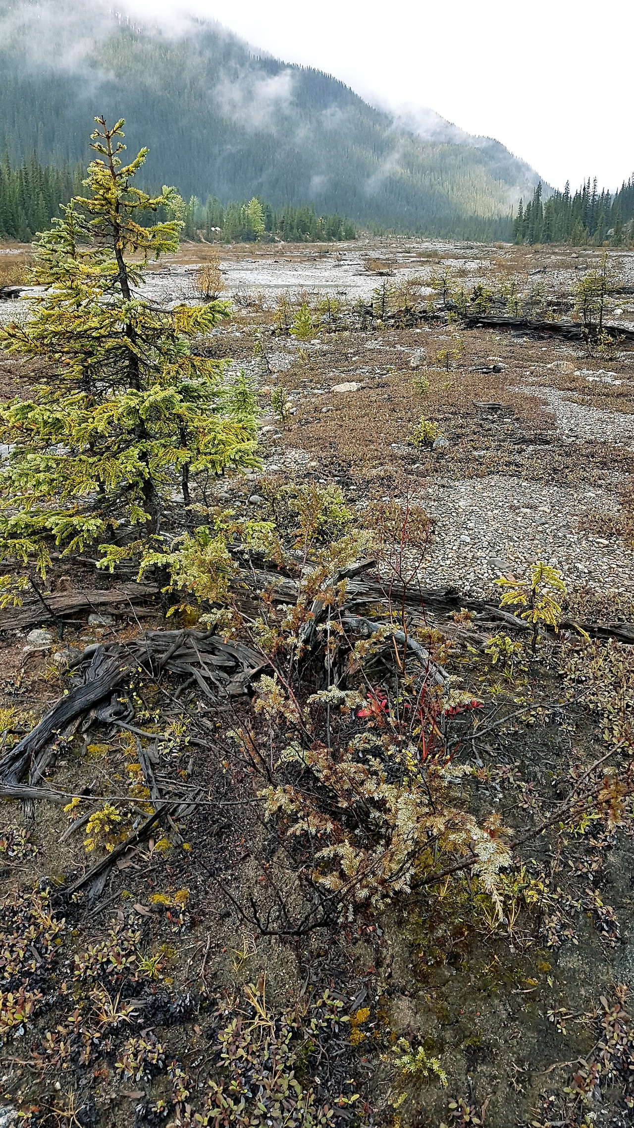 캐나디안 록키의 어느 곳에서나 대형 산사태 avalanche 주의 표지판을 많이 접하게 된다. 지금 우리가 거닐고 있는 이곳이 바로 아발란치가 발생해 거대한 눈더미에 쓸리고 묻혀 버린 곳이다. 아마도 수년 이상 눈 속에 파묻혀 있었을 고목들은 고사목 형태로 조금 남아 있고 온통 조약돌 들로 가득 찬 이곳엔 빙하 물만 개울을 형성하며 여러 곳에서 흐르고 있었던 거다.