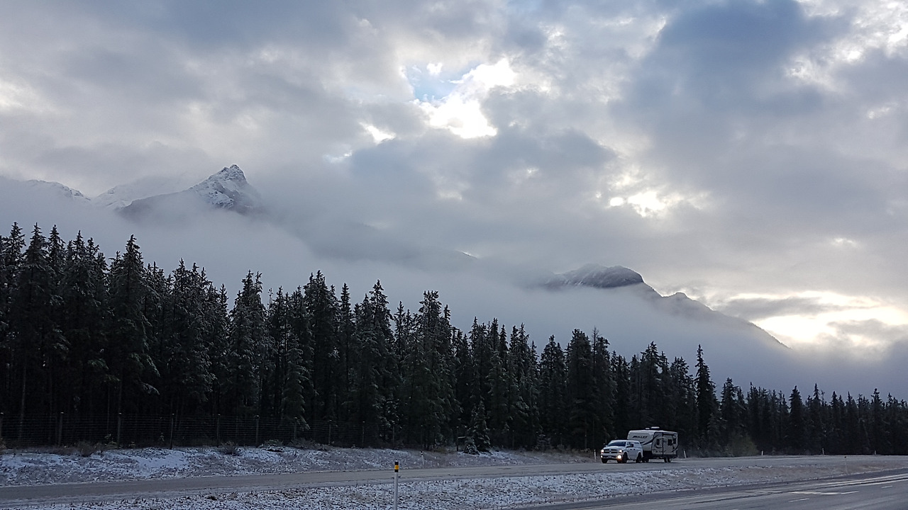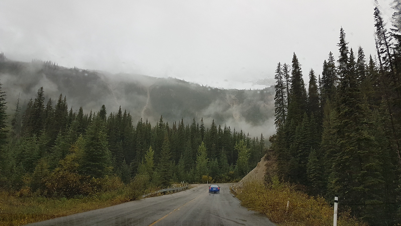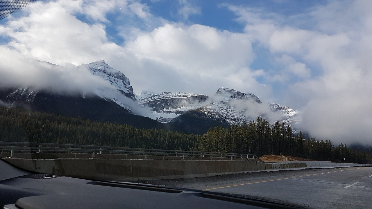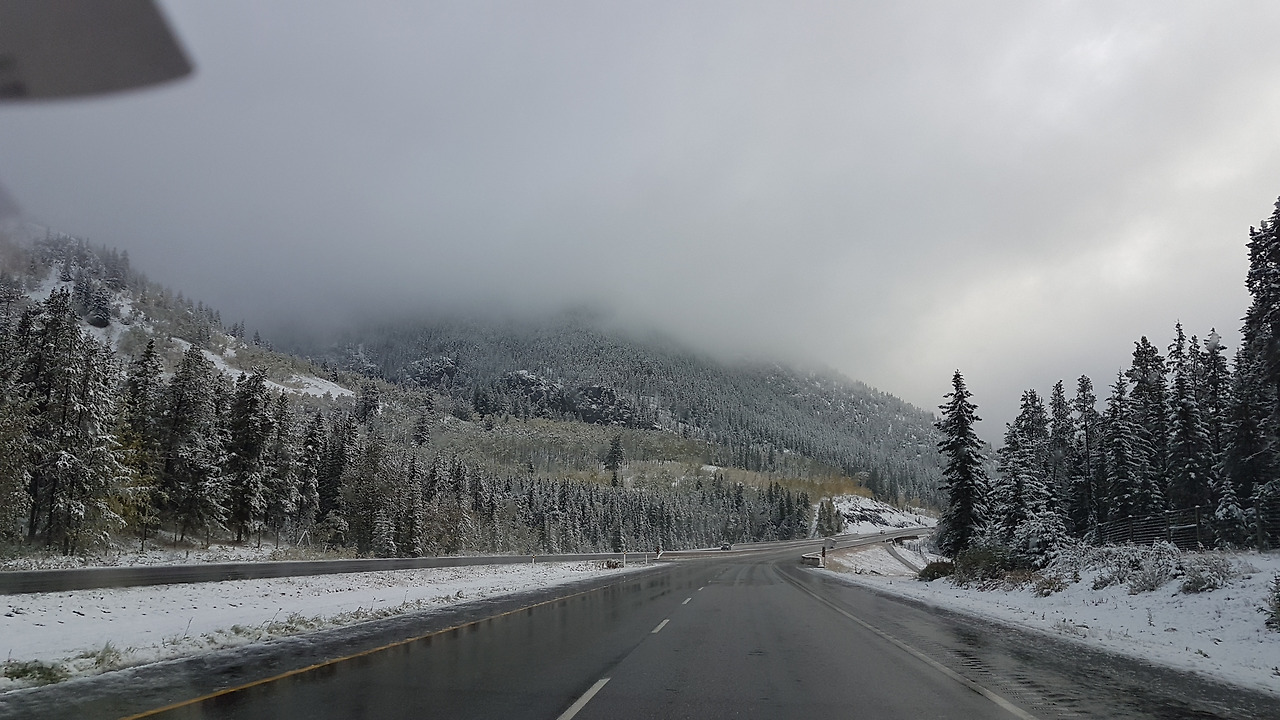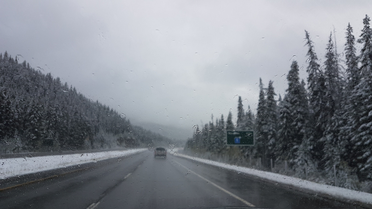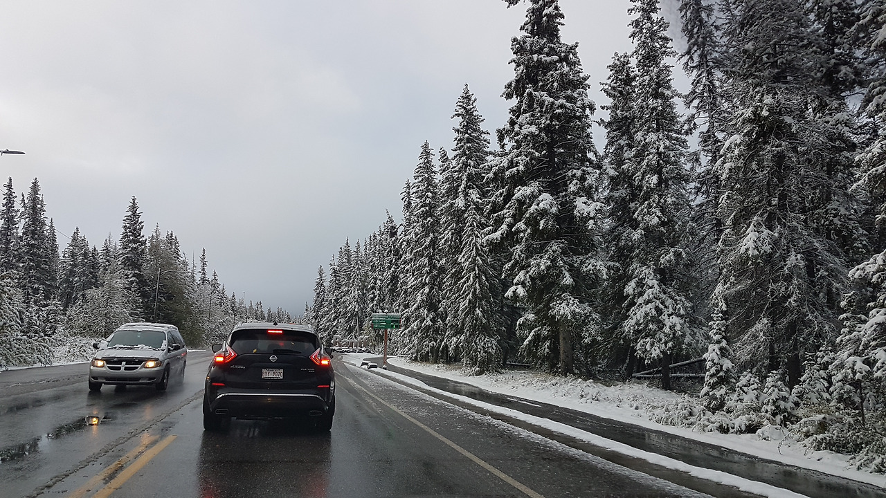 록키 산맥 주변은 고원 지대라 기후가 시시각각으로 변한다. 호텔을 떠날 때의 푸른 하늘은 구름으로 덮였고 눈과 비가 섞여 내리는 구간을 통과하고 있다.