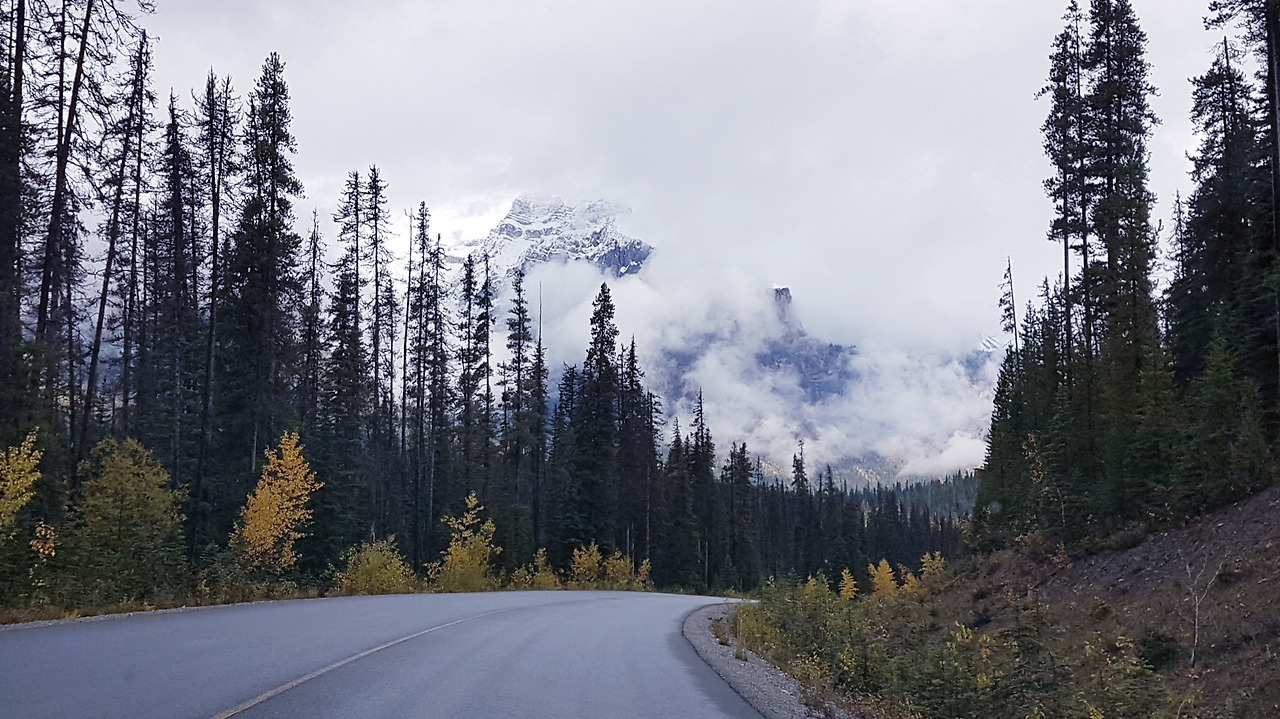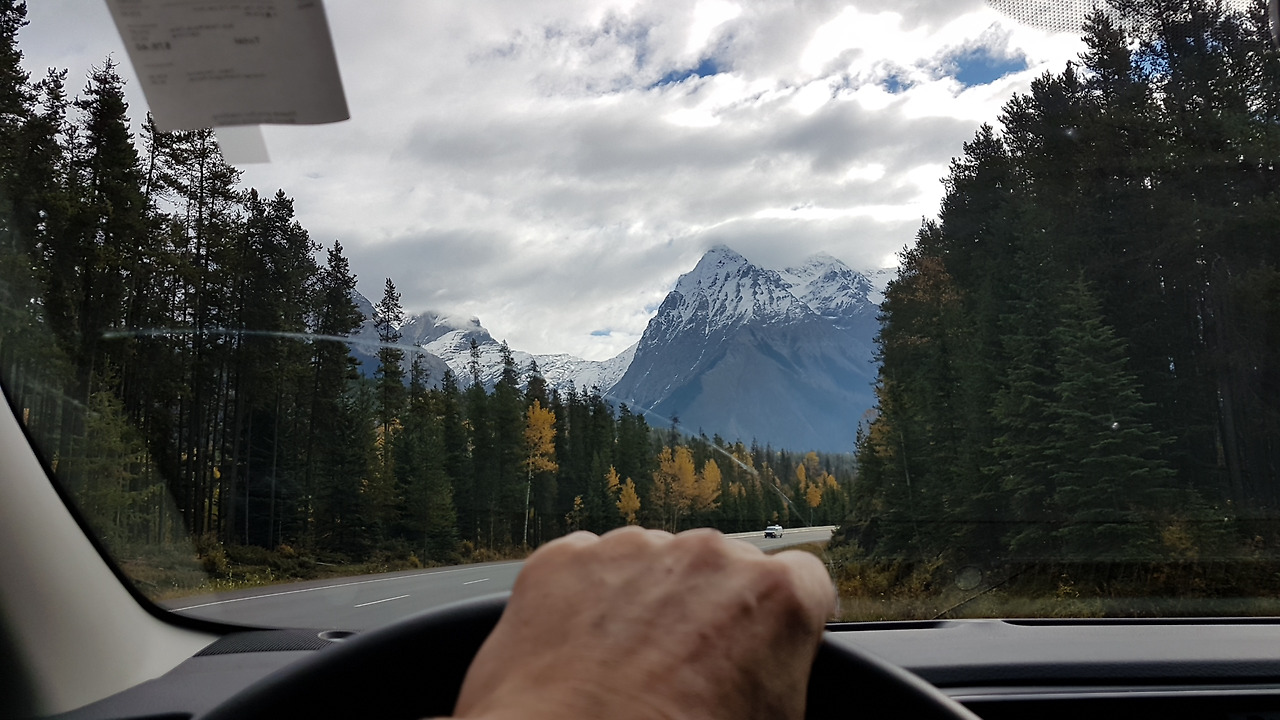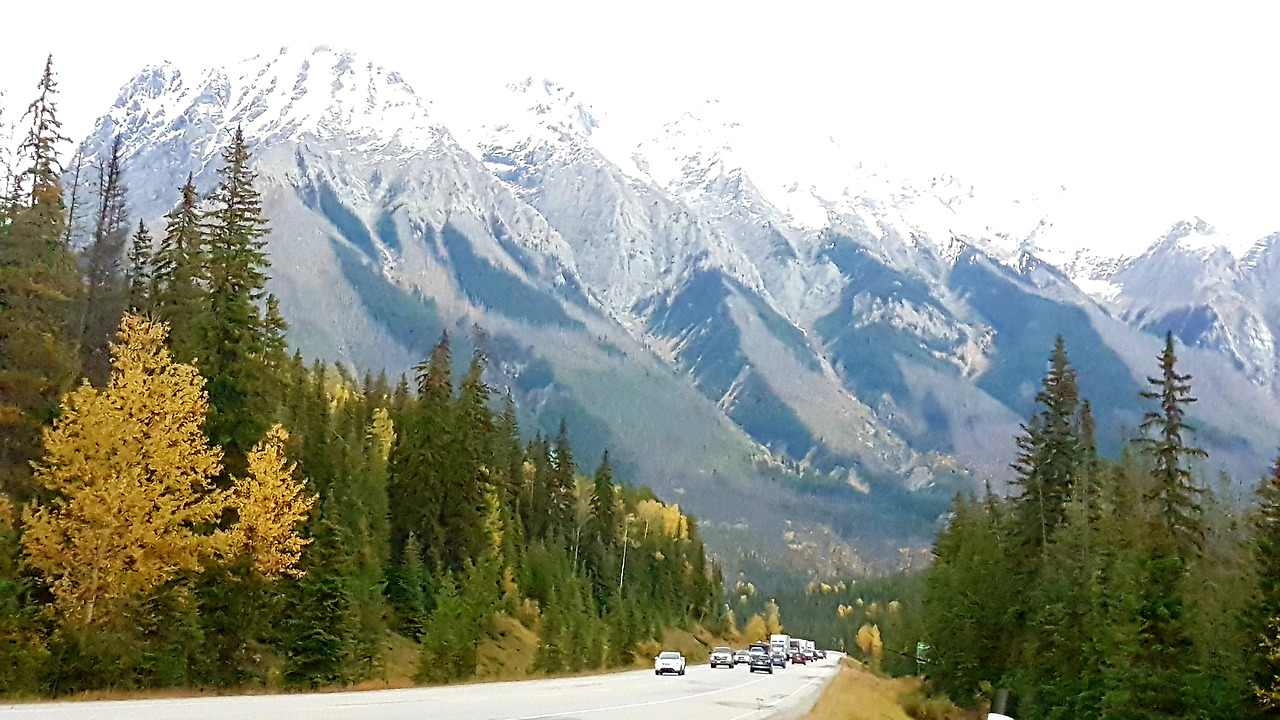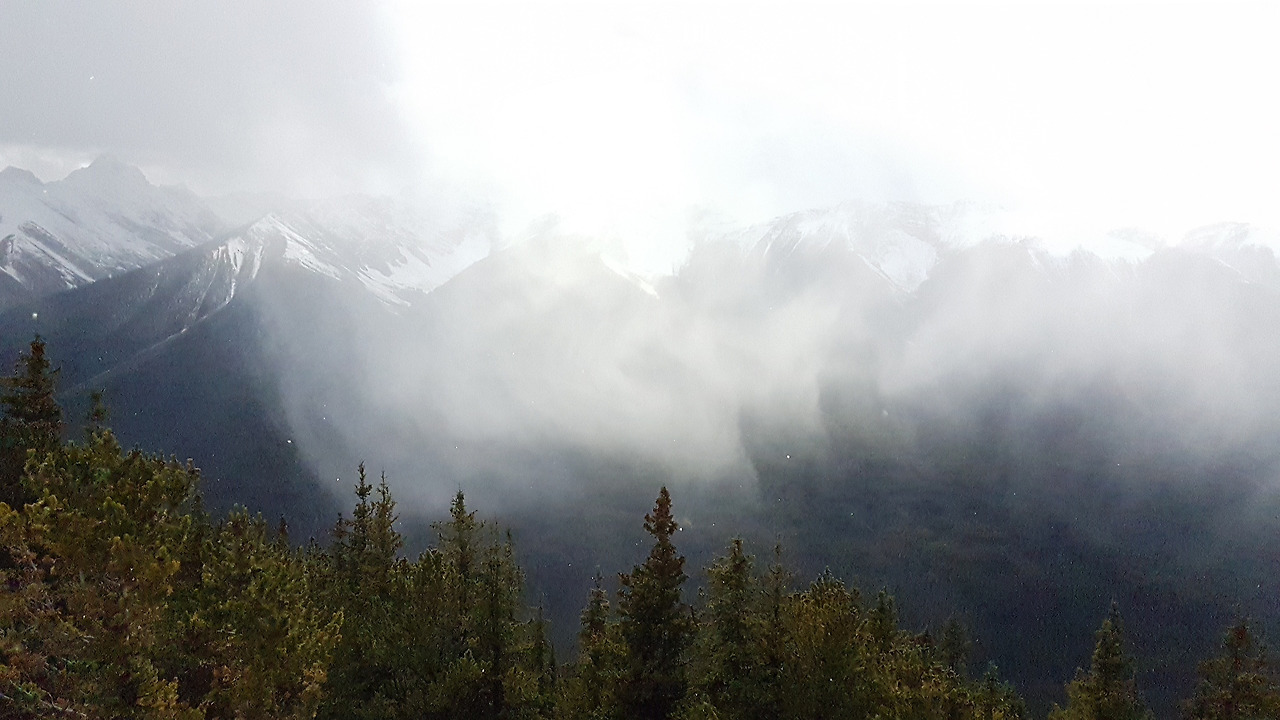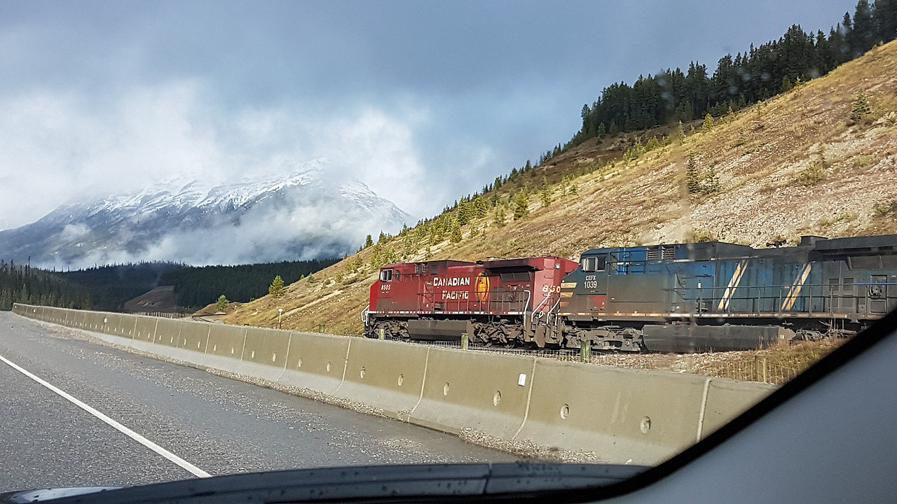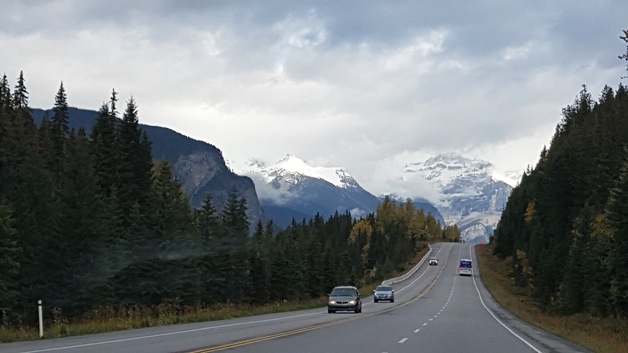 록키 산맥 주변은 고원 지대라 기후가 시시각각으로 변한다. 호텔을 떠날 때의 푸른 하늘은 구름으로 덮였고 눈과 비가 섞여 내리는 구간을 통과하고 있다.