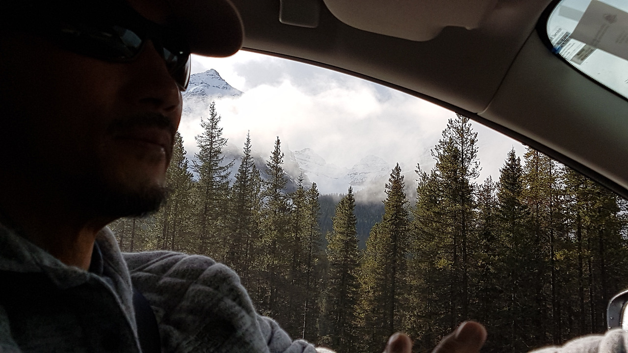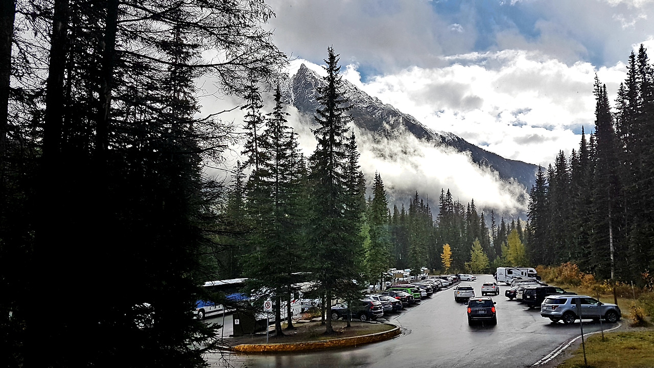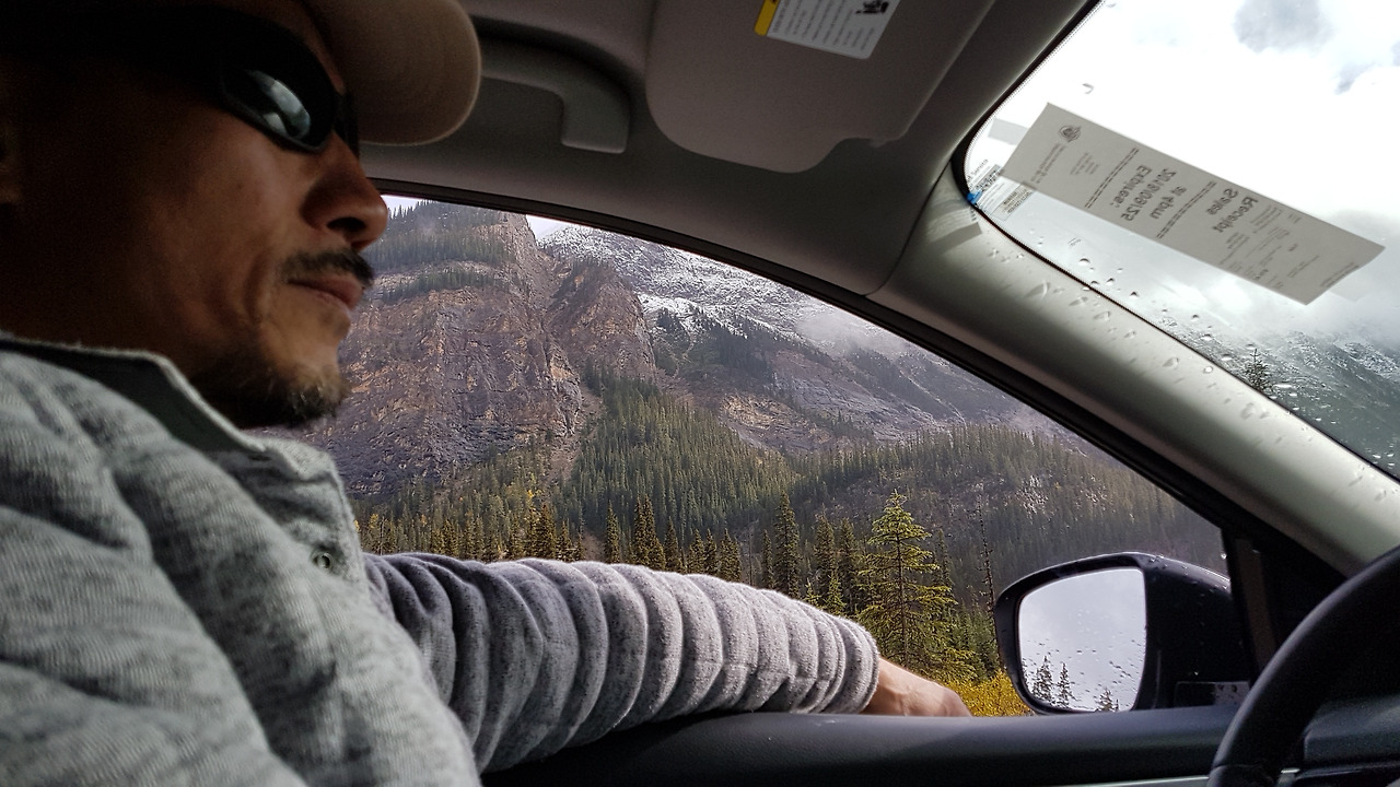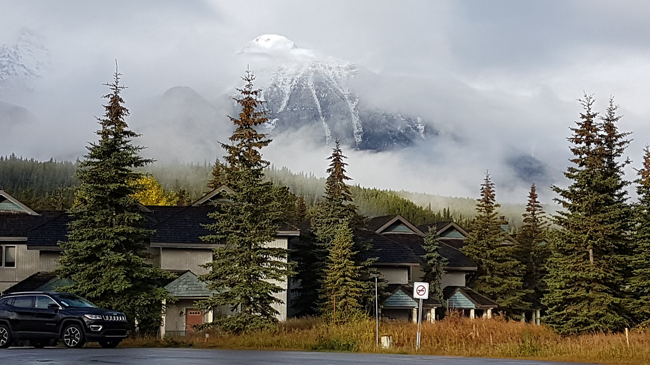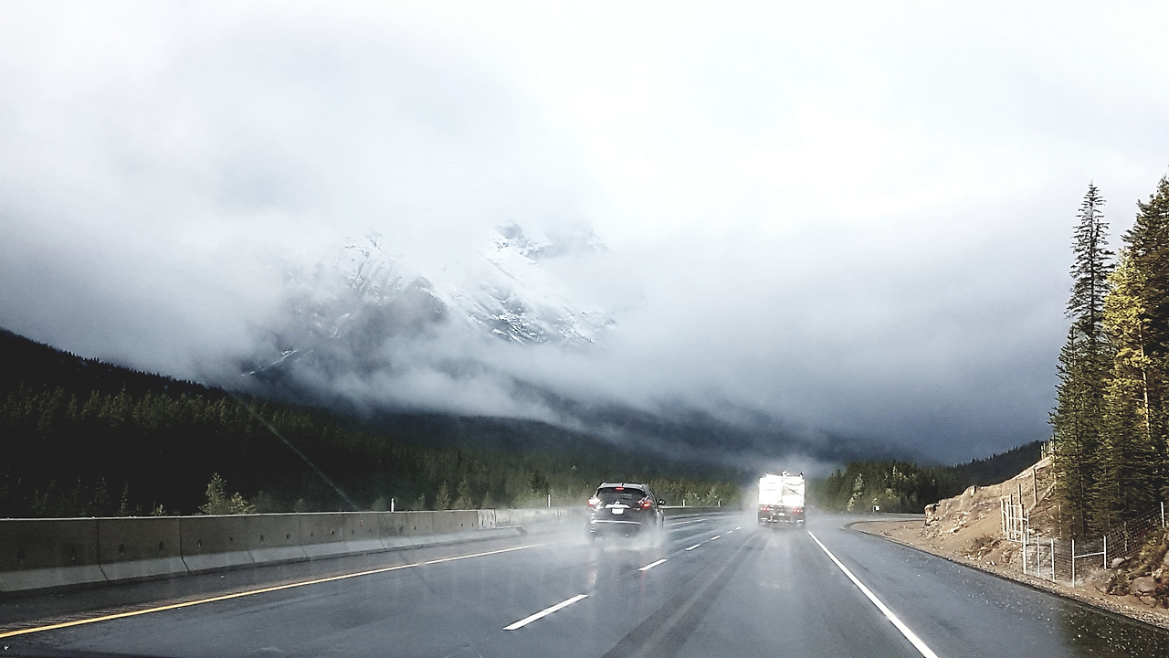 록키 산맥 주변은 고원 지대라 기후가 시시각각으로 변한다. 호텔을 떠날 때의 푸른 하늘은 구름으로 덮였고 눈과 비가 섞여 내리는 구간을 통과하고 있다.