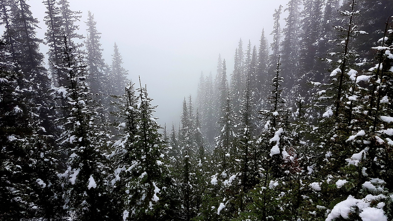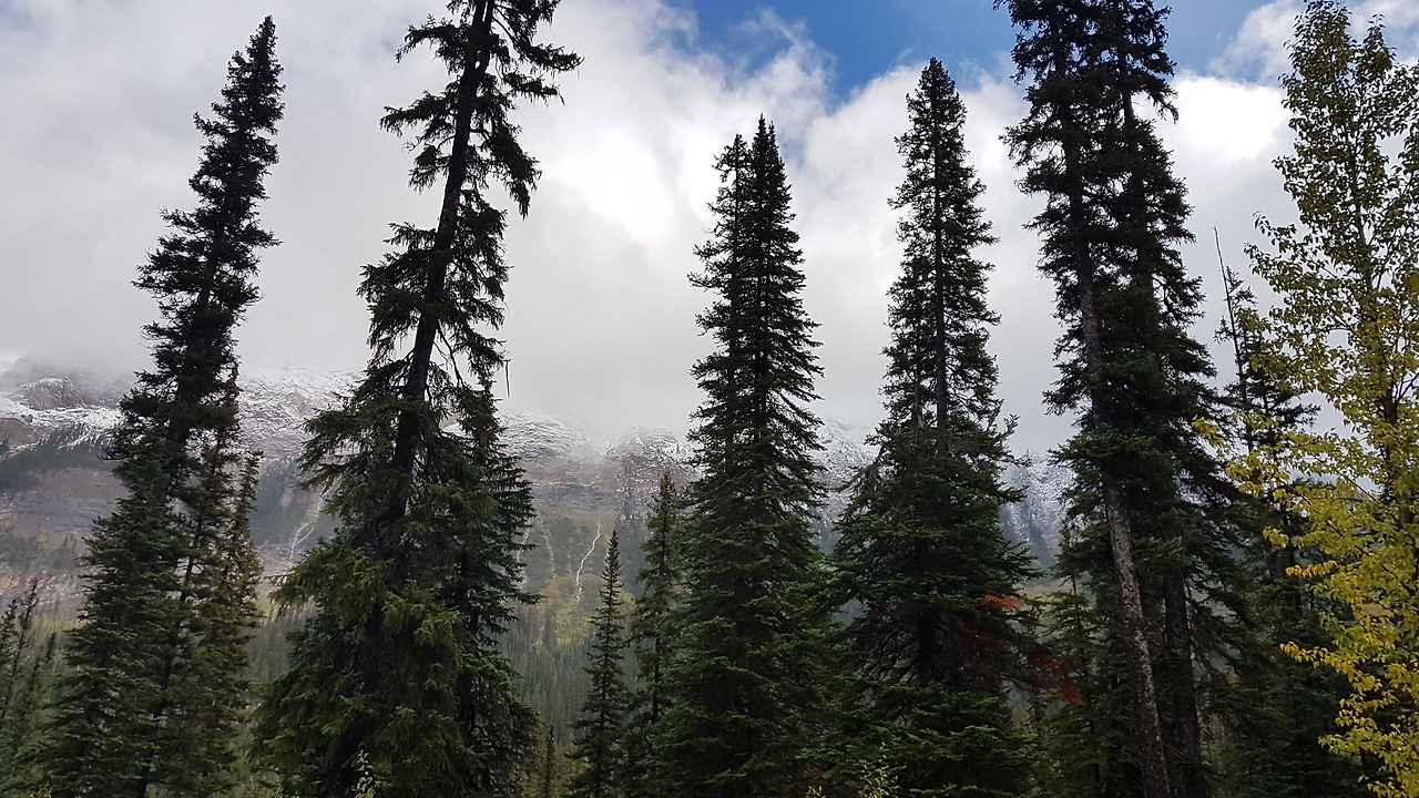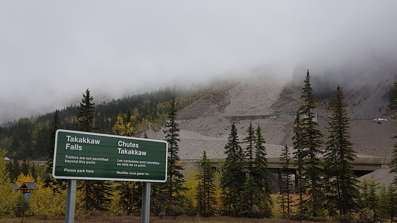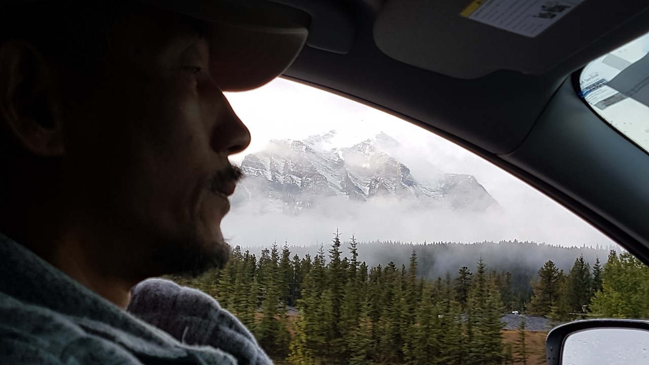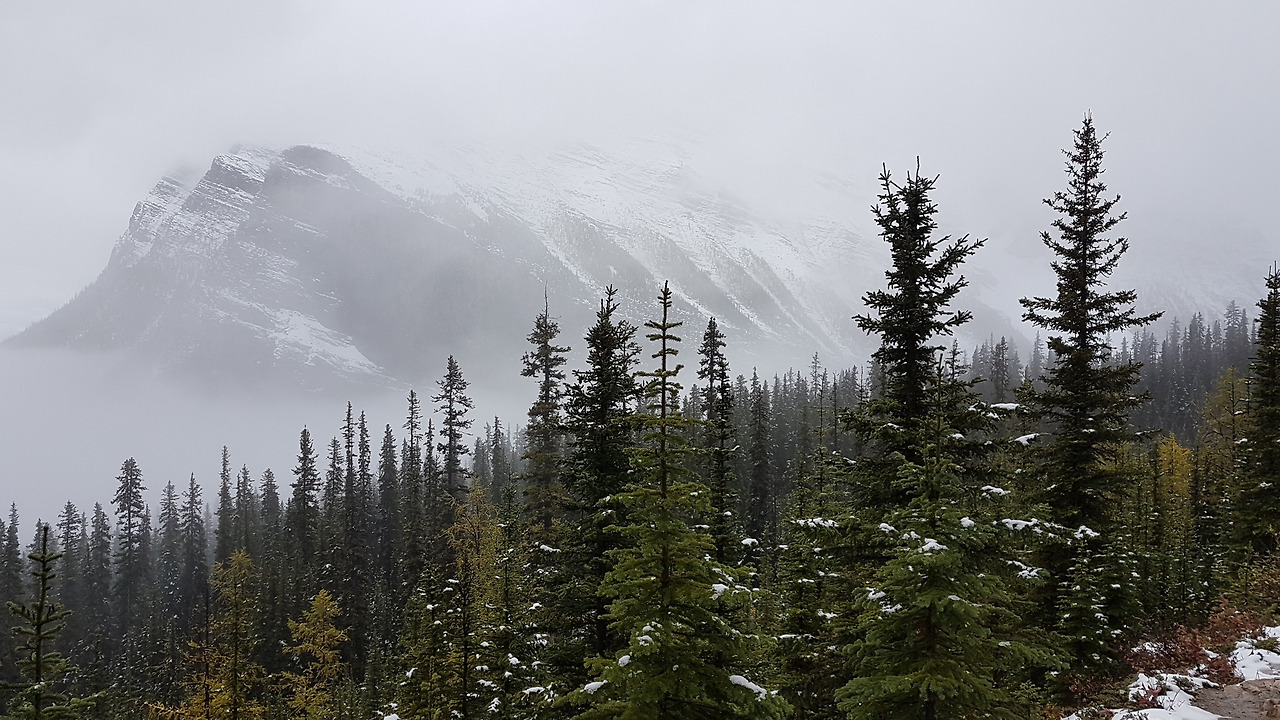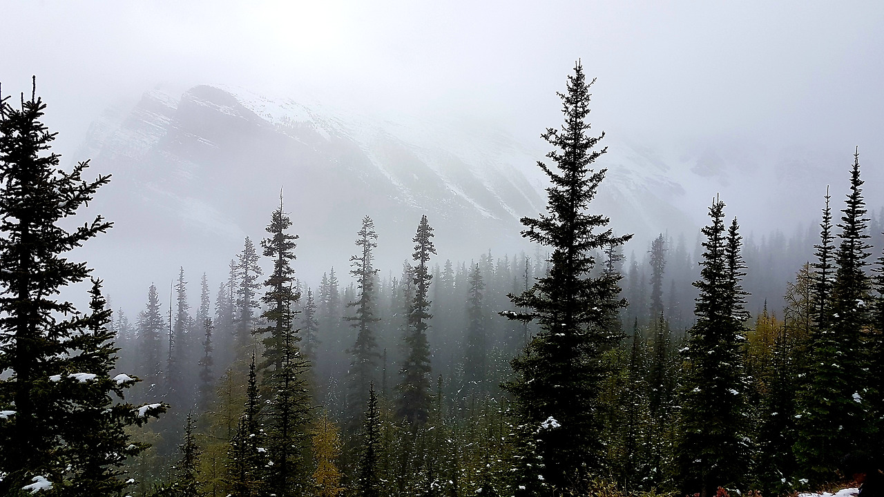 록키 산맥 주변은 고원 지대라 기후가 시시각각으로 변한다. 호텔을 떠날 때의 푸른 하늘은 구름으로 덮였고 눈과 비가 섞여 내리는 구간을 통과하고 있다.