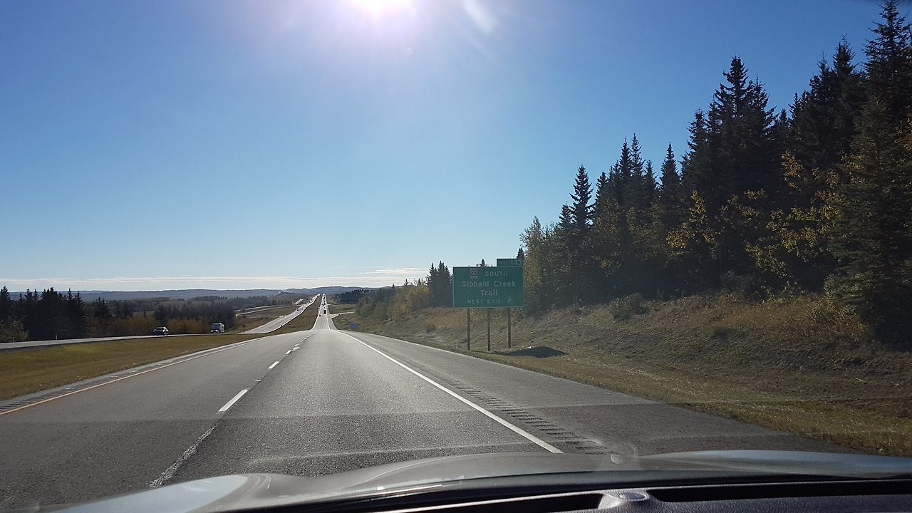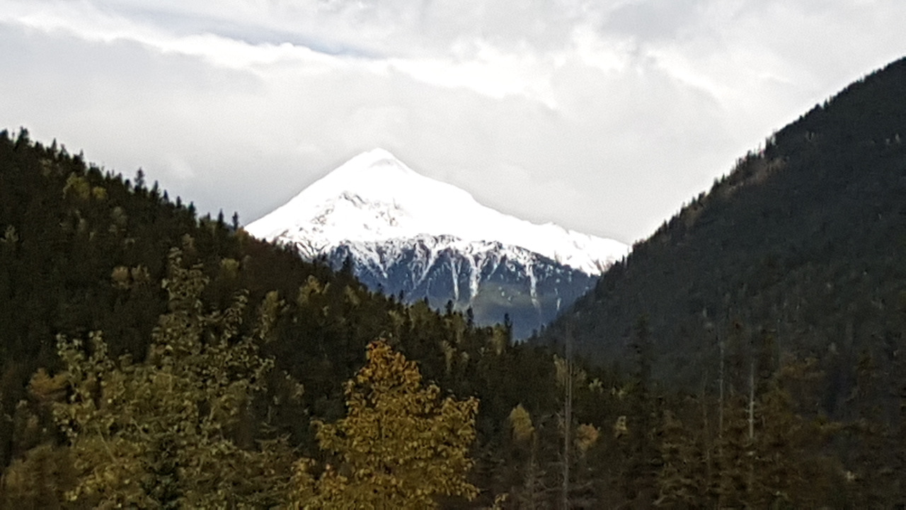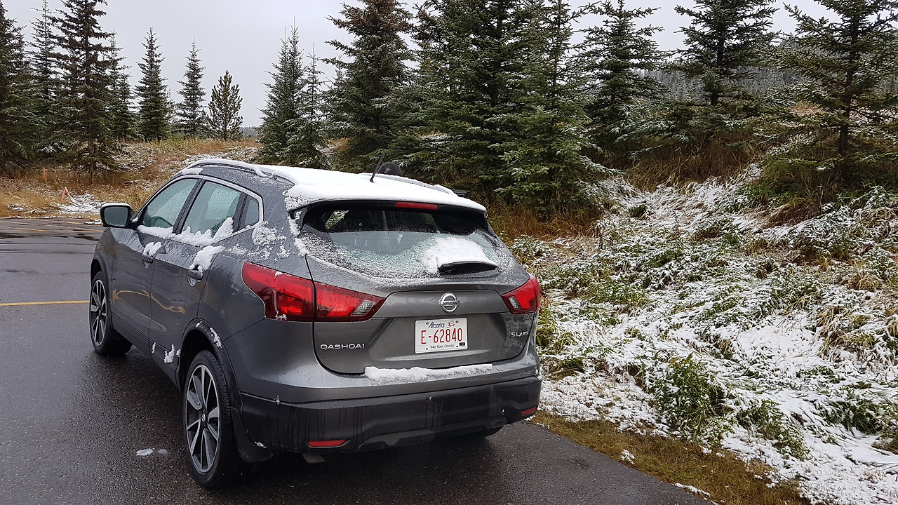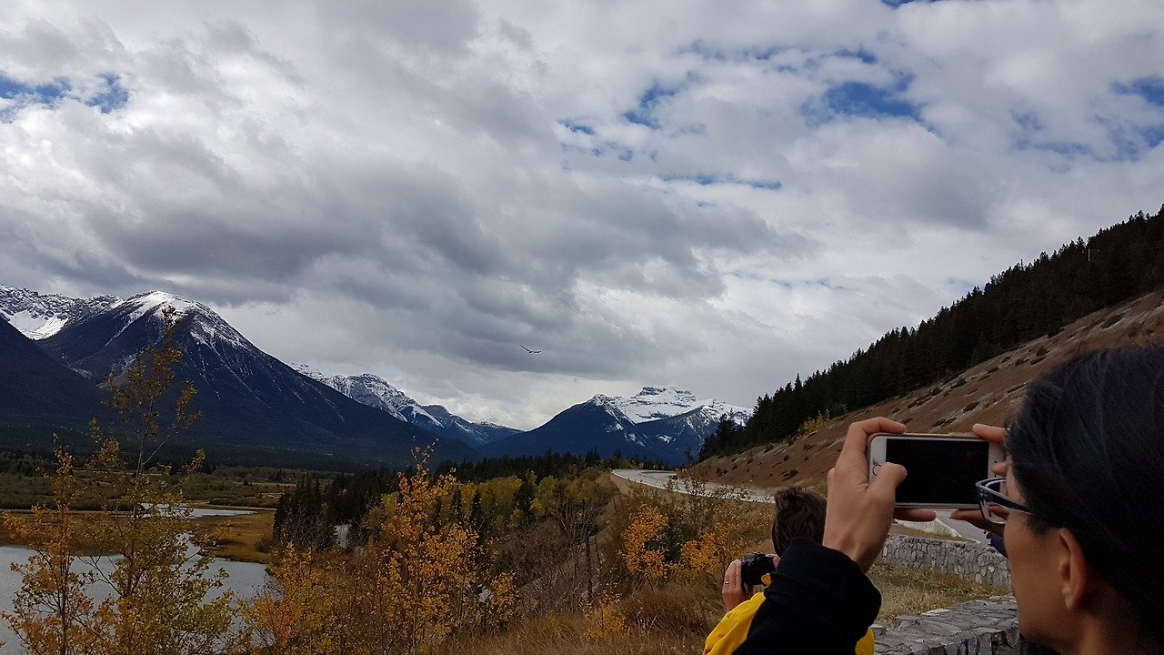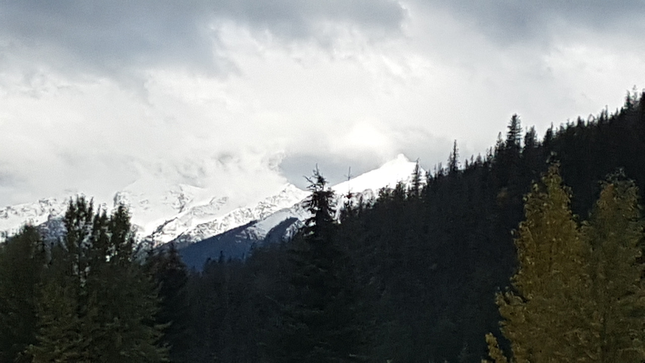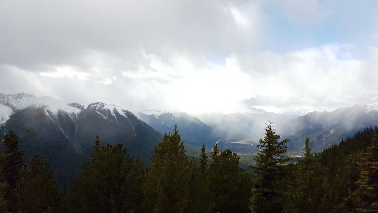 록키 산맥 주변은 고원 지대라 기후가 시시각각으로 변한다. 호텔을 떠날 때의 푸른 하늘은 구름으로 덮였고 눈과 비가 섞여 내리는 구간을 통과하고 있다.