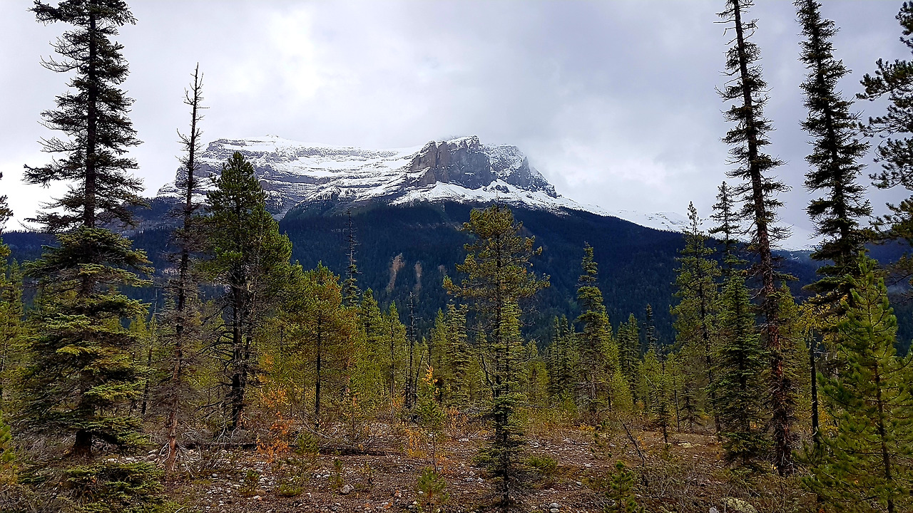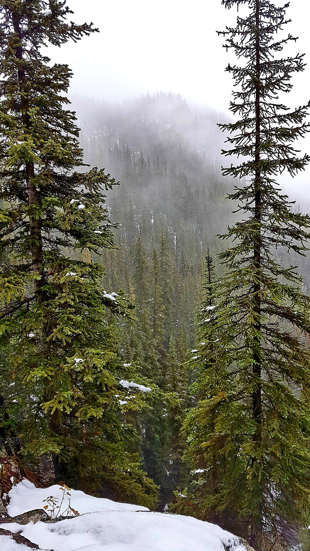 숲 속 길 어느 모퉁이를 돌아 계속 올라서자 갑자기 록키 산맥의 장관이 눈앞에 나타났다. 가득한 안갯속에서 펼쳐지는 빙하 가득히 덮인 산맥을 대하는 건 감동이었다.