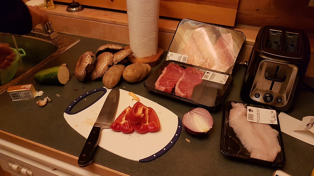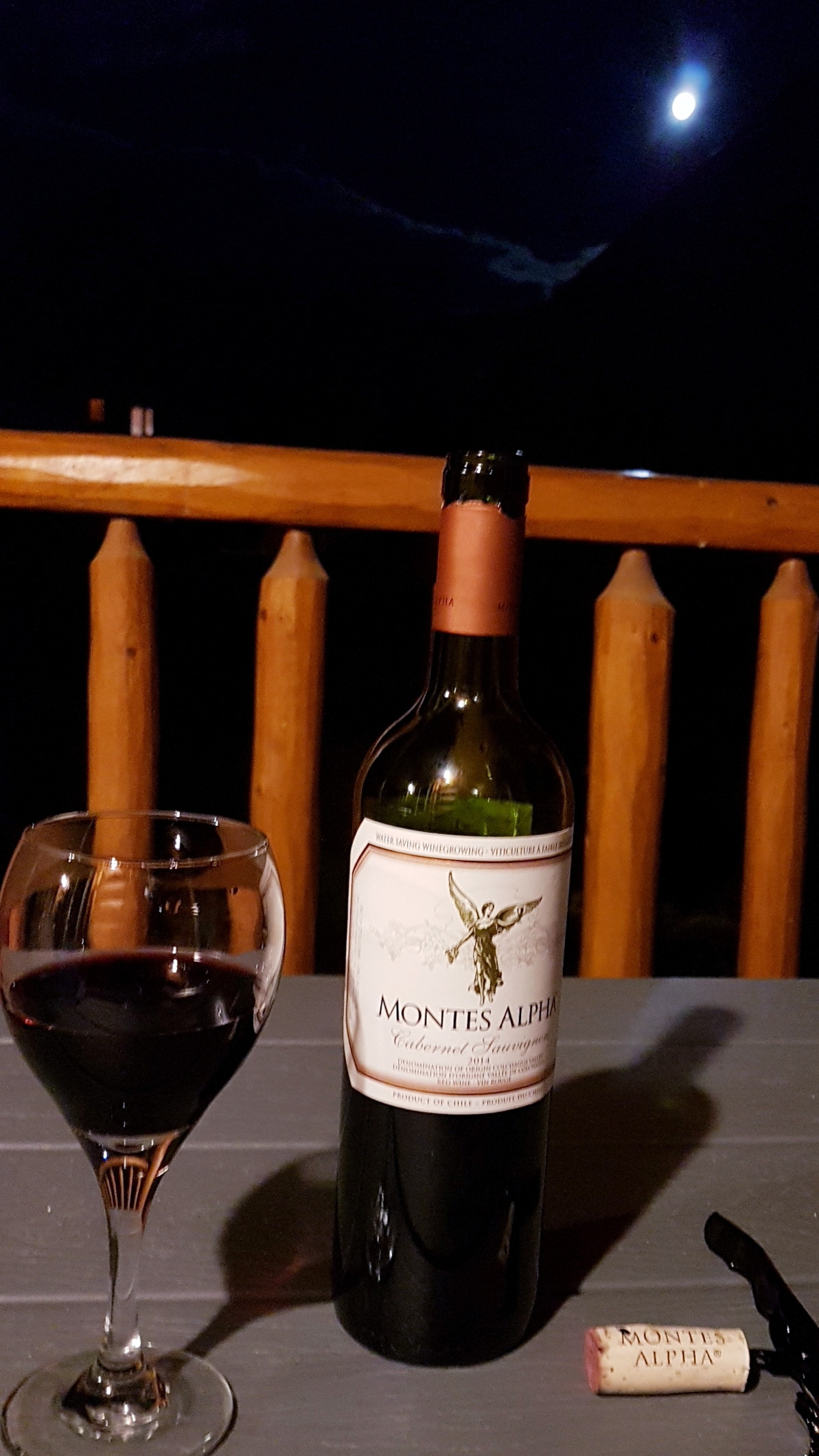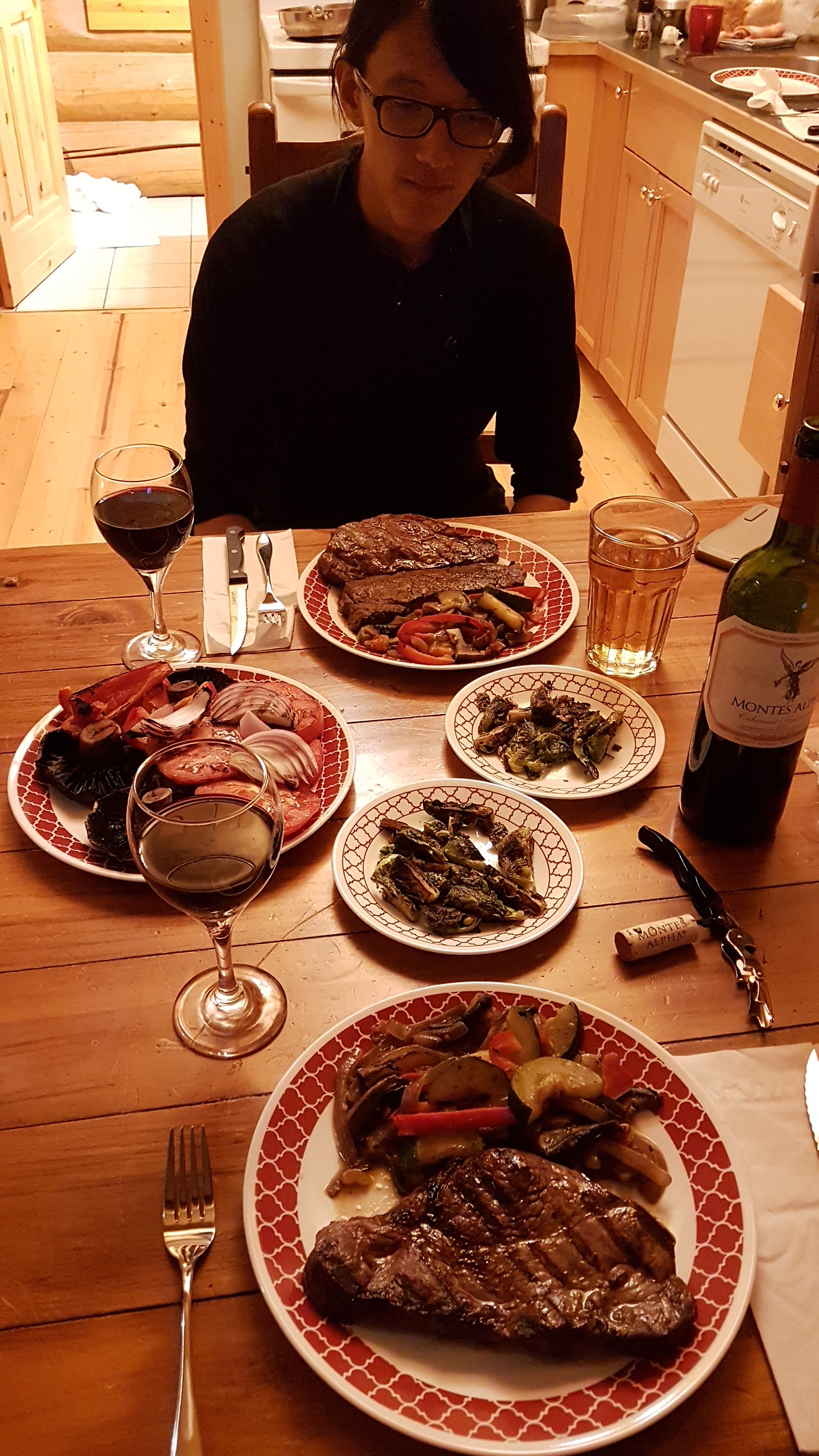 통나무 cabin엔 모든 조리 기구가 완비되어 있어 우린 밴프 시내에서 스테이크와 가자미 살, 각종 야채 등등을 사 와 마지막 날 만찬을 직접 만들어 먹었다. 와인은 한국에서 자주 마시곤 했던 Montes Alpha 2014년 산 Cabernet Sauvignon.