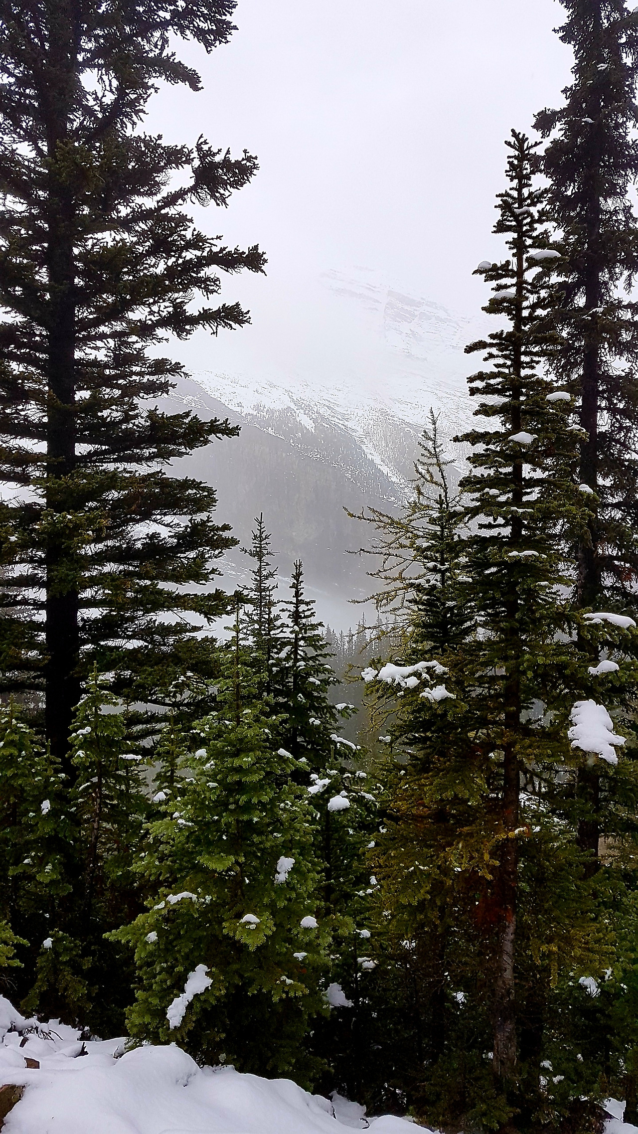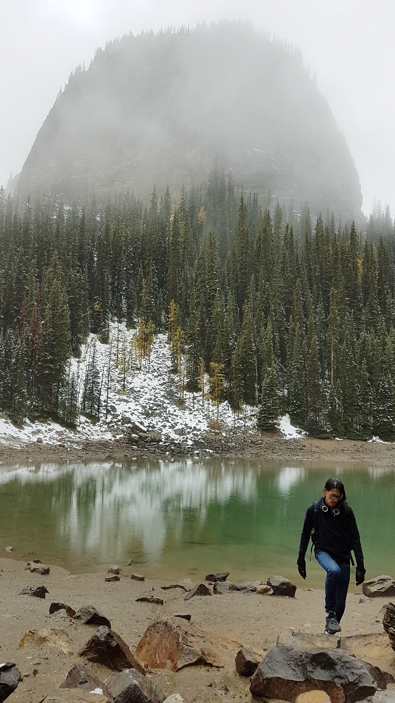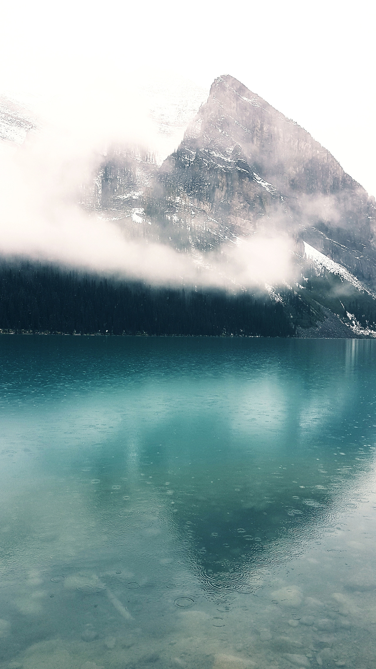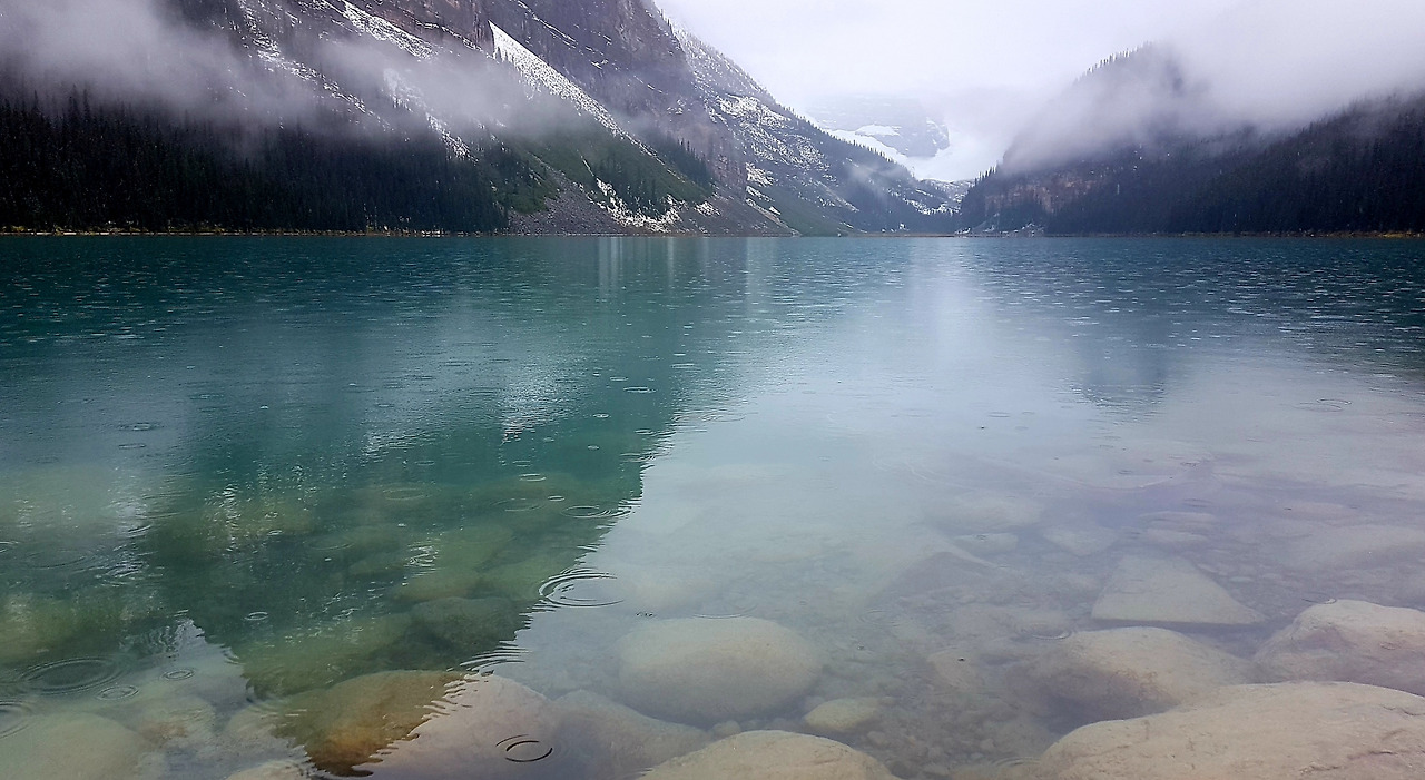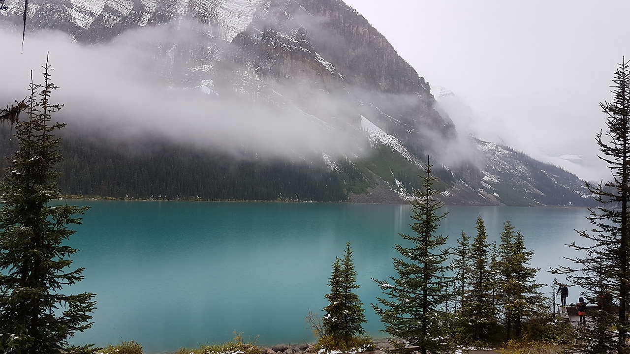 차가운 아침 안갯속의 레이크 루이즈의 빛깔은 맑고 따뜻한 날에 비해 초록보다는 푸른빛이 더 돌았다.
