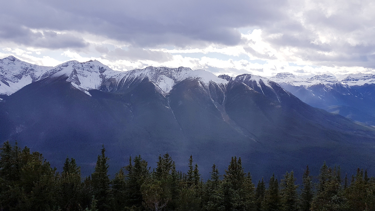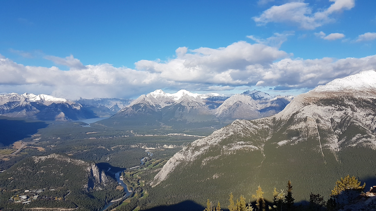 정상에서는 록키의 봉우리들과 산맥들이 사방으로 펼쳐져 있었다.