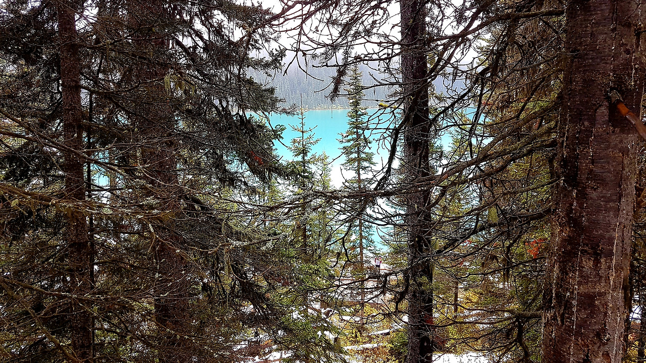 래이크 루이즈로 하산하는 길에 아침 안개가 어느 정도 가신 호수의 아름다운 터쿠아즈 turquoise 빛깔은 신비스러웠다.