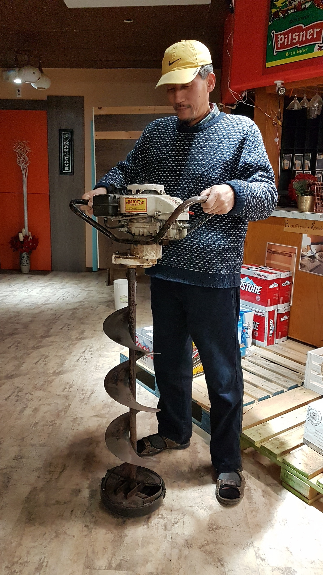 글렌에게 대형 gasoline powered 오거를 빌리기전 난 수작업으로 돌려 뚫는 무동력 오거를 구입했었는데 아무래도 수동으로 뚫을 경우 이 정도 두께의 얼음인 경우 수시간이 걸릴것 같았다. 구멍의 지름도 훨씬 작을 뿐더러.. ㅎ