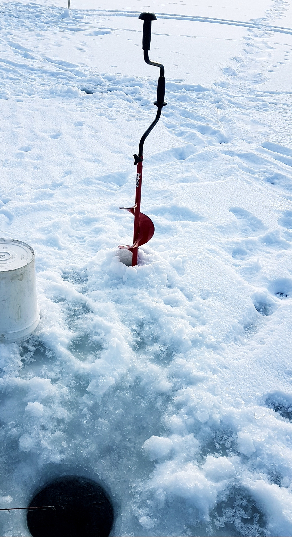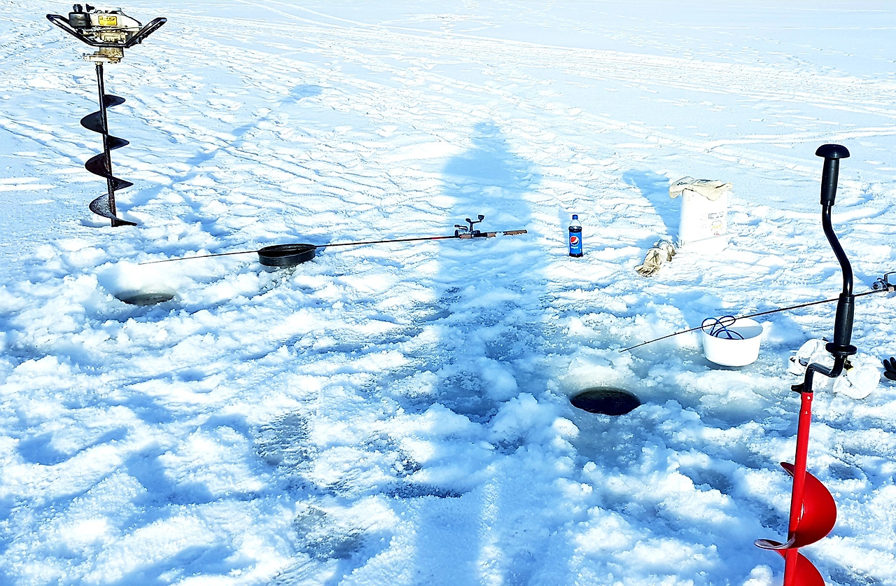 자 이제 얼음을 뚫어야지. Glen에게 빌린 가솔린 엔진이 달린 오거(auger)는 혼자 들기도 버거울 정도로 무거운 놈이다. 초크를 서너번 눌러 연료 공급을 해주고선 엔진의 시동을 거는 끈을 서너차례 잡아 당겨 부릉~ 시동을 건 다음 핸들 악셀 레버를 당겨 블레이드 회전 속도를 충분히 높힌 다음 아래로 힘을 가한지 30여 초 만에 구멍으로 호수물이 쏟아져 나오며 홀 뚫기가 끝났다.