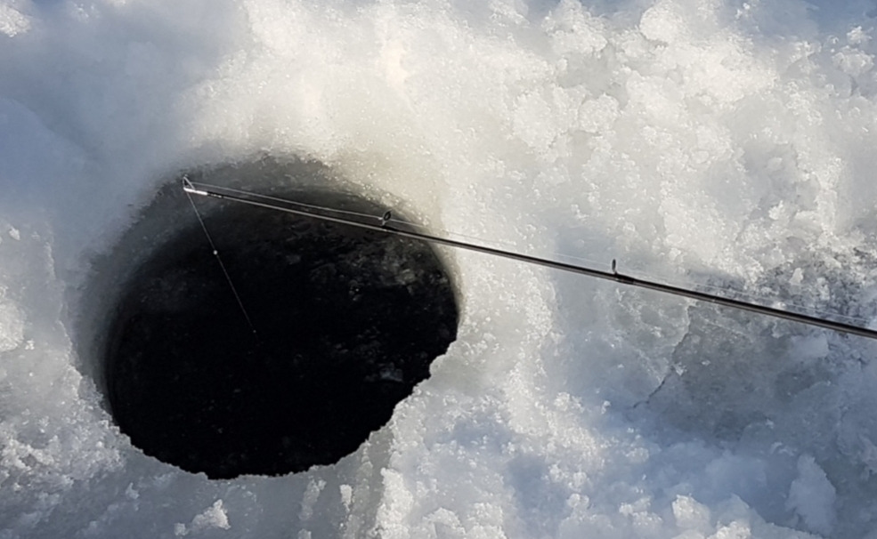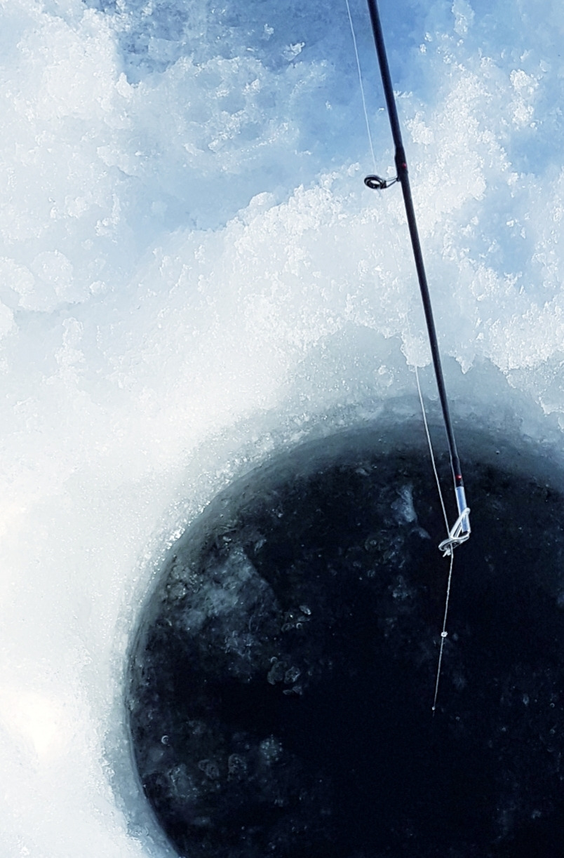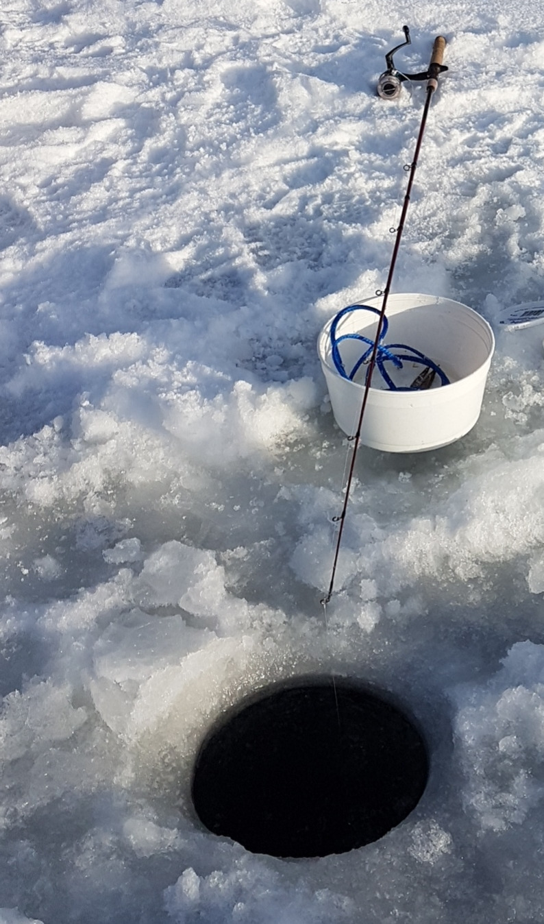좌간 뚝딱 두개의 구멍을 손쉽게 뚫은 후 송사리(minnows) 미끼를 달아 낚시대를 드리웠다.