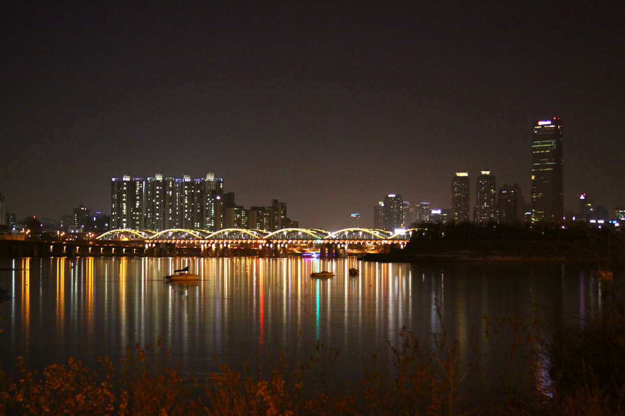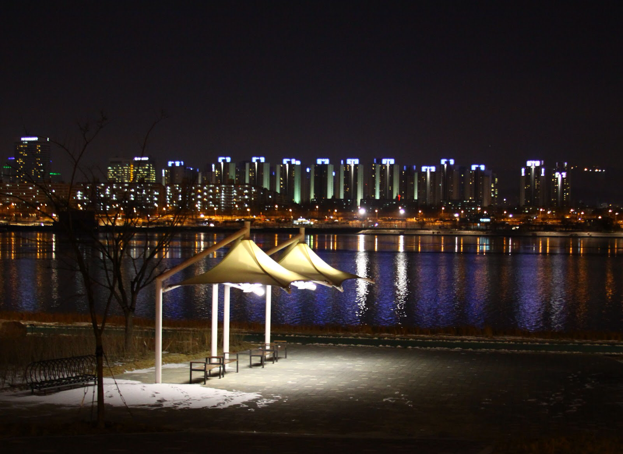 기온이 많이 떨어진 겨울밤. 동생과 나온 저녁 산책길의 한강 주변 역시 대단했다.