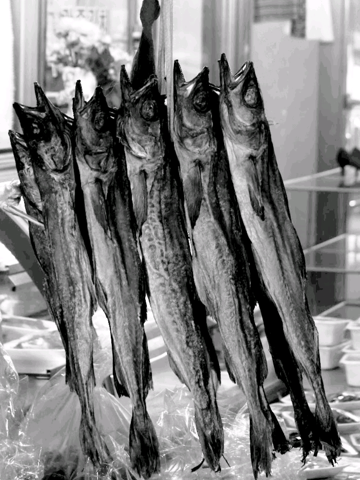 돌만큼 딱딱하게 굳은 북어를 빨래 방망이로 두드려 펴면 그 황금색 속살이 금세 드러나곤 했고 북북 뜯어내서 살짝 구워 고추장에 찍어 먹던 맛은 어떤 간식이나 안주도 따라올 수가 없을 정도의 독보적 식감과 맛이었다.이러한 이미지들을 대할라 치면 카메라를 든 내 팔은 저절로 들어 올려지고 내 눈은 뷰파인더 속을 헤매곤 한다. 얼마나 다정스러운지.. 명태 안주와 한잔 할 때면, 언제나 가곡 '명태'를 불러 제치곤 했던 대학 선배가 생각나지 않을 수 없다.