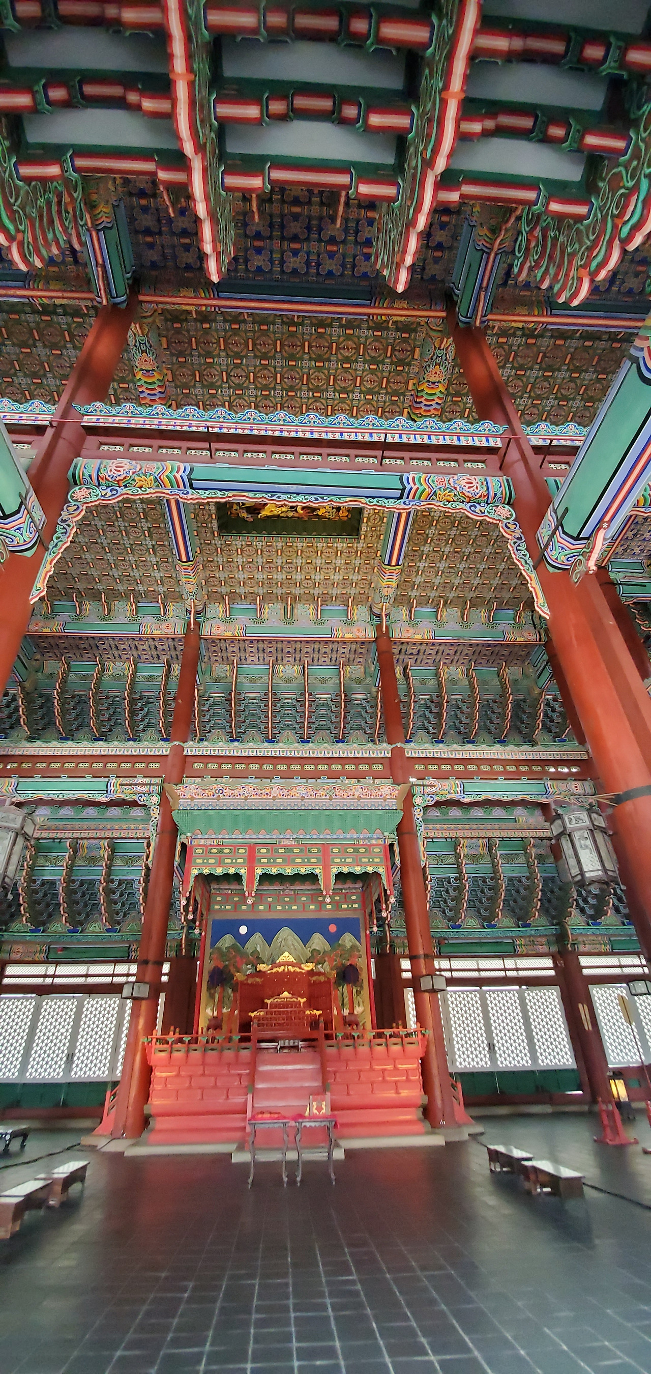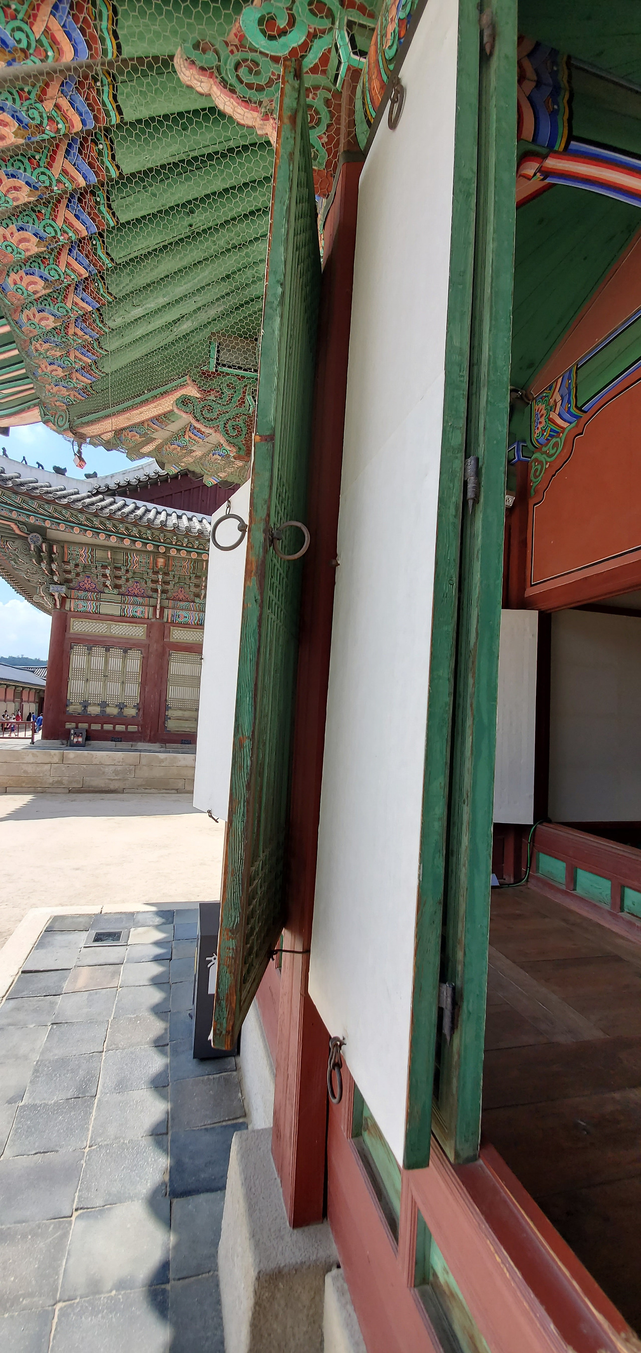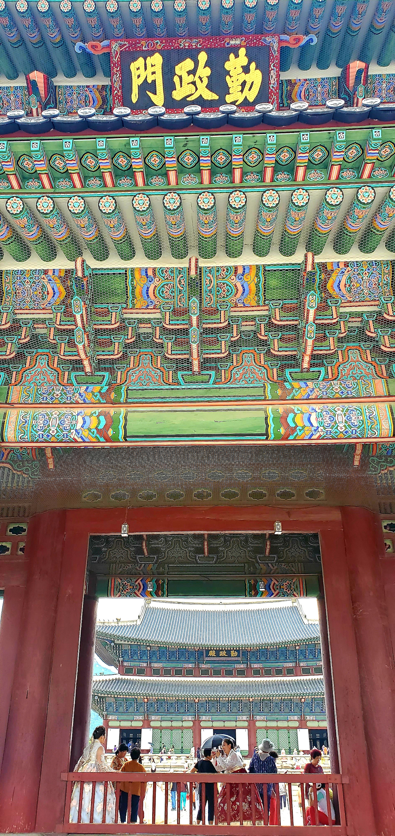 언뜻 화려해 보이지만 불교적 색상의 조합이 그리 어지럽거나 난하지 않고 높이에 따라 겹겹이 층을 이루며 올려진 구조물들이 적당한 간격과 모양으로 서로 어우러지면서 난 이곳 근정전을 올 때마다 하염없이 이 공간을 살펴보게 된 지 오래다. 부지런히 정무를 살피는 곳..이라는 근정전이라는 명칭도 얼마나 솔직하면서 단도직입적인가. ㅎ
