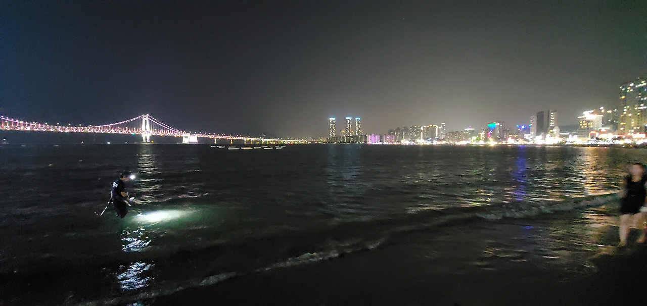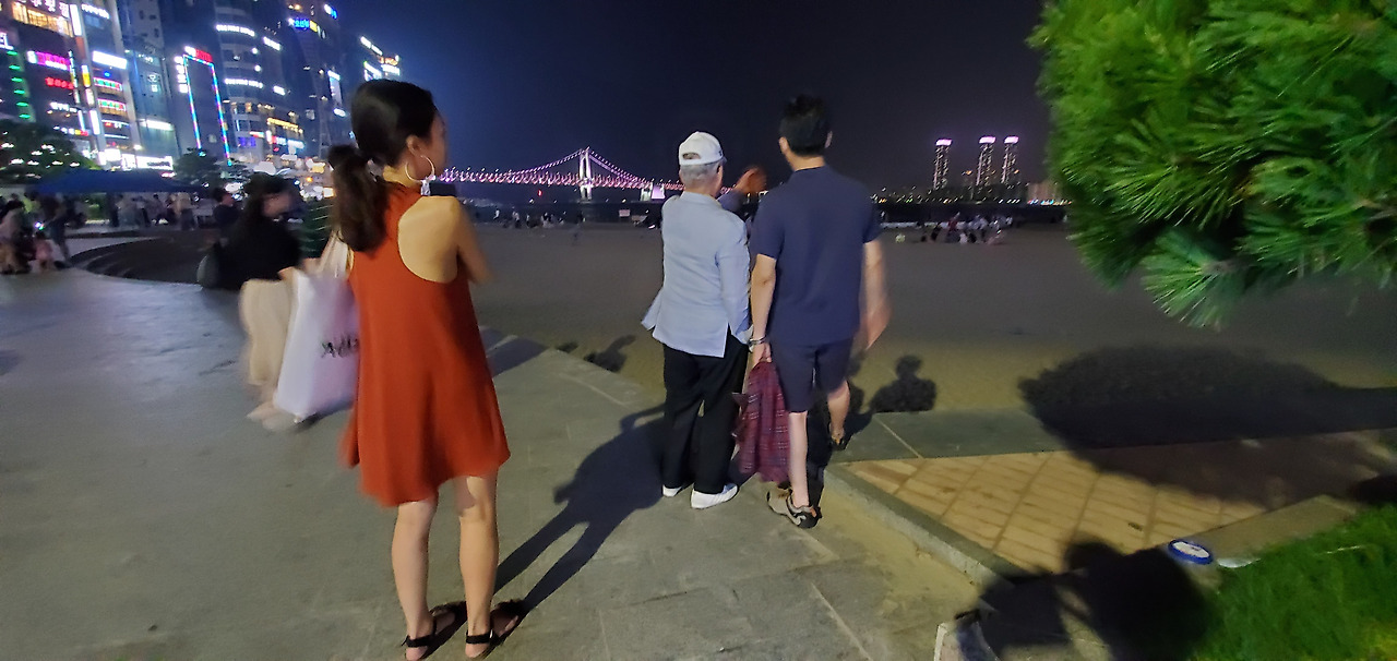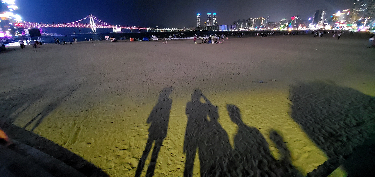 When it comes to a night Pusan turns into an another different place to walk around for more fun. We as a whole family with my dad, a brother, a cousin, and my daughter were hanging around the beach for a while.