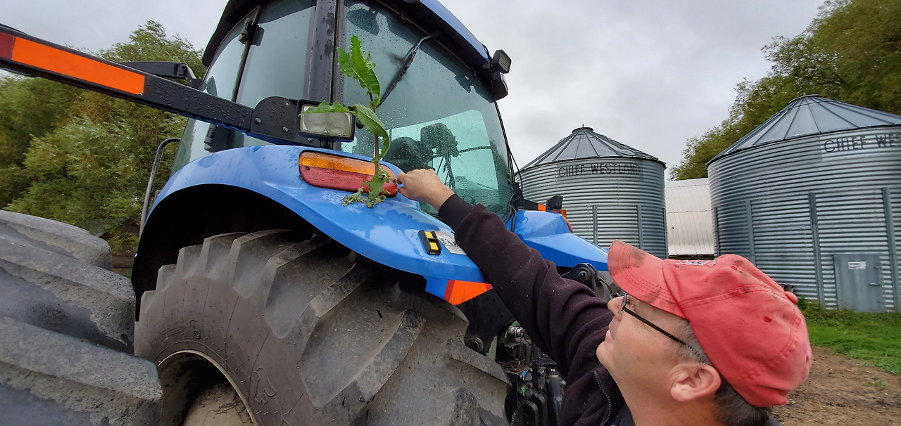 그의 거대한 트랙터의 램프 틈바구니를 뚫고 잡초가 커다랗게 자라나오고 있었던것. ㅎ