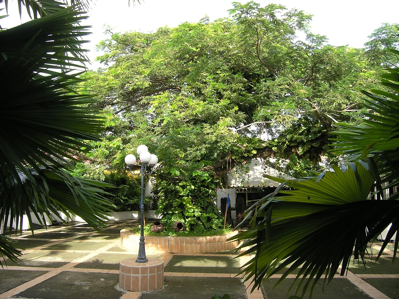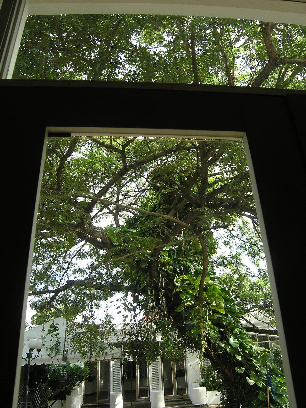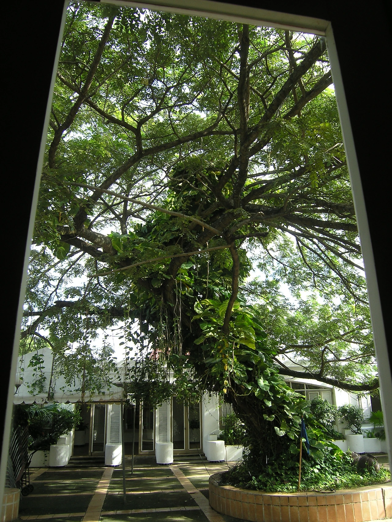 어마어마한 크기의 나무가 스페인 풍의 아담한 정원 중간에 자리하고 있었는데 그 나무의 호기심 많은 한 가지가 호텔 회랑 문의 창틀 사이를 비집고 안으로 들어오고 있었다.