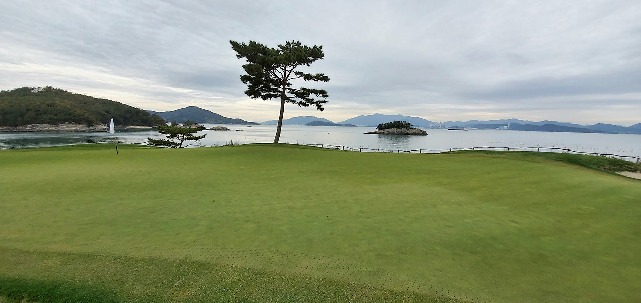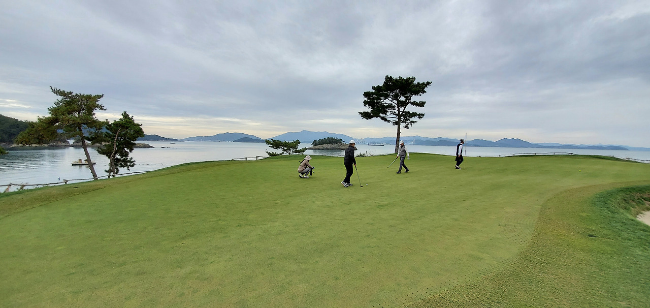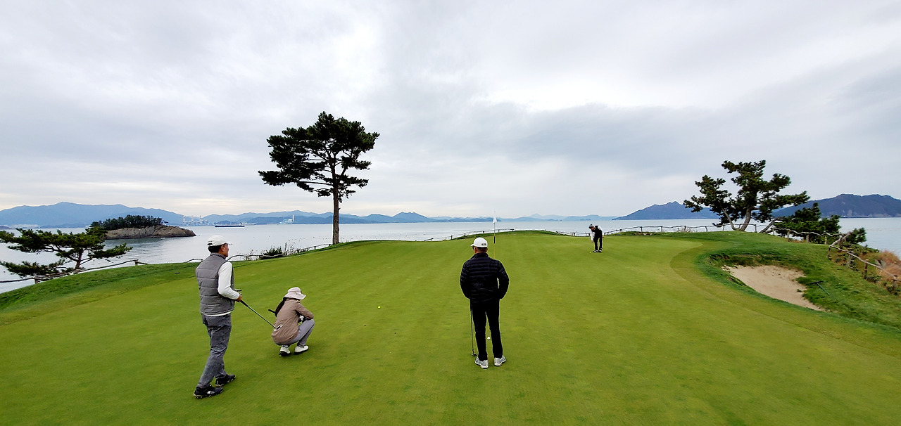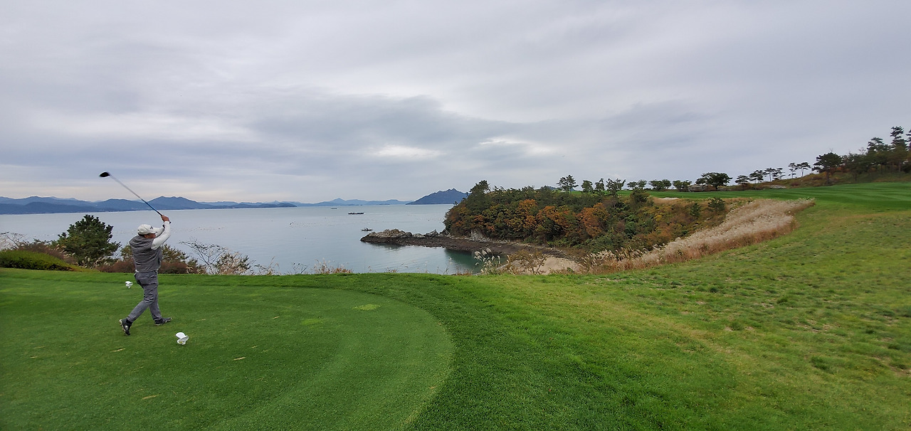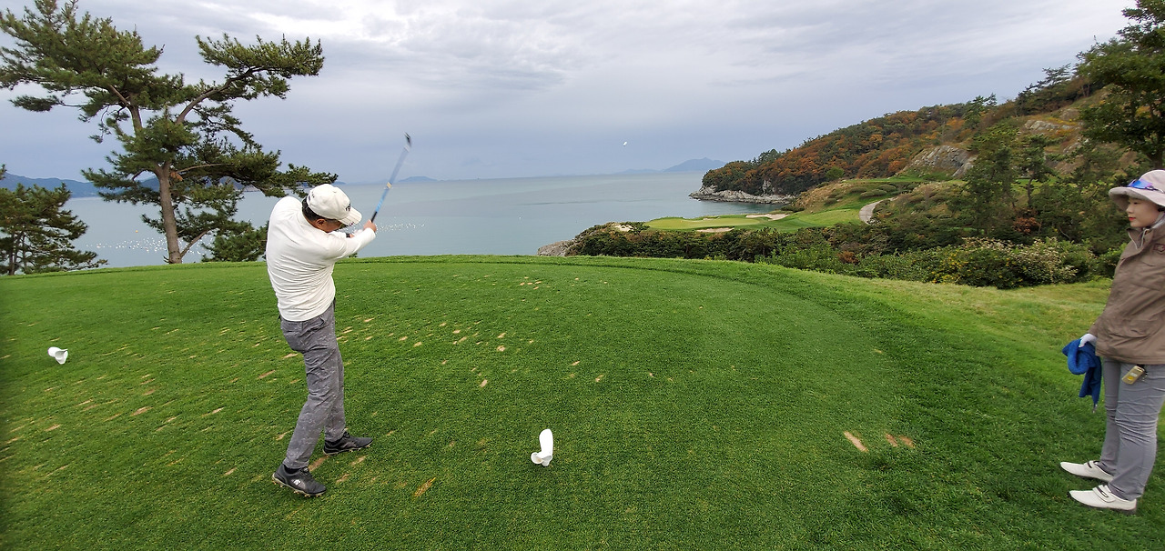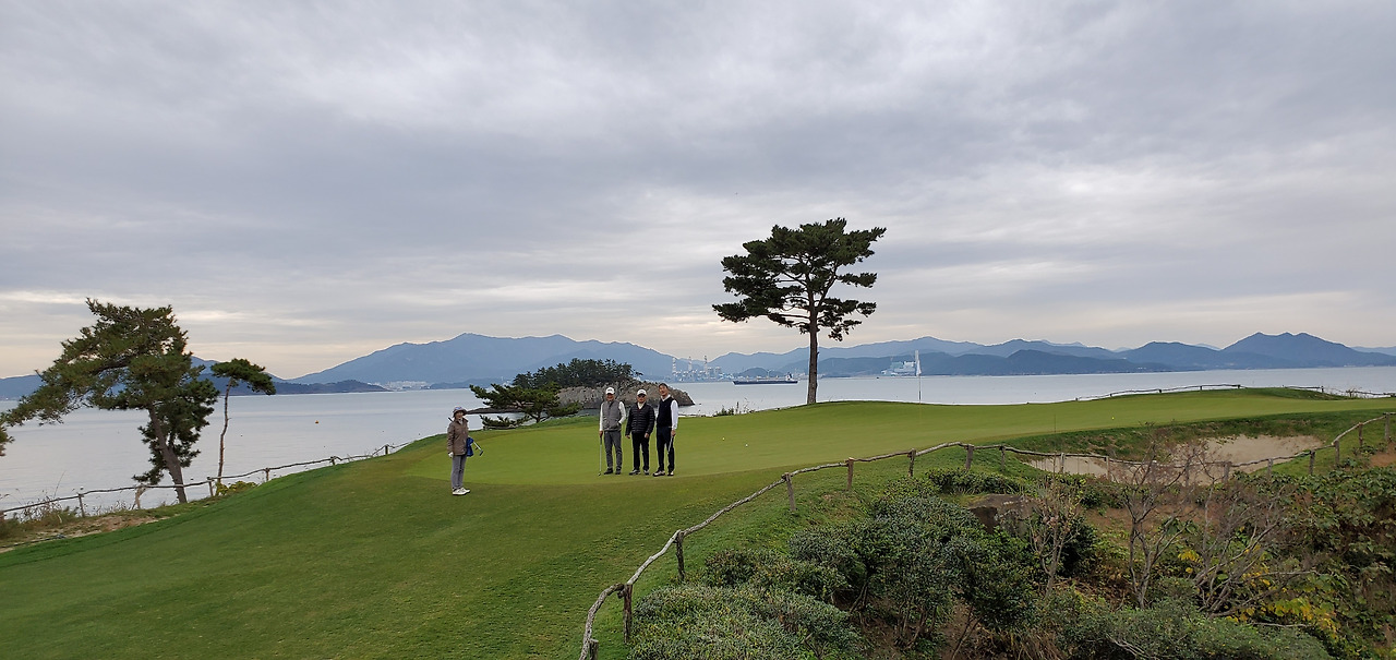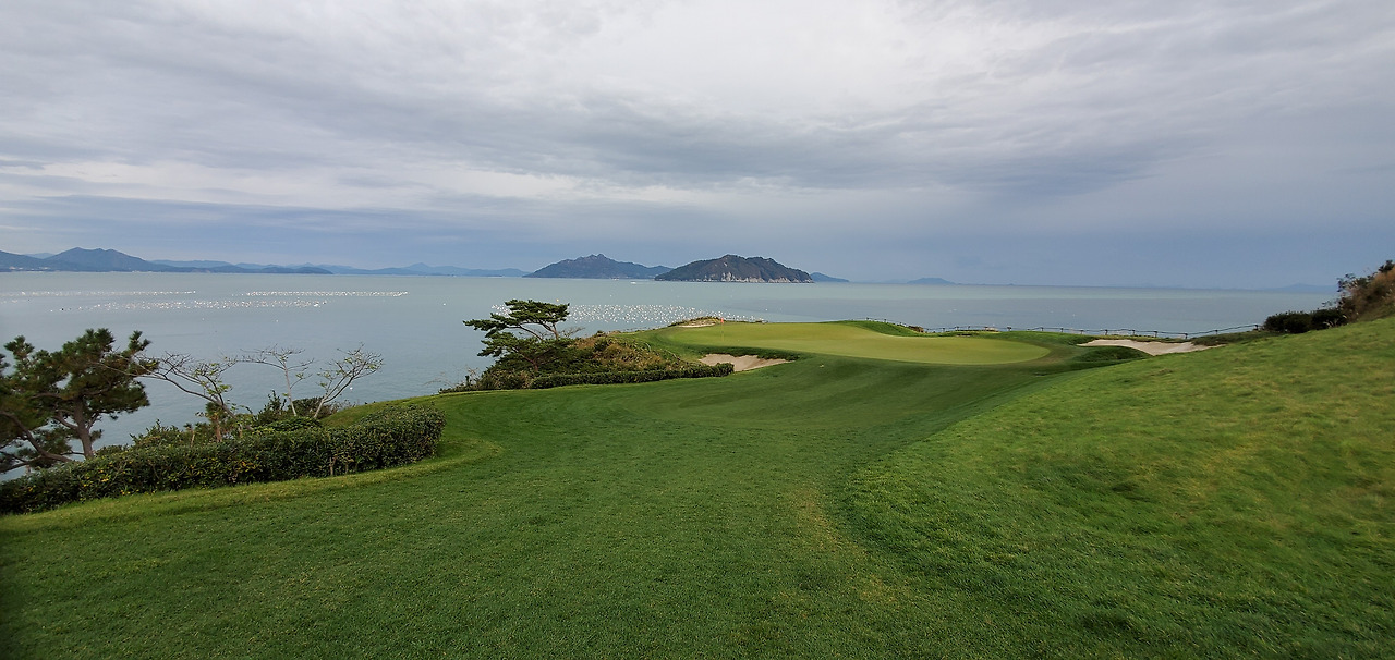 하드웨어를 소프트웨어가 전혀 따라가지 못하고 있었다고나 할까. 최고의 입지에 막강한 건축물의 넓직한 panoramic space 에서 hospitality service가 따라 주지 못함은 정말 안타까웠다. 나름 고가 원목 그랜드 피아노의 자동 연주는 볼륨이 너무 크게 조정되어 있어 황당했다. It was so annoying and weird. 과시적 촌스러움이랄 밖에는.. 또다른 경악스러움은 리조트 객실에 비치된 물품 목록이었다. 접시, 물잔, 찻잔, 포크 등등 객실에 비치된 모든 잡다한 물품들에 대해 그것이 없어졌을때 게스트들이 물어 내야 하는 금액들이 협박적 의미로 나열되어 있었다. 커피잔 하나에 십만원 어쩌구. 얼마나 많은 숙박객들이 그냥 들고 갔으면 이런 황당한 경고성 공지를 해 놓았을까 라는 생각이 들면서도 불쾌함이 극에 다랐다. I would never come again for sure. 다행히 리셉션 데스크를 비롯한 전반적 고객응대를 담당하는 직원들의 자세는 나무랄데가 없었다. 특히 이틀간 두번의 라운딩 동안 경기 도우미 분들의 친절하고도 프로페셔널한 도움 역시 매우 인상적이었다. 식당과 객실 운영상의 우스꽝스러움에도 남해의 아름다움 속에서 최고로 관리되고 있던 개성 넘치는 18홀의 면면은 우리 모두를 감탄케 했다.