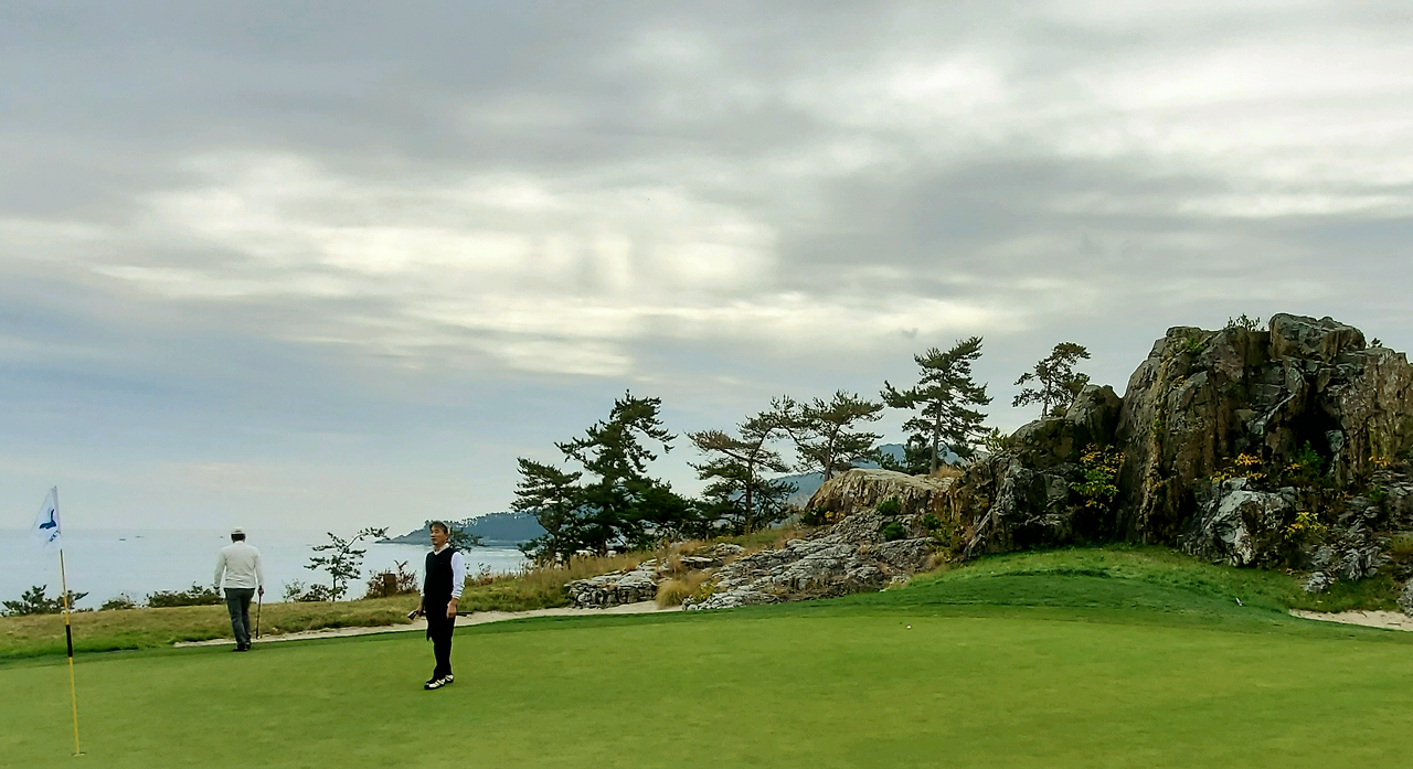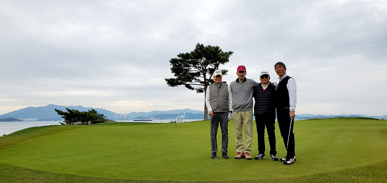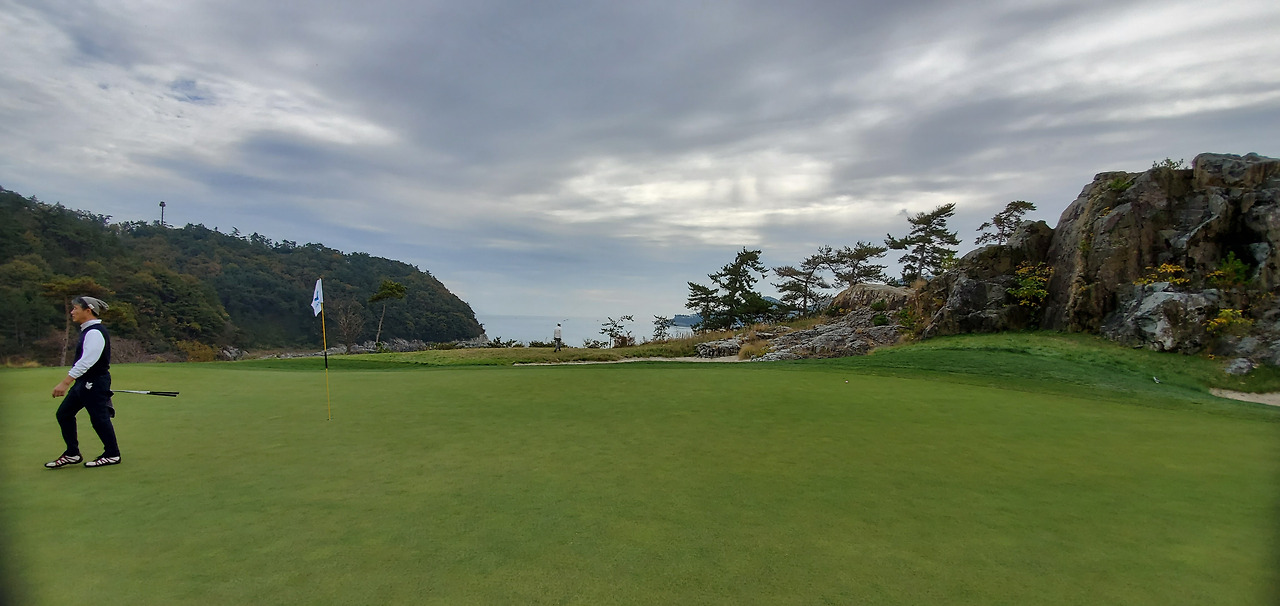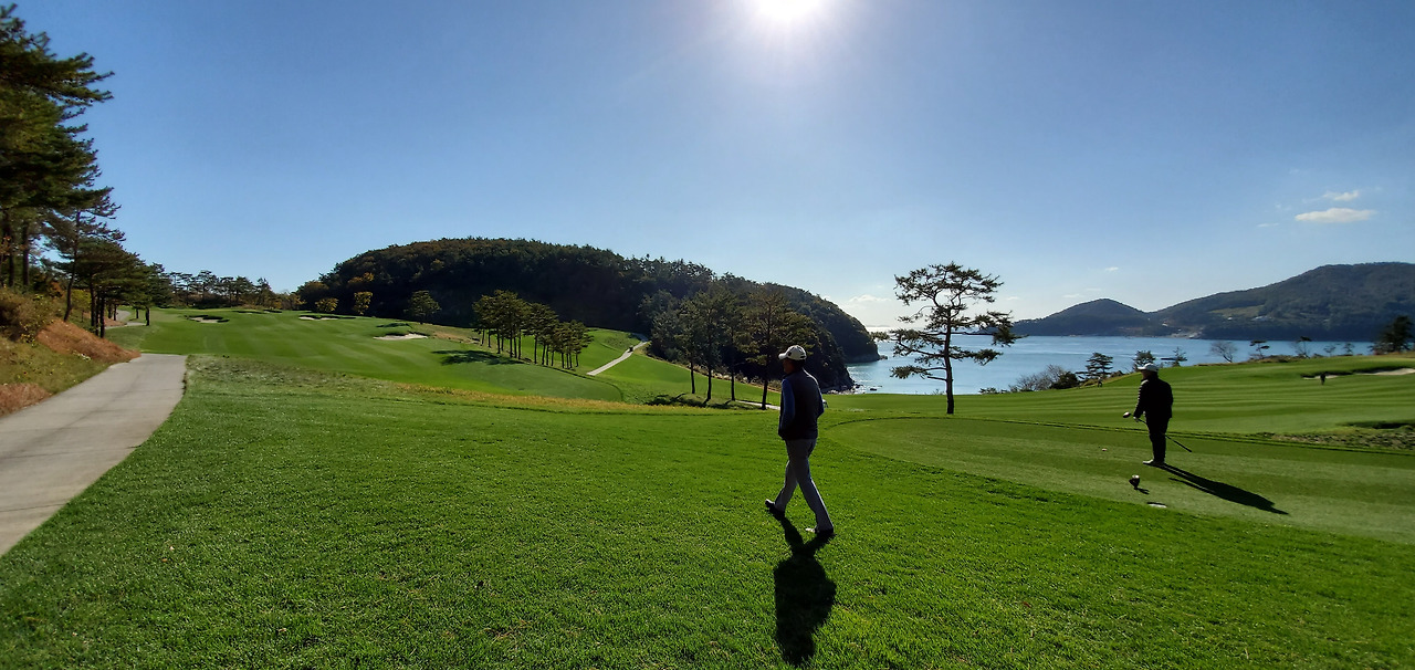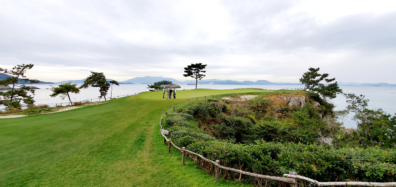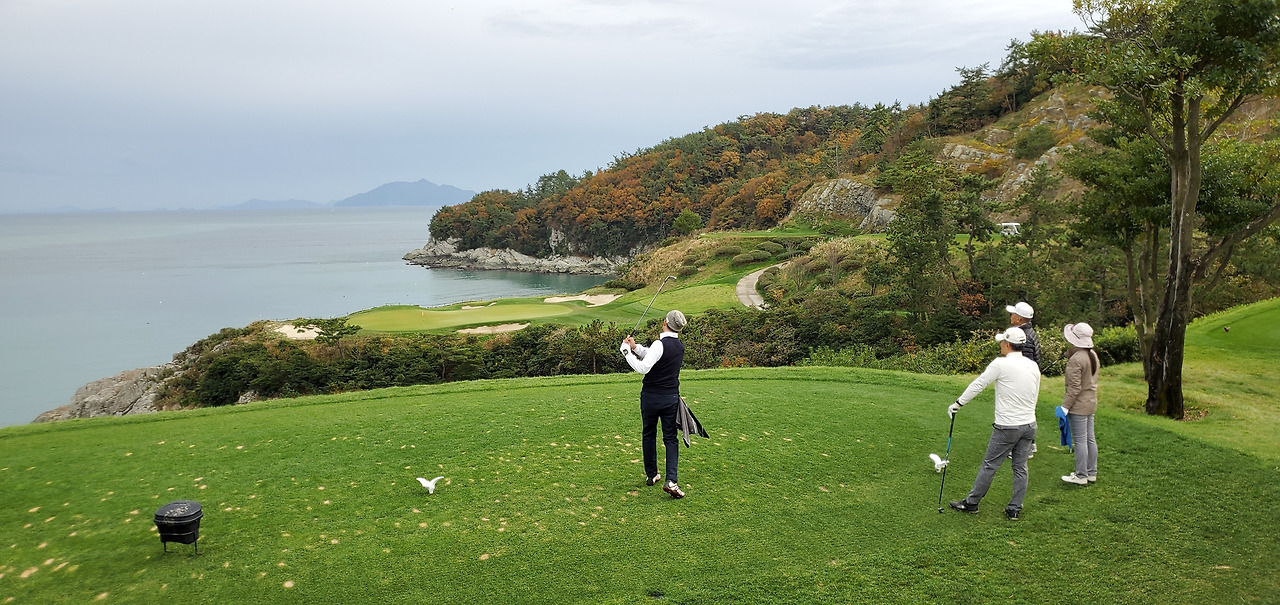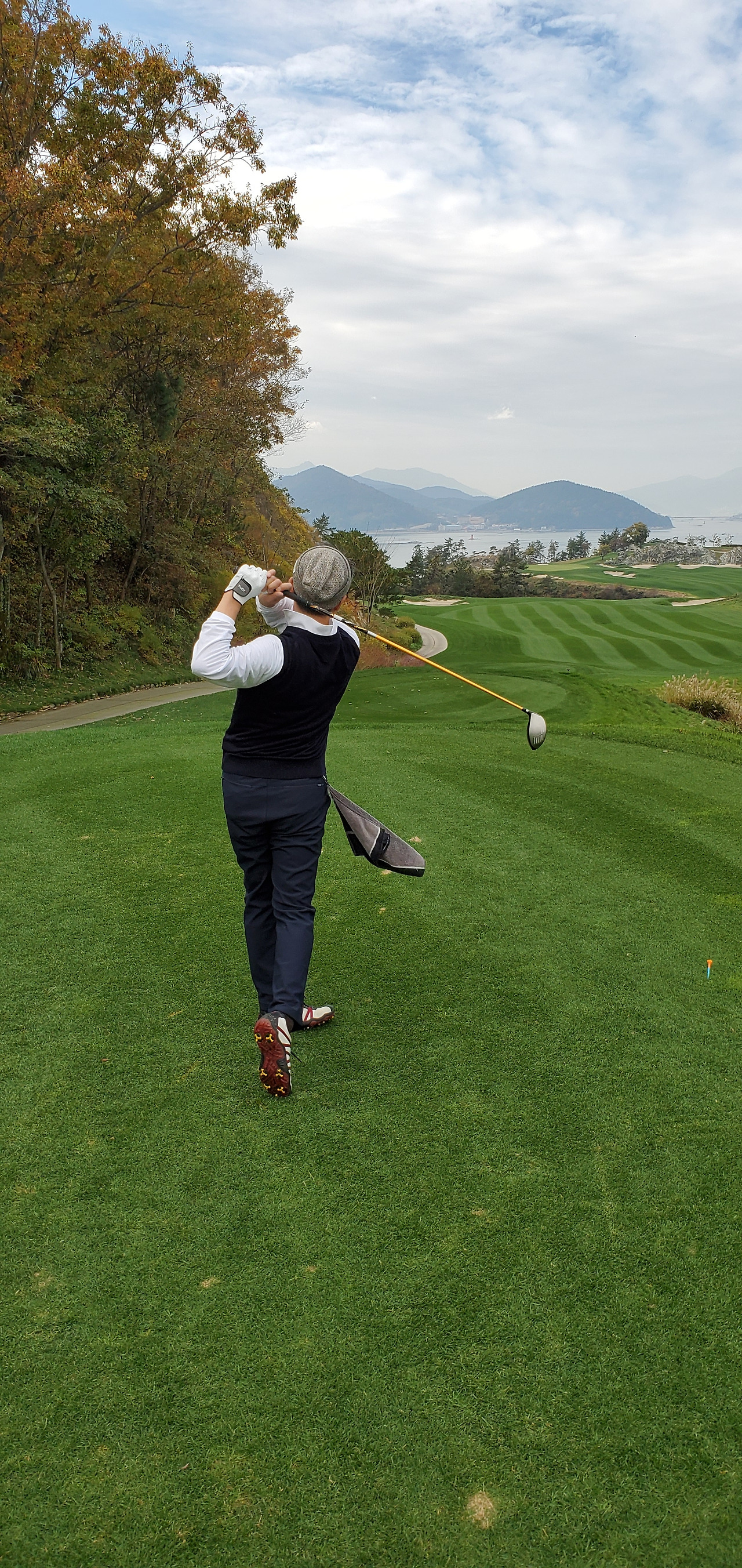 하드웨어를 소프트웨어가 전혀 따라가지 못하고 있었다고나 할까. 최고의 입지에 막강한 건축물의 넓직한 panoramic space 에서 hospitality service가 따라 주지 못함은 정말 안타까웠다. 나름 고가 원목 그랜드 피아노의 자동 연주는 볼륨이 너무 크게 조정되어 있어 황당했다. It was so annoying and weird. 과시적 촌스러움이랄 밖에는.. 또다른 경악스러움은 리조트 객실에 비치된 물품 목록이었다. 접시, 물잔, 찻잔, 포크 등등 객실에 비치된 모든 잡다한 물품들에 대해 그것이 없어졌을때 게스트들이 물어 내야 하는 금액들이 협박적 의미로 나열되어 있었다. 커피잔 하나에 십만원 어쩌구. 얼마나 많은 숙박객들이 그냥 들고 갔으면 이런 황당한 경고성 공지를 해 놓았을까 라는 생각이 들면서도 불쾌함이 극에 다랐다. I would never come again for sure. 다행히 리셉션 데스크를 비롯한 전반적 고객응대를 담당하는 직원들의 자세는 나무랄데가 없었다. 특히 이틀간 두번의 라운딩 동안 경기 도우미 분들의 친절하고도 프로페셔널한 도움 역시 매우 인상적이었다. 식당과 객실 운영상의 우스꽝스러움에도 남해의 아름다움 속에서 최고로 관리되고 있던 개성 넘치는 18홀의 면면은 우리 모두를 감탄케 했다.
