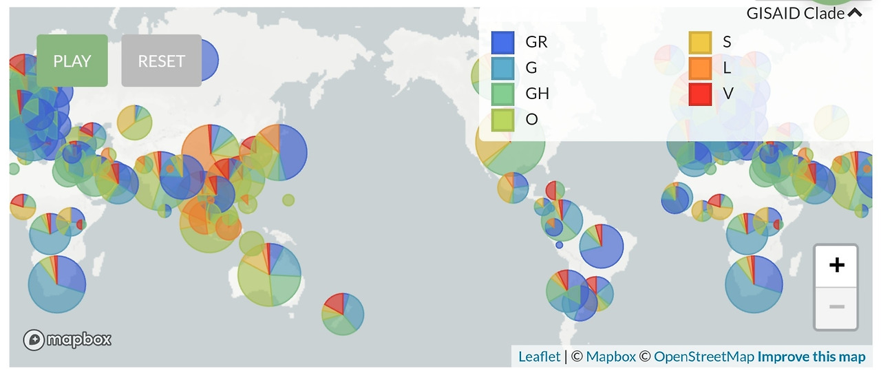 지구촌 각지로 증식되어 가는 코로나의 변종들. 다른 색은 다른 대륙, 다른 나라를 나타낸다.위의 게놈 계통 분류도는 이 영악한 바이러스는 벌써 일곱개의 변종으로 진화되고 있음을 보여주며 단일 백신으로는 처치 불가한 상황으로 치닫고 있음을 의미한다. Fyi, GISAID is a a global science initiative and primary source for genomic data of influenza viruses and the novel coronavirus responsible for COVID-19.