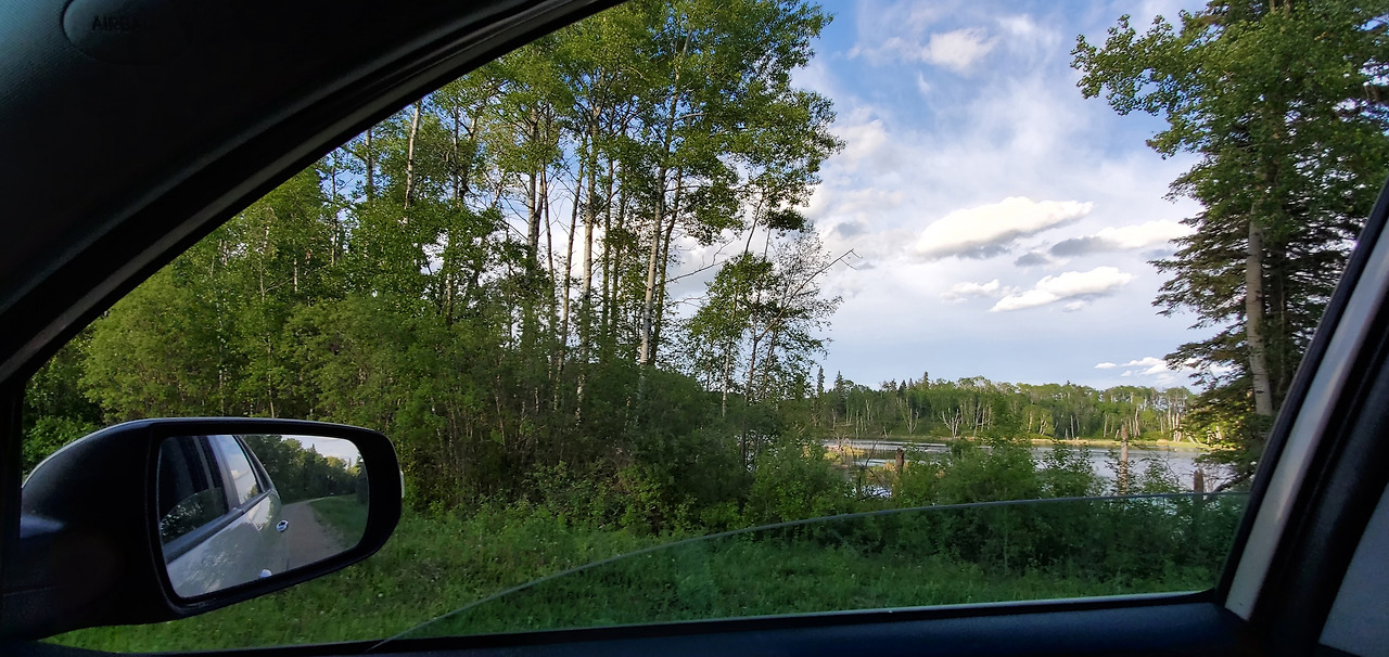집으로 돌아오는 길, 휙휙 보이는 하늘과 구름, 호수와 늘어선 나무들은 캐나다의 전형적 풍경을 보여 준다.
