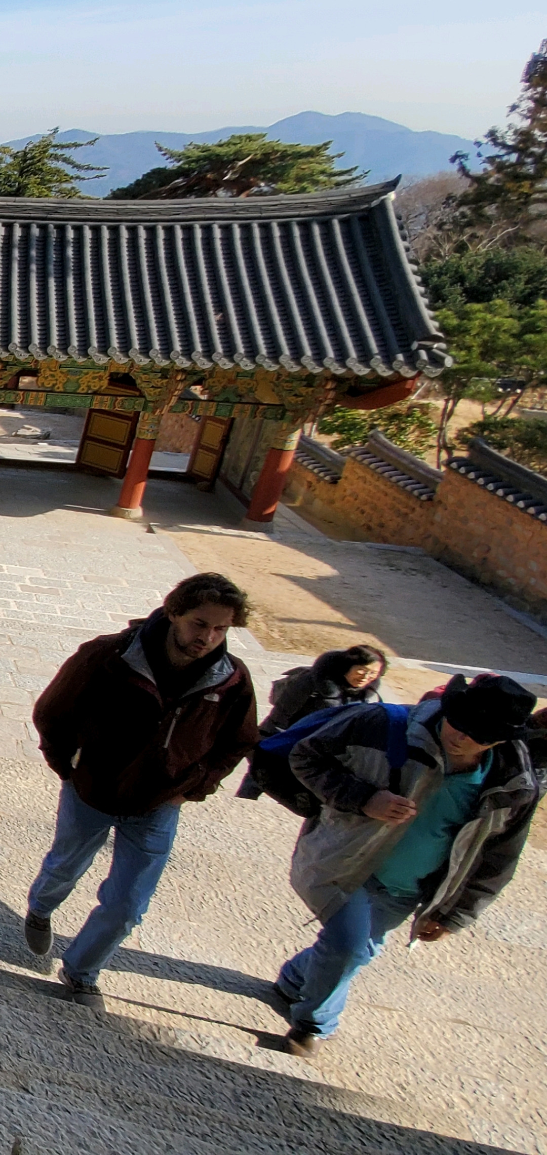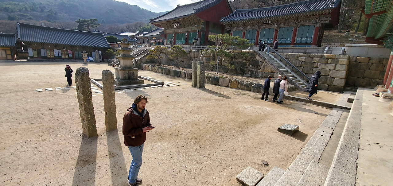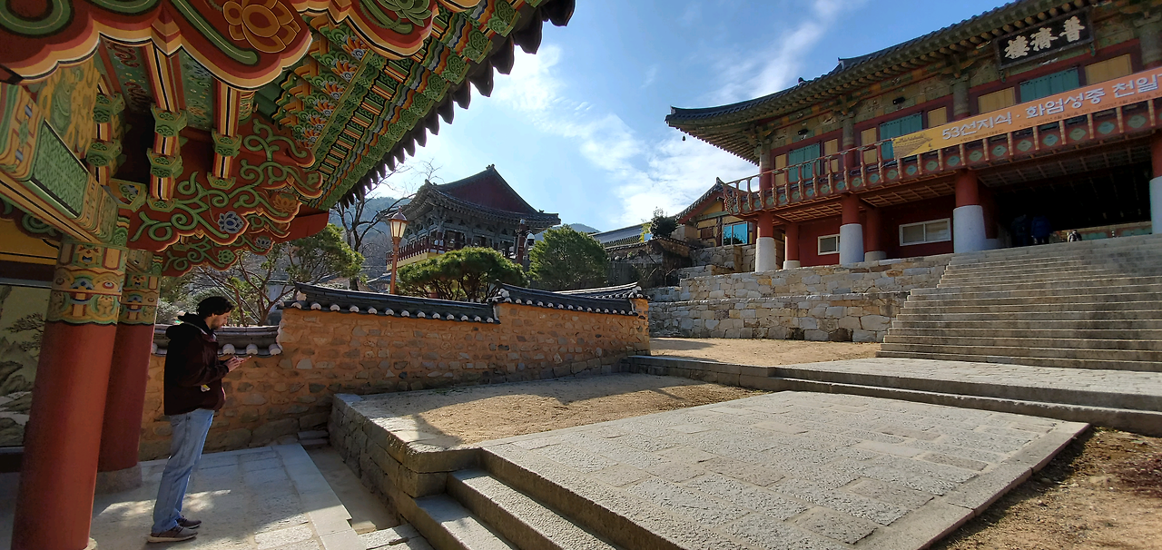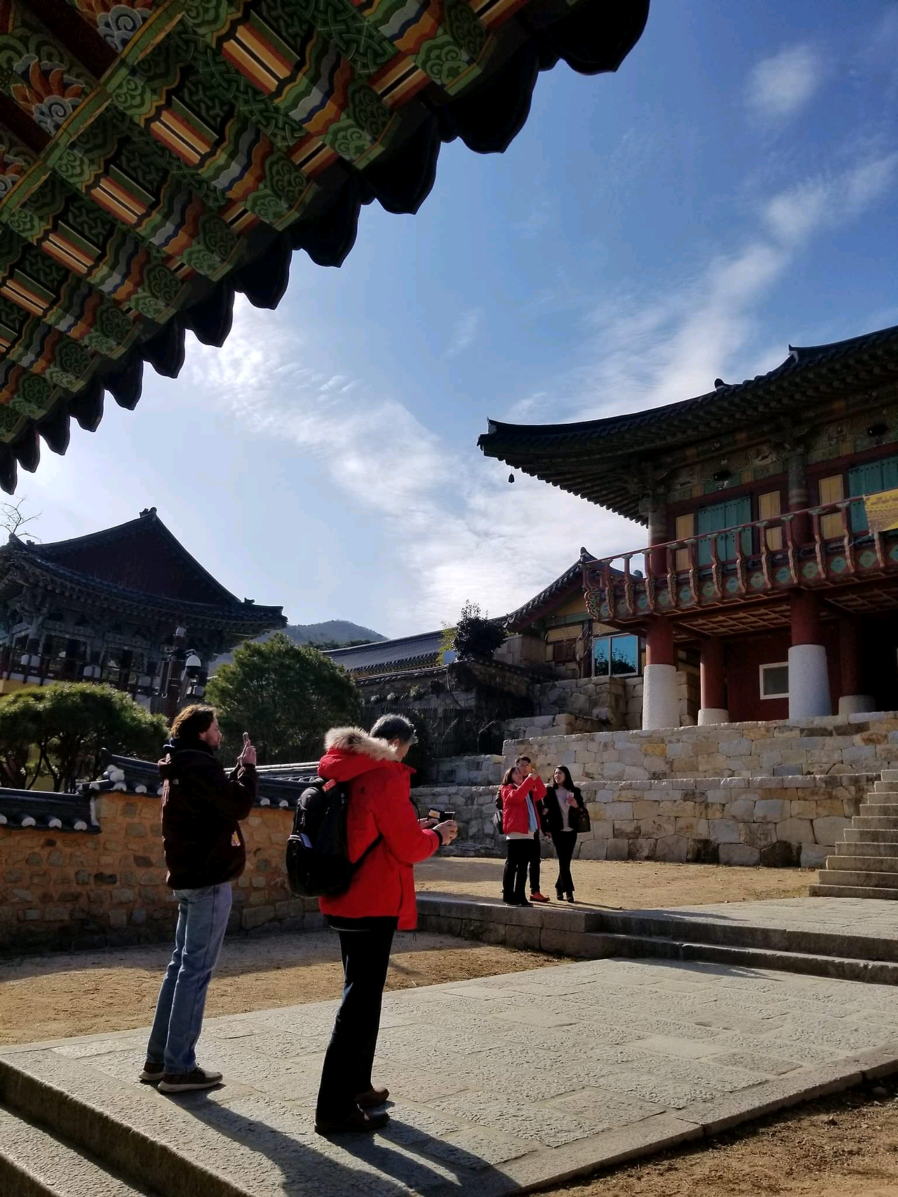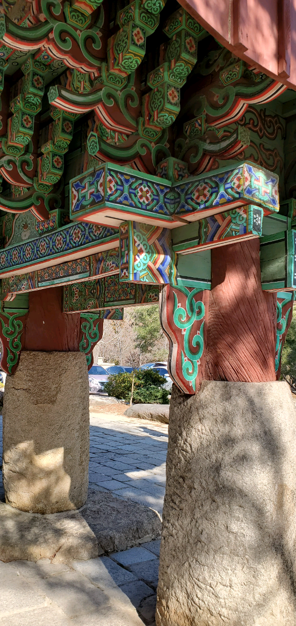 난 Canadian Maple Leaf Red 색 재킷을 입고 경내로 들어섰는데, 단풍나라의 붉은색은 단청의 붉은 색에 다름 아니었다. 이번 2020년 1월의 한국여행은 내가 사는 캐나다 동네 친구 짐과 그의 아들 제이든과 함께 했었다. 역병이 횡횡하기전의 마지막 한국, 마지막 부산 이었던 거다.