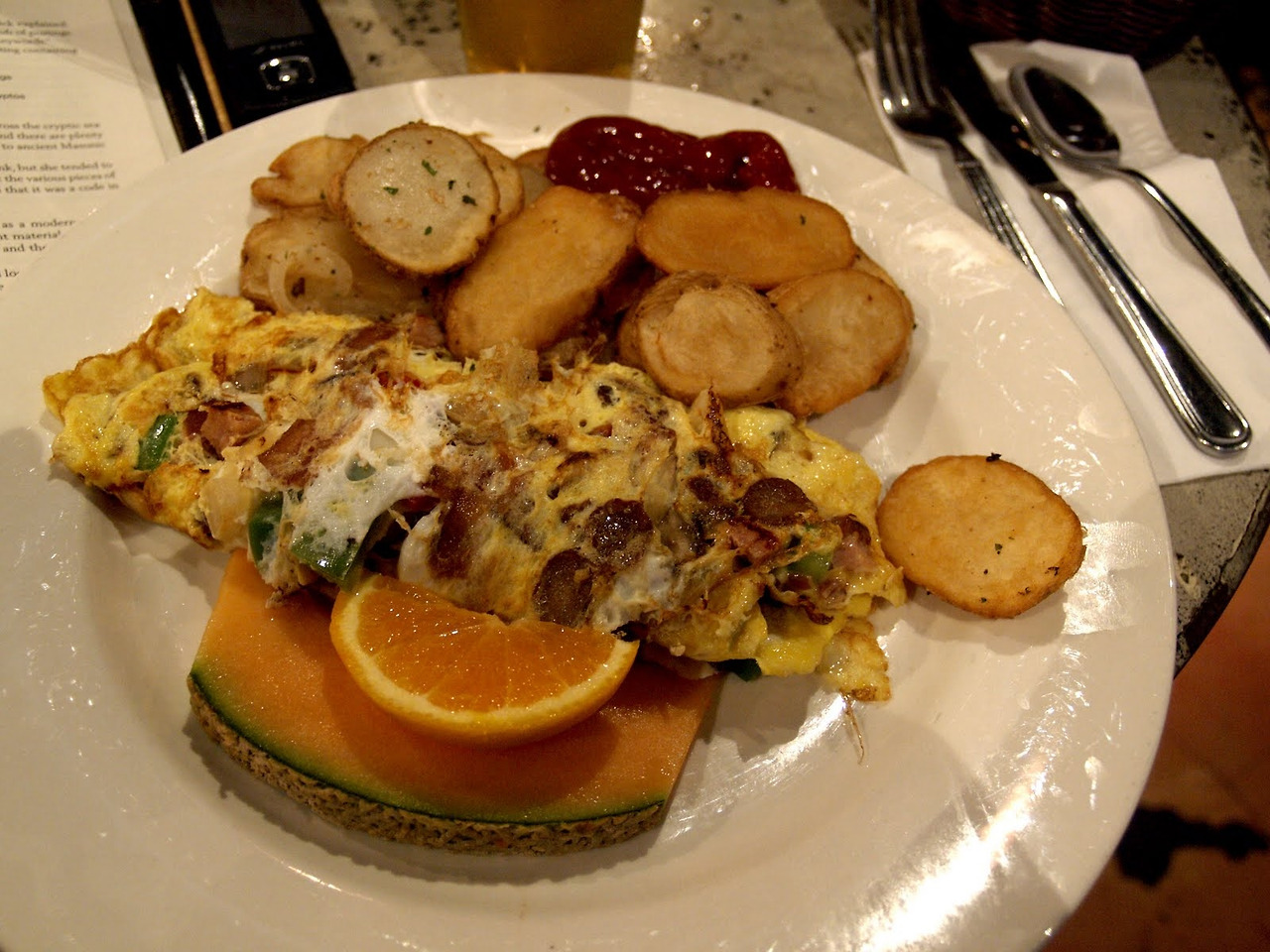 뒤이어 나온 오믈릿은 비주얼도 좋았고 기본적으로 오믈릿 속 야채들의 맛이 신선했다. 또 deep fried 감자도 더 고소한 것 같았고, 입가심하라는 오렌지 슬라이스 와 큼직한 허니듀 조각도 맘에 들었다.