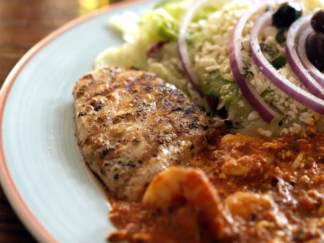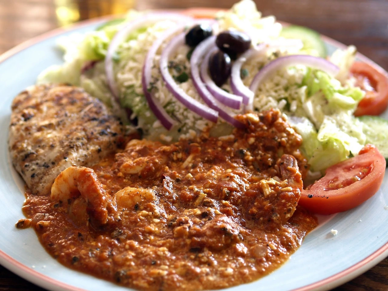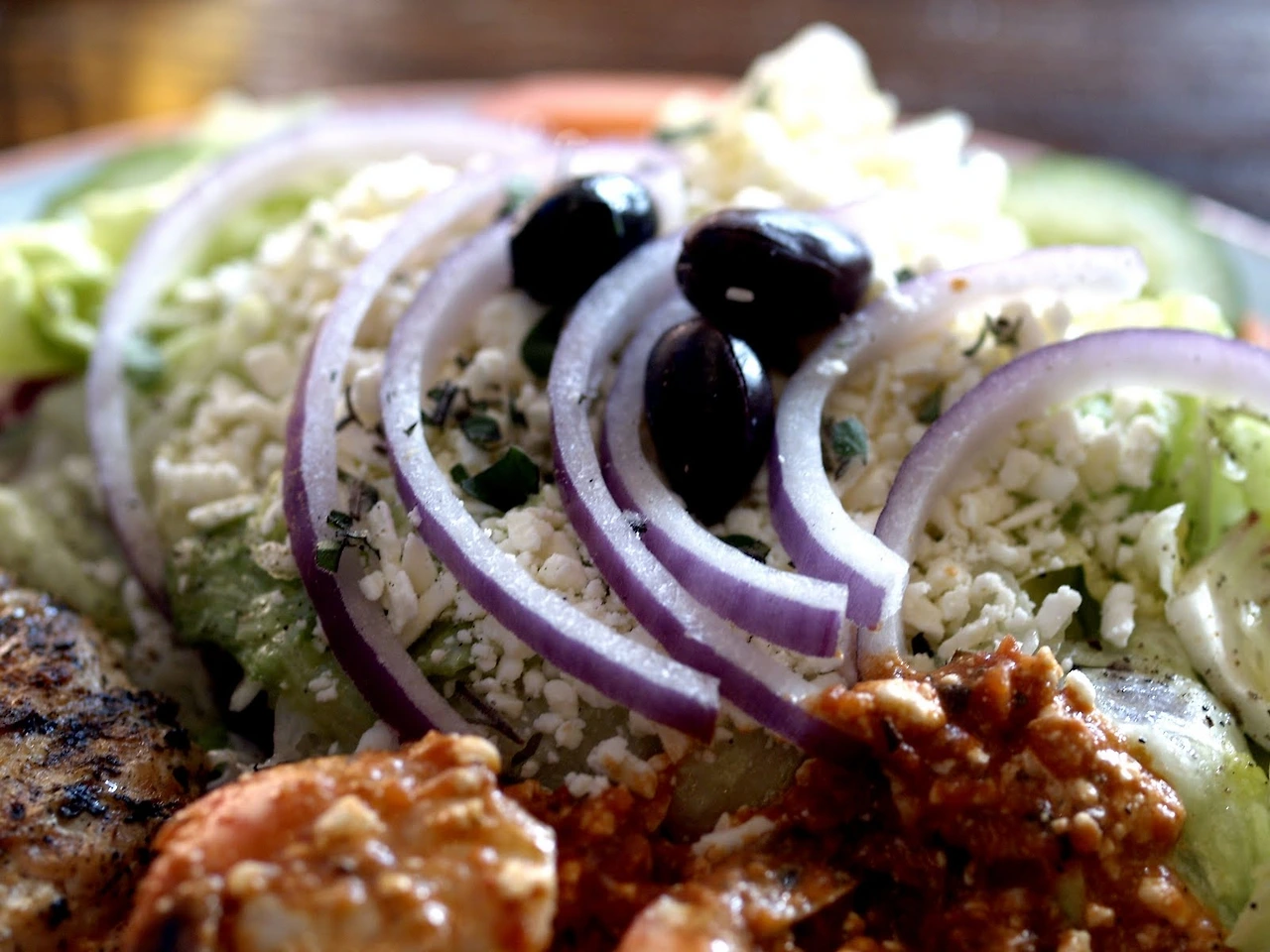 염소젖 치즈가 듬쁙 뿌려진 그리스 식 샐러드, 온갖 해물과 치즈, 그리고 허브가루로 무지 두터운 맛을 낼 것 같은 해산 물 소스가 뿌려진 새우, 그리고 이젠 익숙한 수블라끼 (Souvraki) 소스를 발라 구운 닭 가슴 살, 산토리니 건강식 이군.. 중얼거리며 매크로 렌즈로 갈아 끼운 후 사진을 좀 찍었다.