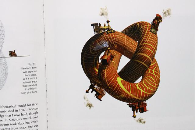 시간은 무한히 먼 처음에서 와서 무한히 먼 끝으로만 치닫는 일방통행이 아니 구불어질 수 도 있고 되돌아갈 수도 있다는 설명을 하면서 그린 기차 그림들이다. 얼마나 심오한 설명에 얼마나 깜찍한 그림인지! 사실 이 그림들을 보면서는 기네스가 무슨 맛인지 거대한 수탉의 허벅지가 무슨 맛인지도 모르고 먹었다.