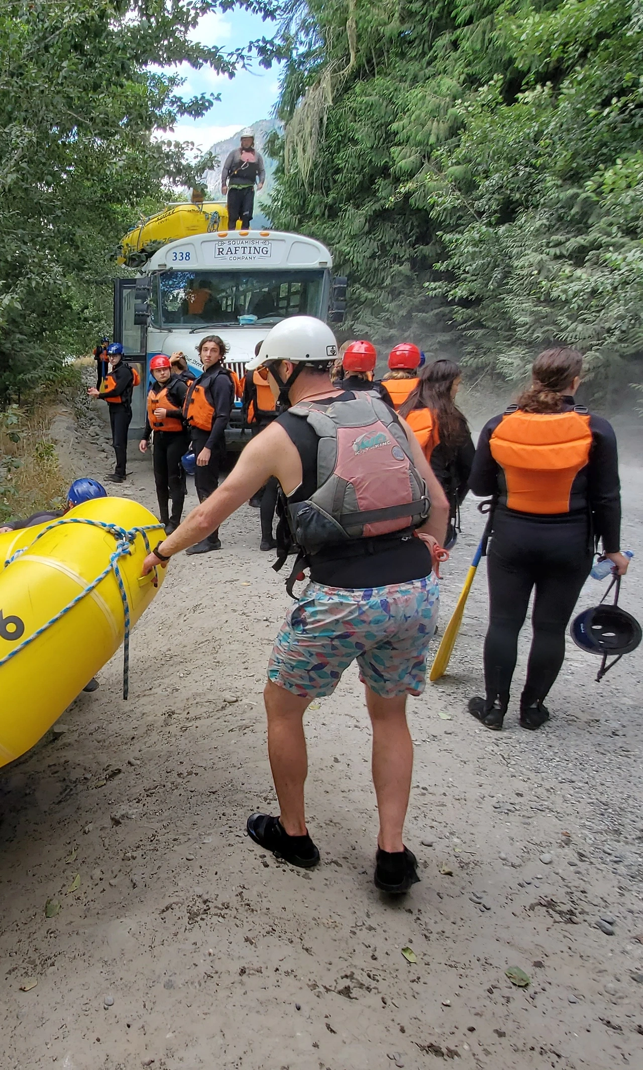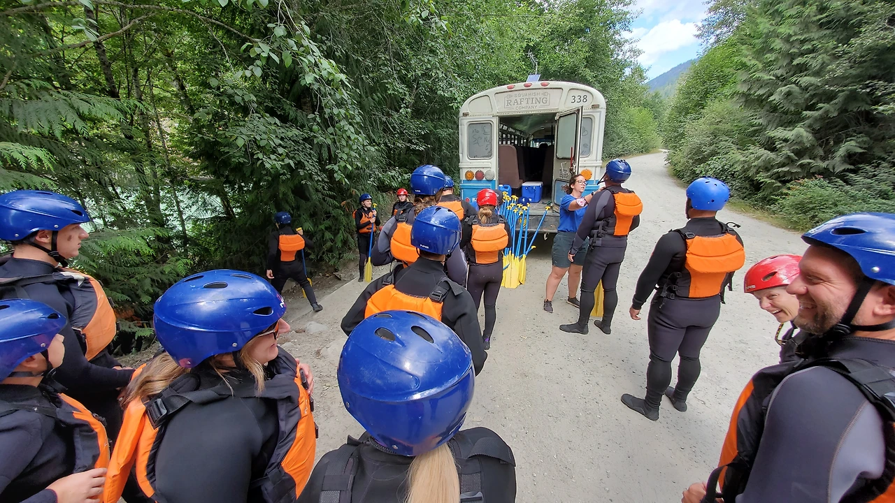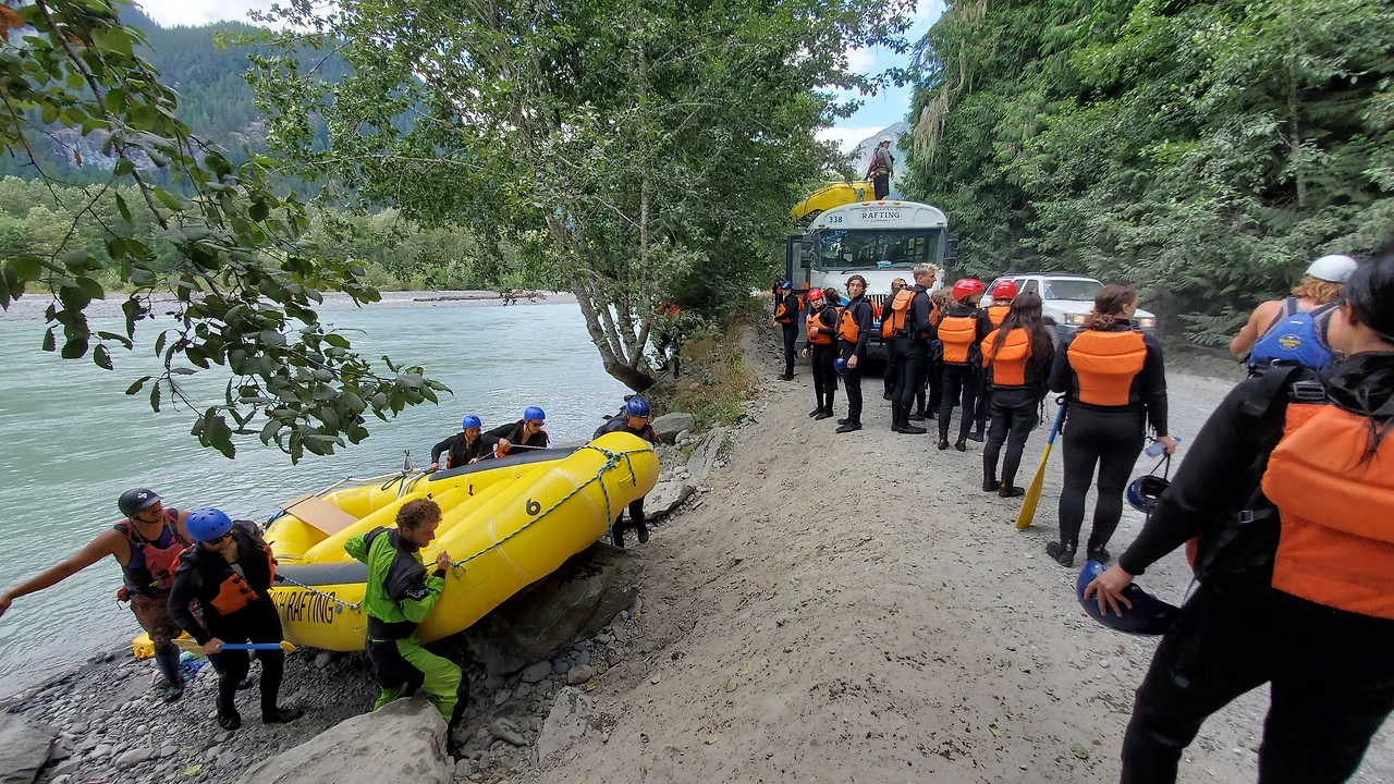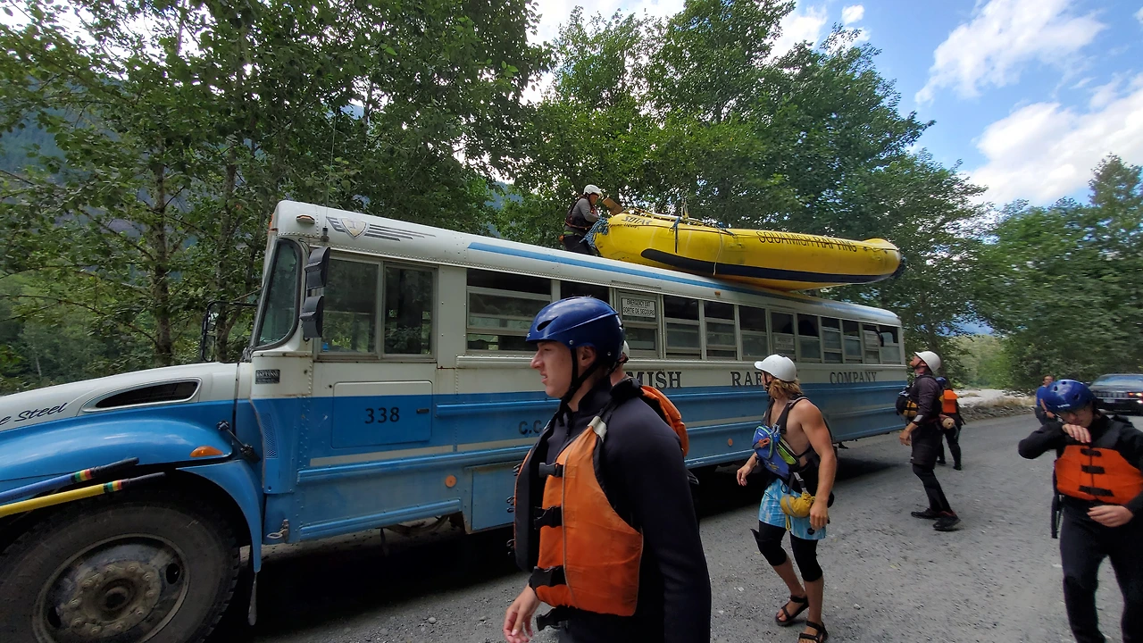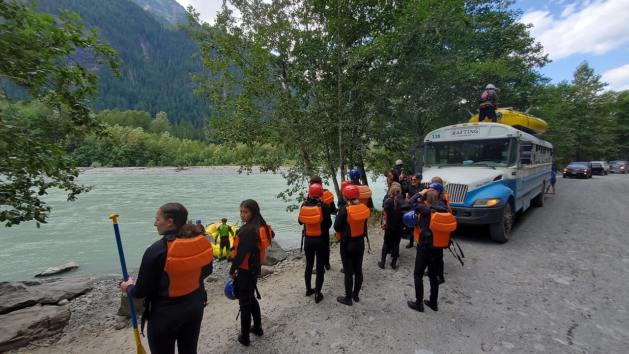 총 31명이 참가했는데 동양계 캐나디언은 우리 가족 셋 밖에 없었다. 십여명이 넘는 스탭들을 포함하여 오십여명 정도가 버스와 픽업 트럭에 타고 래프팅이 시작되는 엘라호 강 상류 지점까지 이동했다.