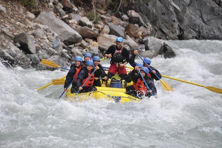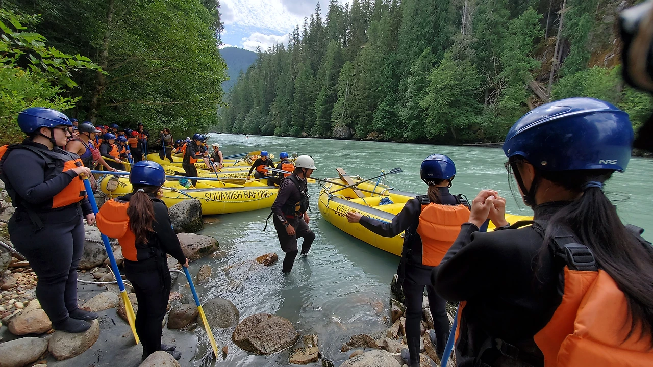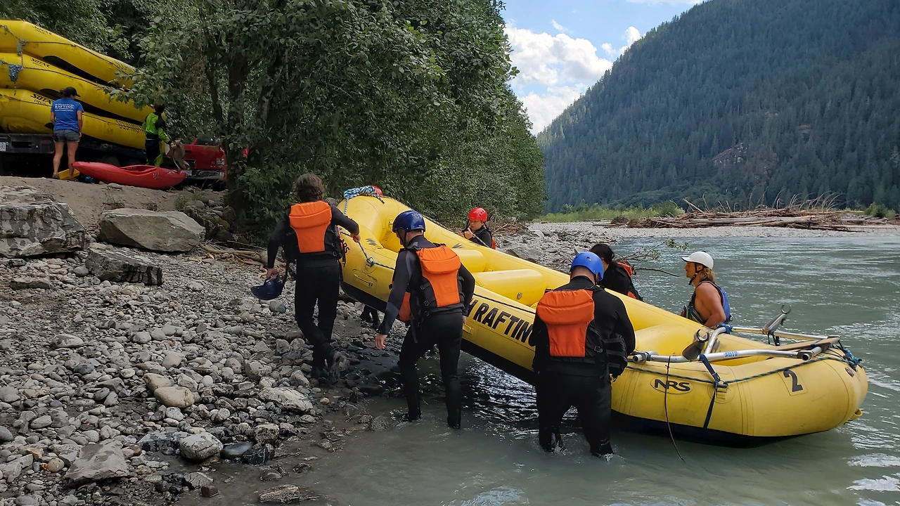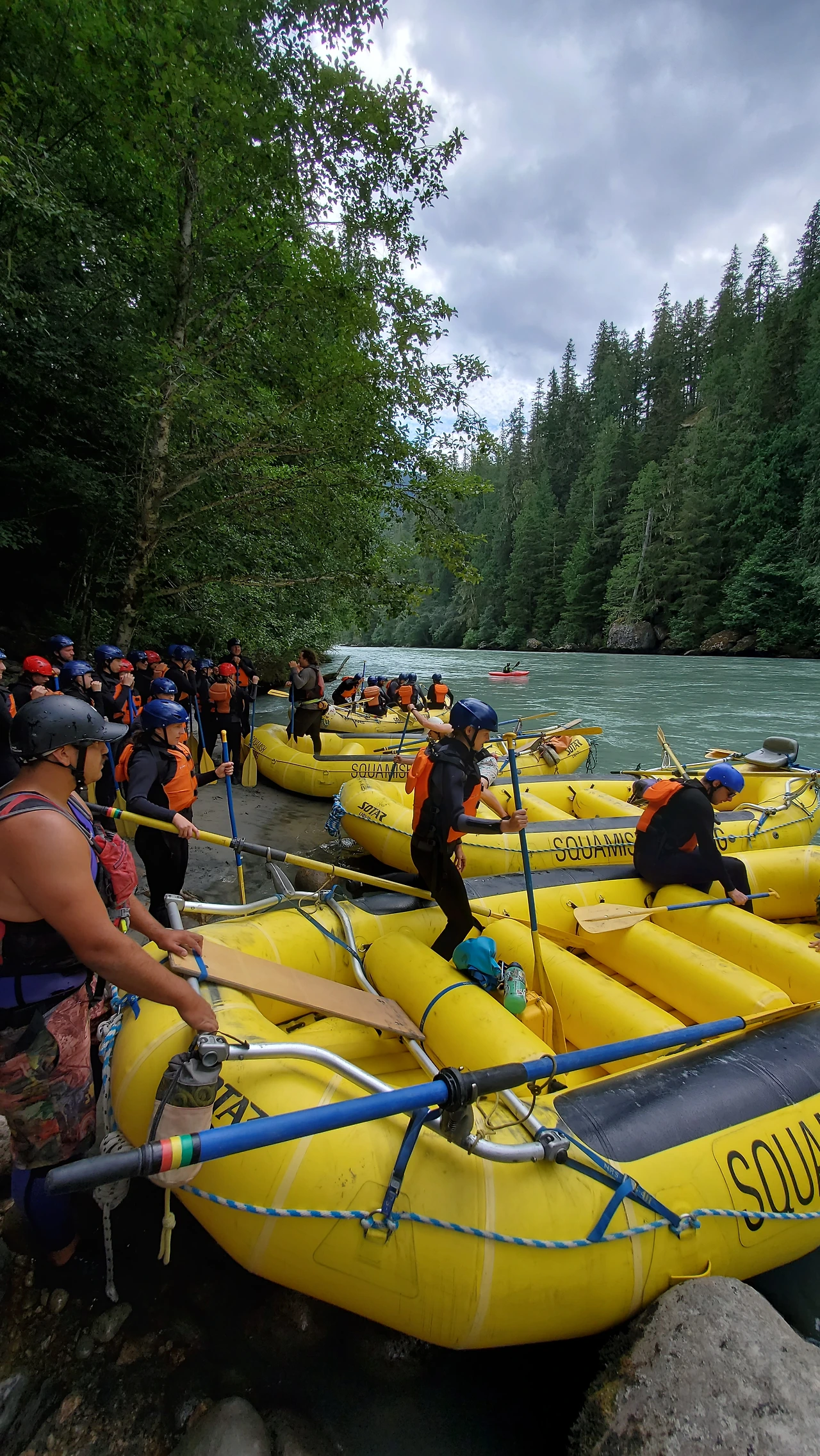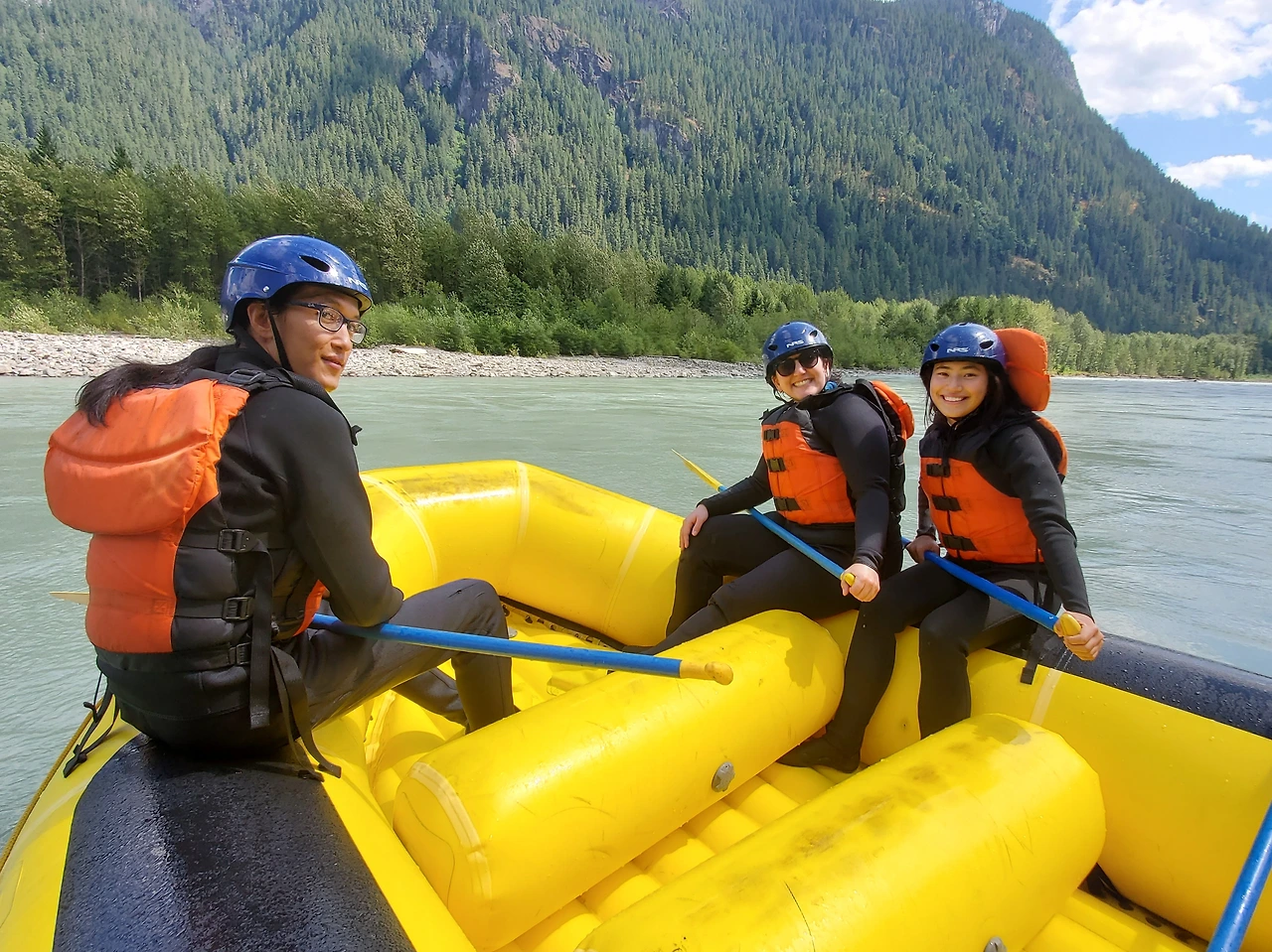 총 31명이 참가했는데 동양계 캐나디언은 우리 가족 셋 밖에 없었다. 십여명이 넘는 스탭들을 포함하여 오십여명 정도가 버스와 픽업 트럭에 타고 래프팅이 시작되는 엘라호 강 상류 지점까지 이동했다.