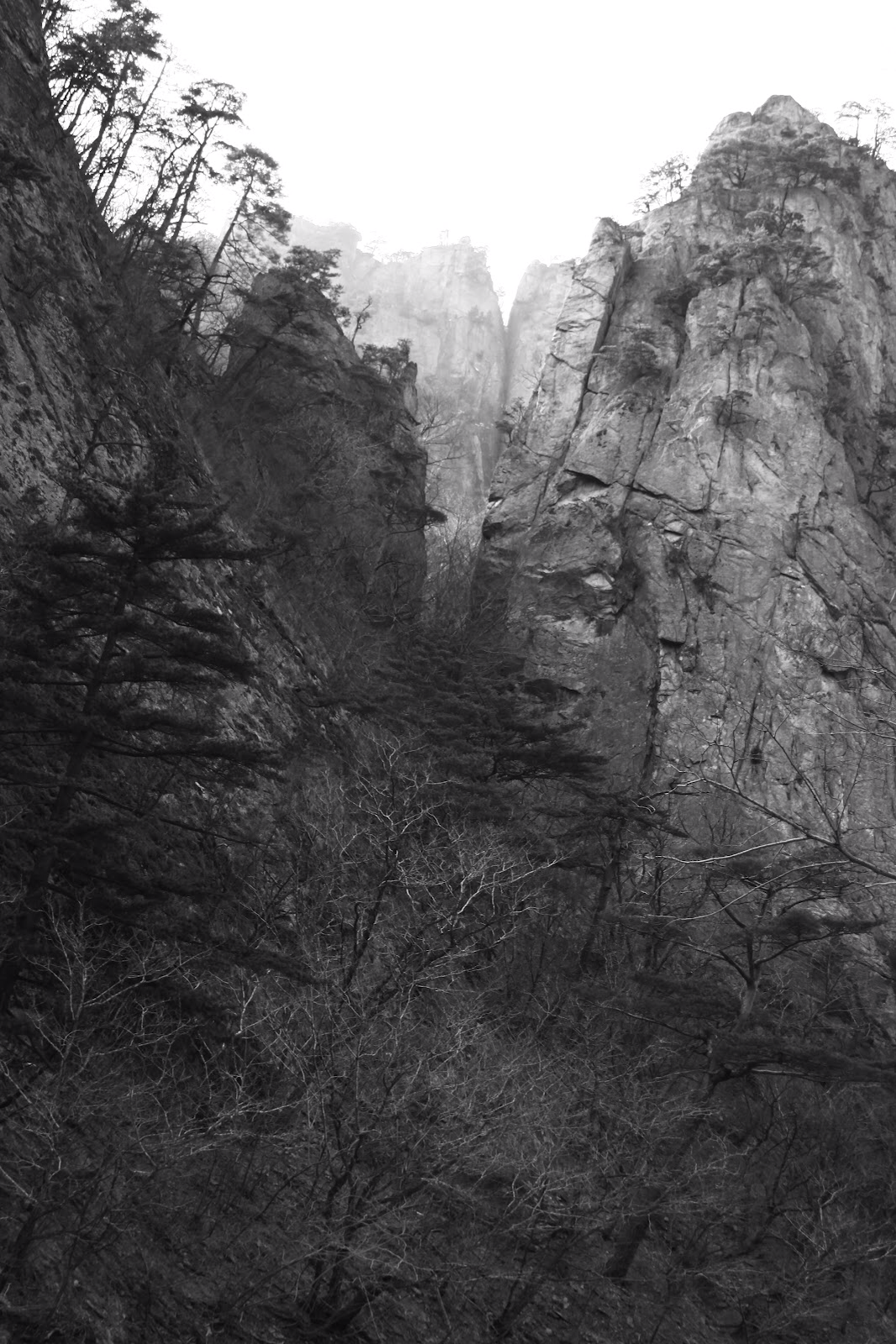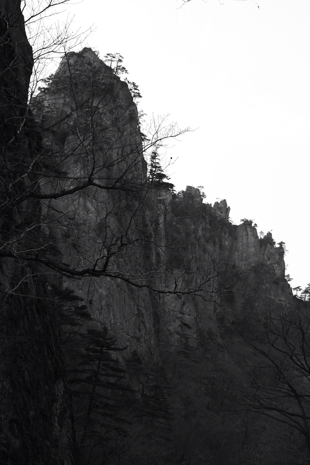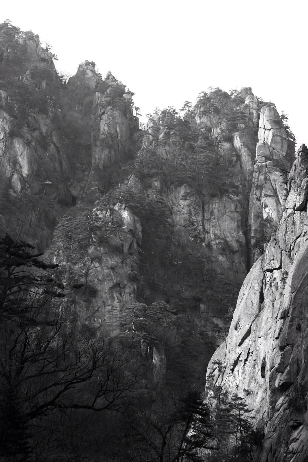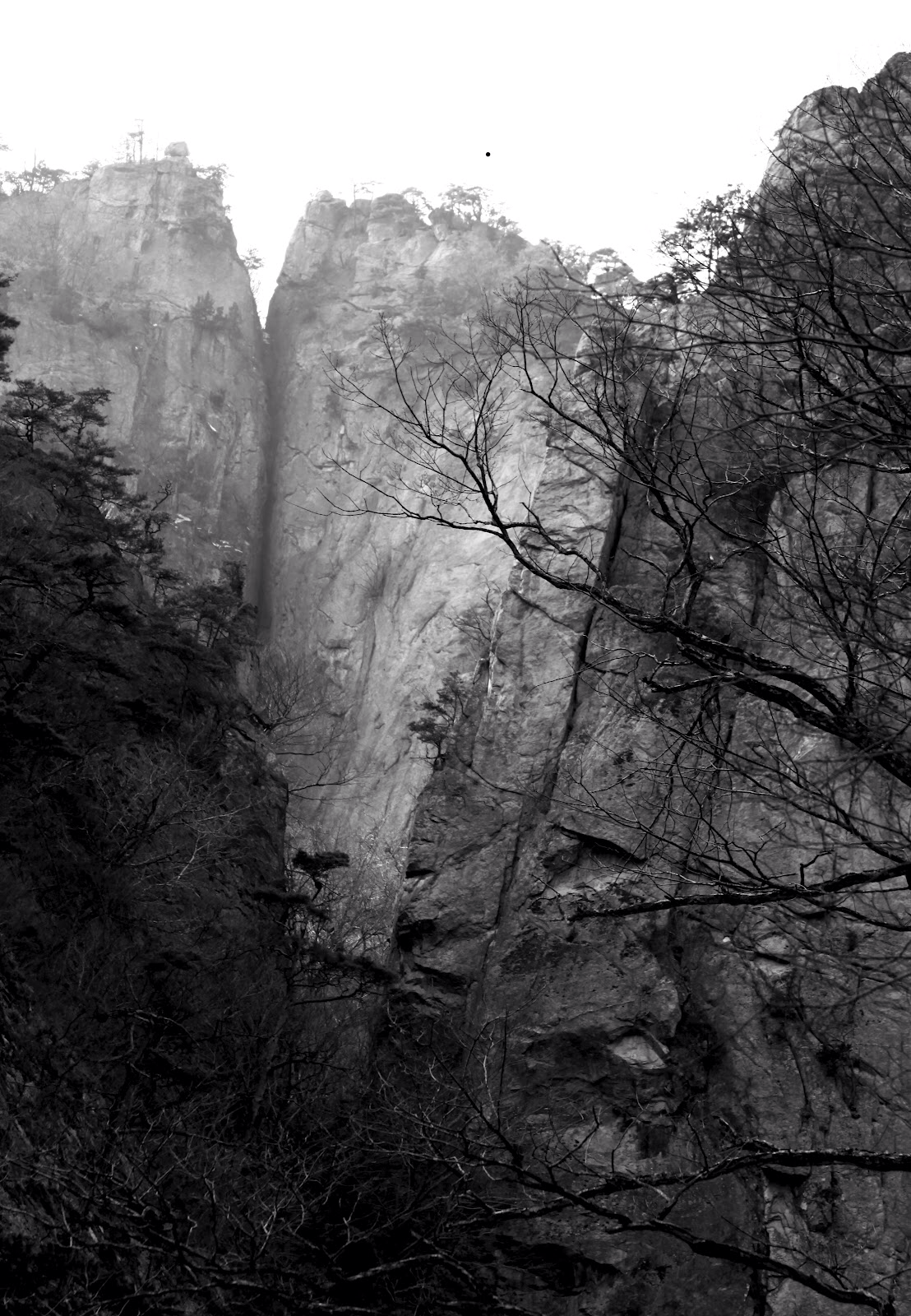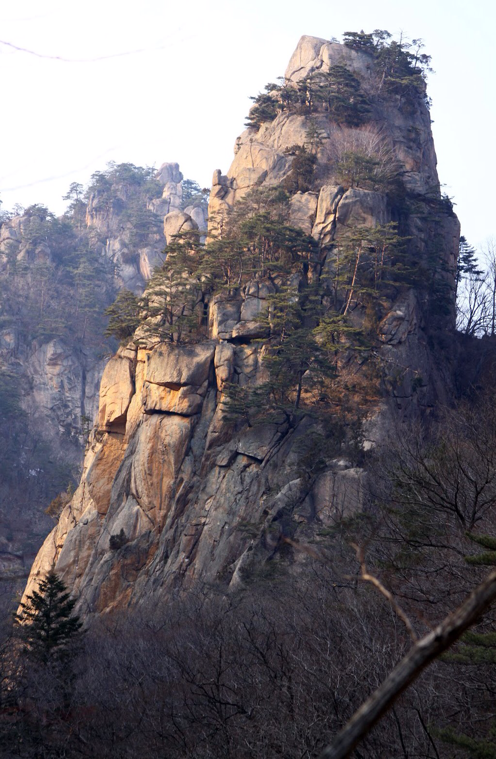 산세와 지질적 구성이 어찌 이리 드라마틱 할까. 암벽 사이사이, 심지어 그 정상에 까지 자리 잡은 소나무들은 정말 대단해. 기막힌 조크처럼 터무니없는 생명력을 보여줌은 물론 그 의연한 늘 푸르름은 정말 비현실적이다. 칭송받아 마땅하다. 백 년을 넘어 천년을 넘어.