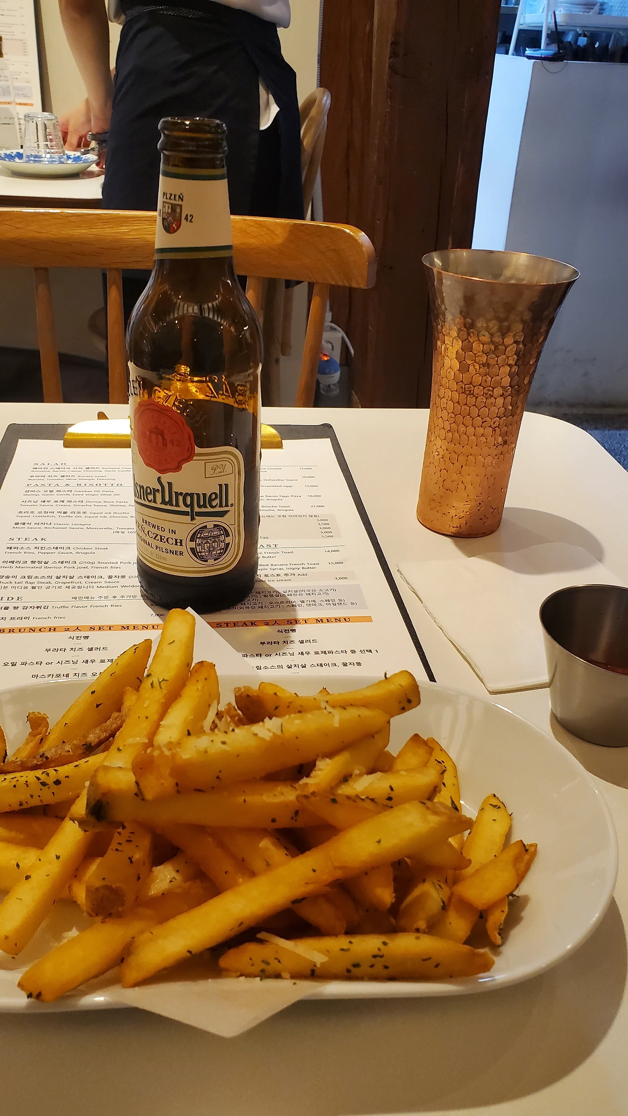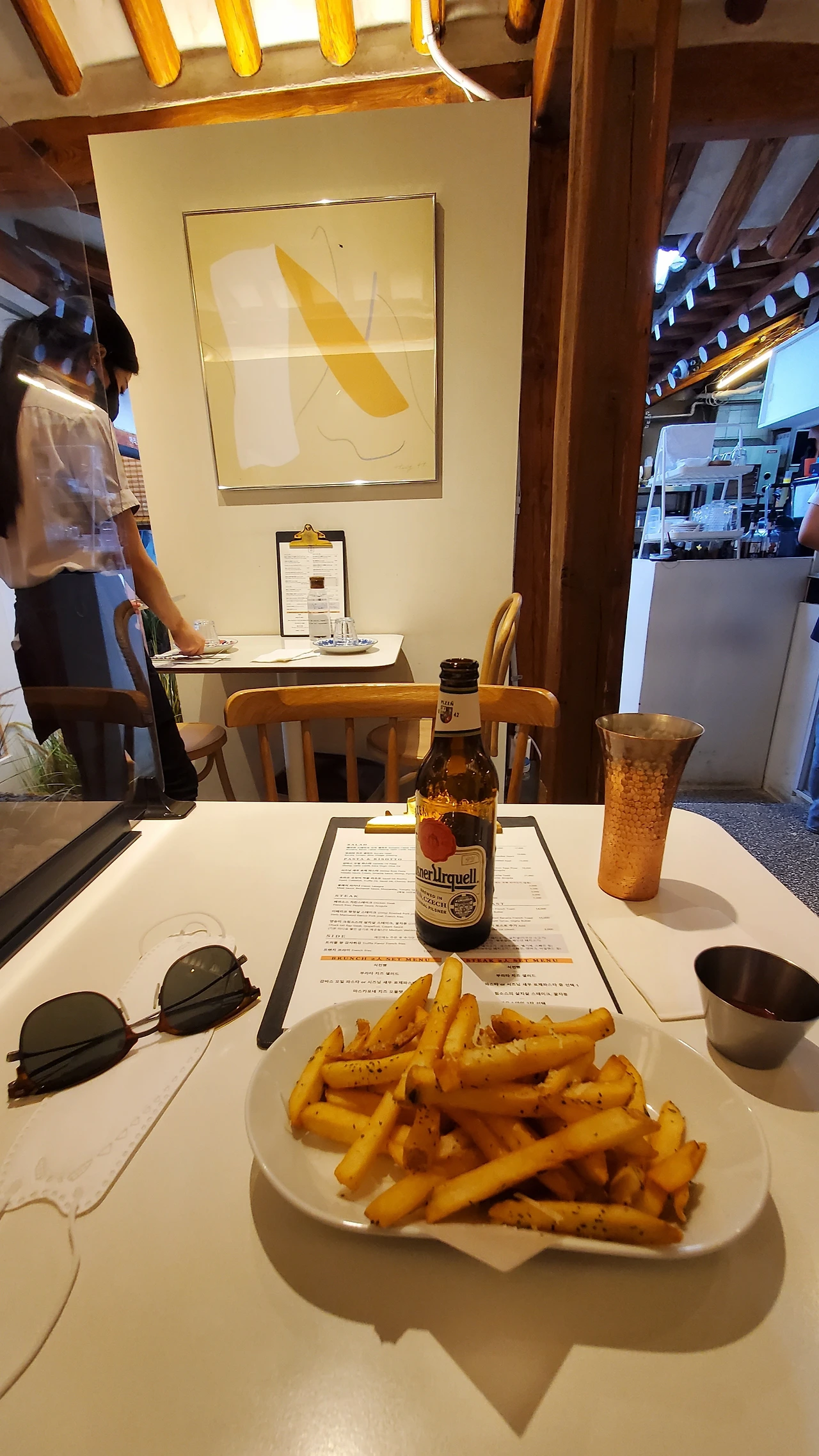 목이 말라 맥주를 마시다 배가 고파 시킨 프렌치프라이. 이렇게 제대로 만든 french fries는 처음이라는! 거의 매일 감자튀김을 먹어대는 캐나다나 미국에서도 이렇게 맛있게 하는 곳은 아주 드믈다. Awesome!