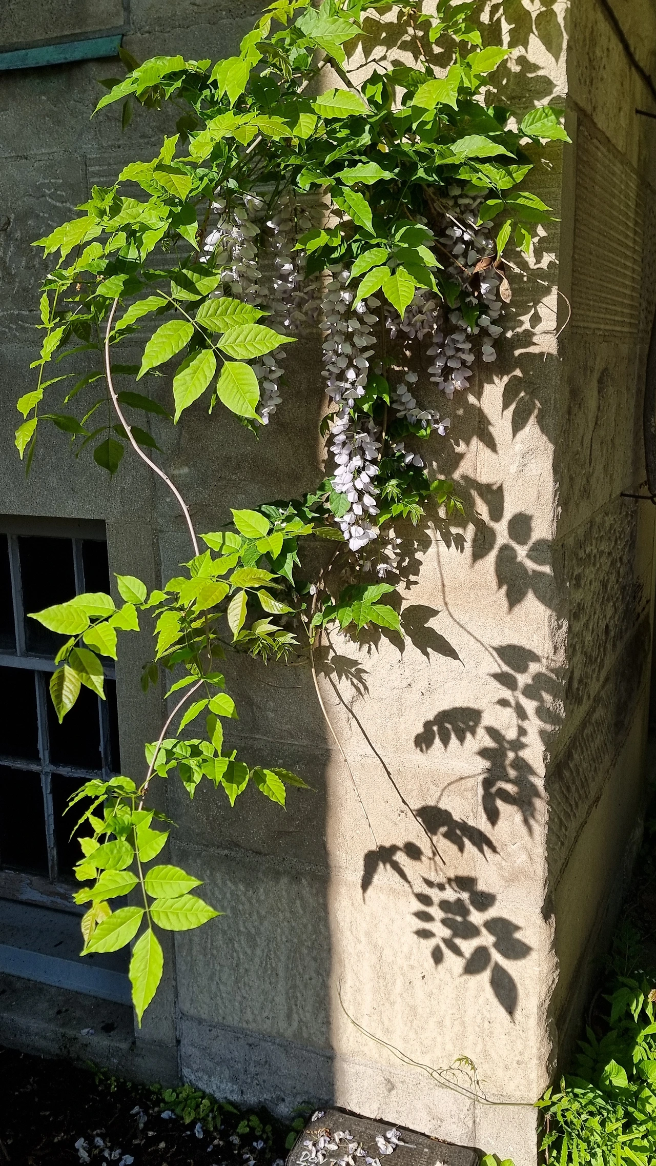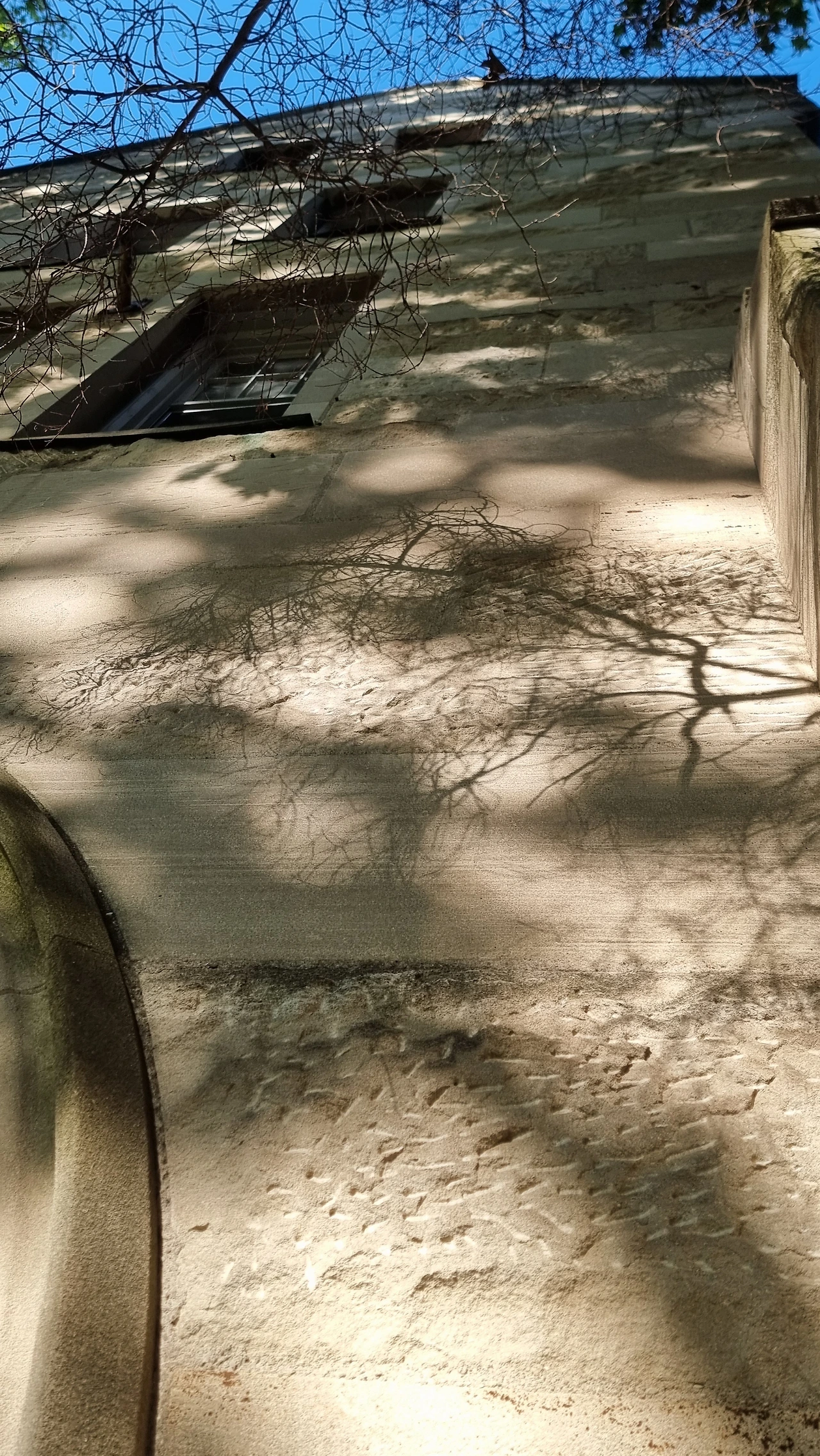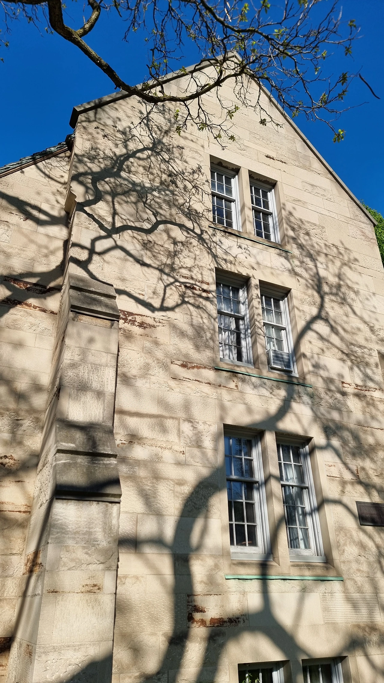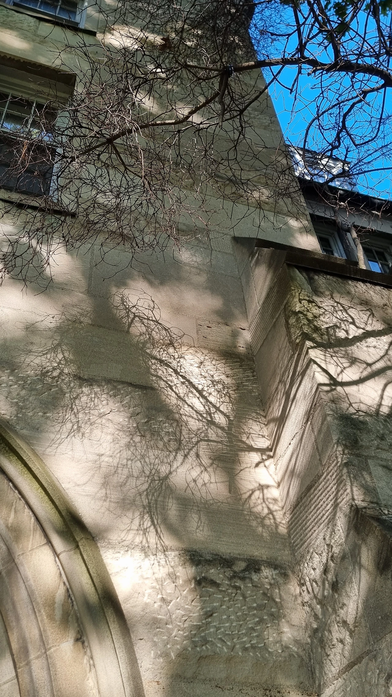 Looking at the facade inscribed with a delicate pattern of shadow of tree trunks makes me happy also.