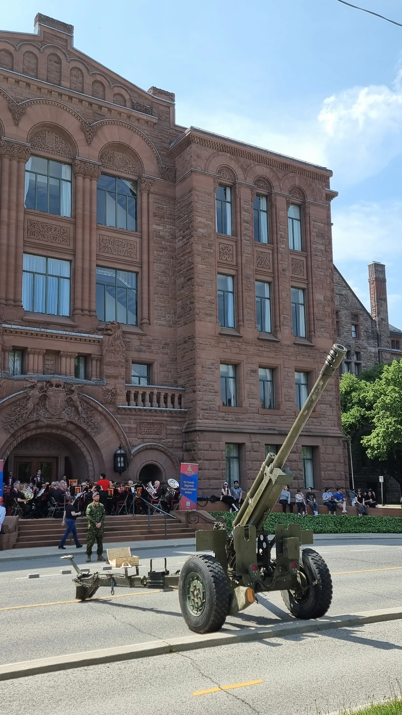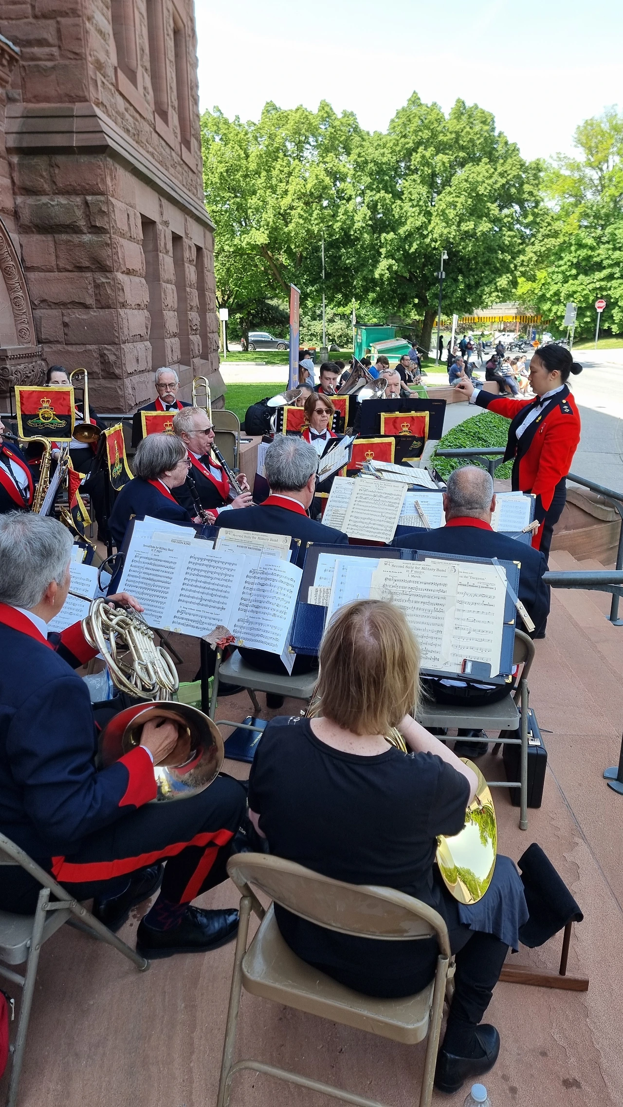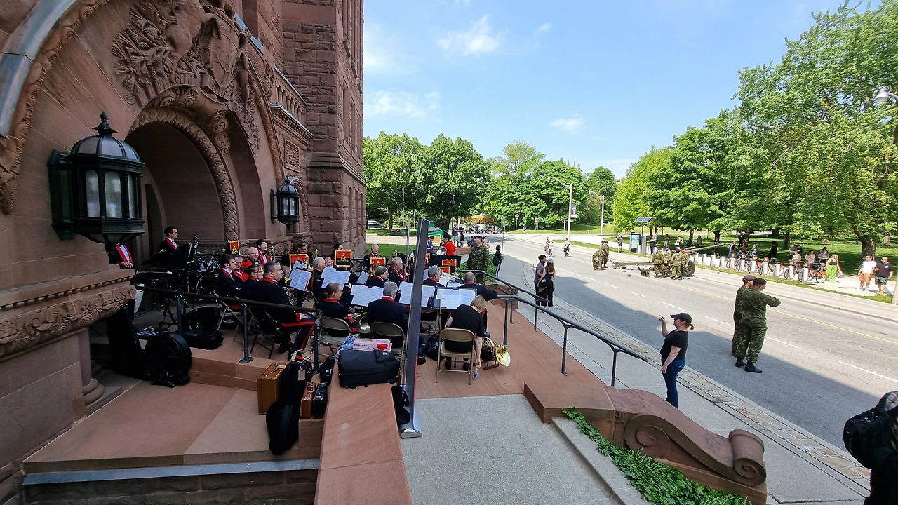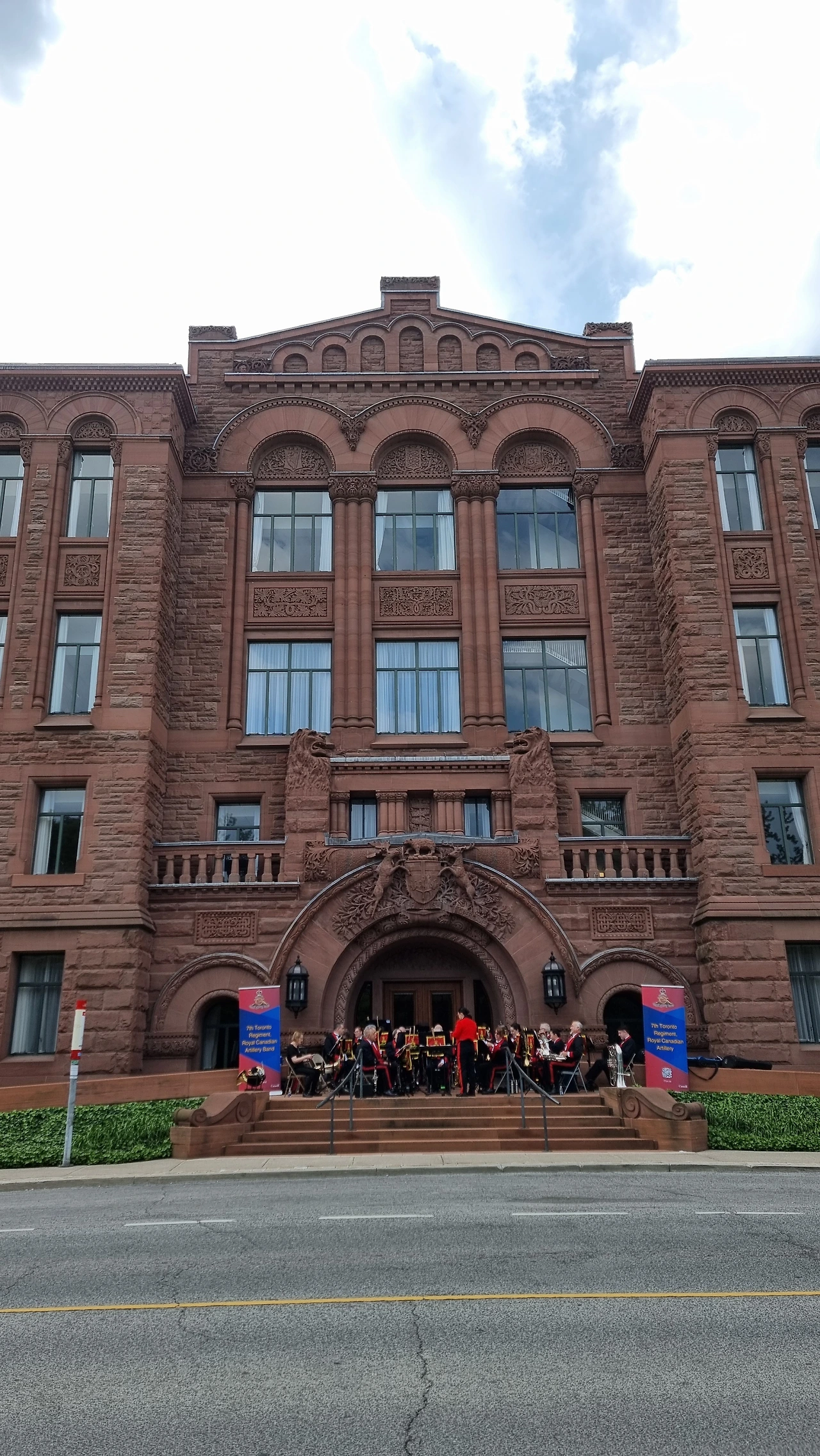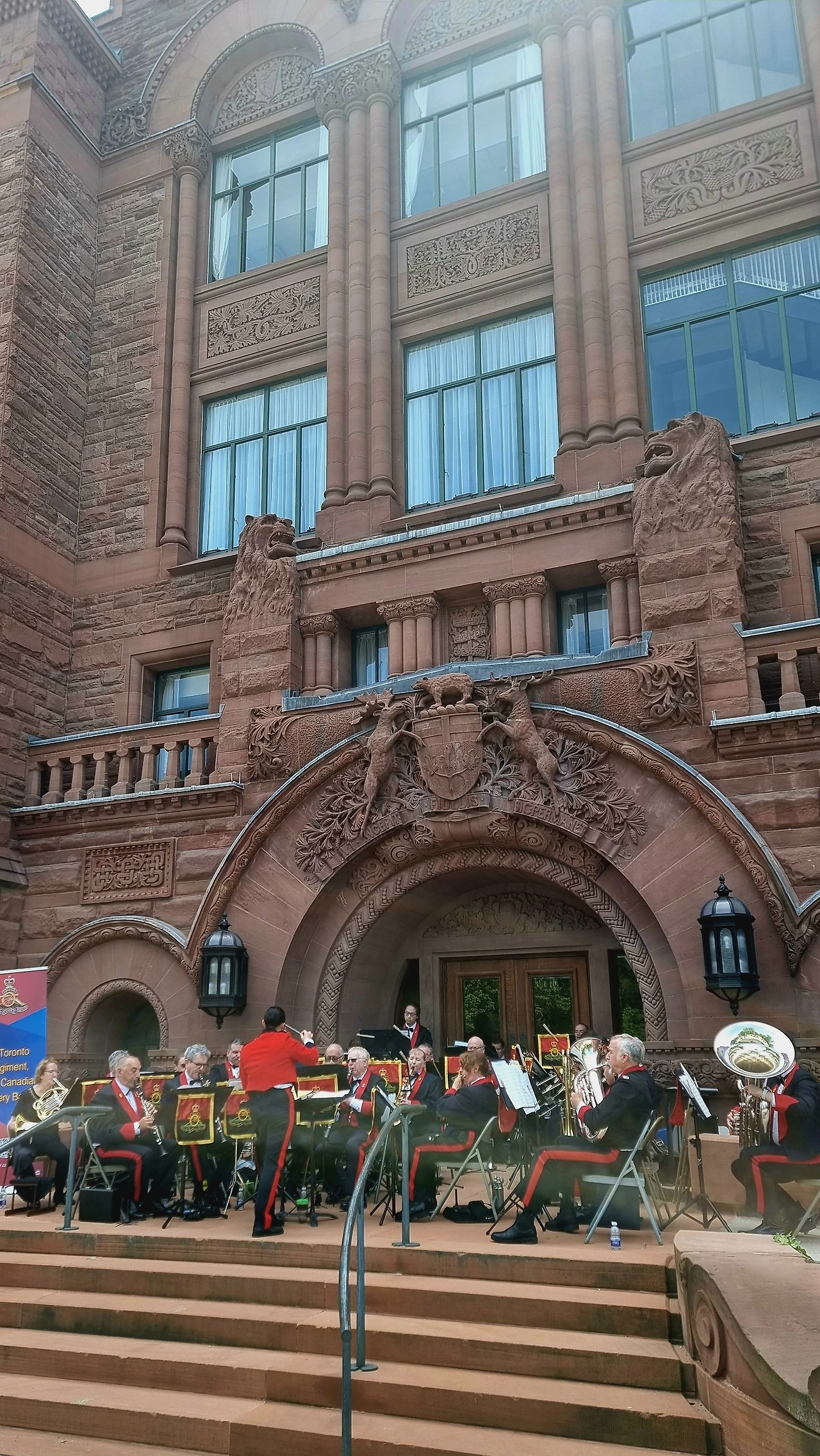 토론토 다운타운 중심에 위치한 퀸즈 파크, 사실상 빅토리아 여왕을 기념하는 파크,를 산책하는데 어디선가 튜바 소리가 들리는 듯했는데 내 귀가 맞았다. 자세히 보니 brass 중심의 한 무리의 밴드가 온타리오 주의회당의 한 건물 앞에서 연주 준비를 하고 있었다. 캐나다 군의 왕립 제7 포병 연대의 군악대였다. 헐.. 이런 횡재가..